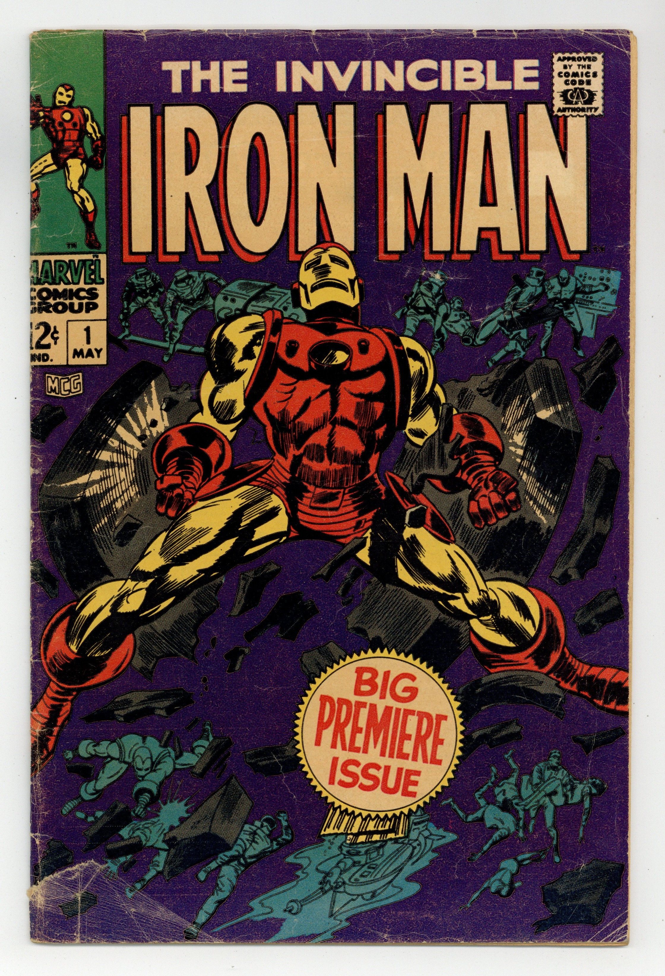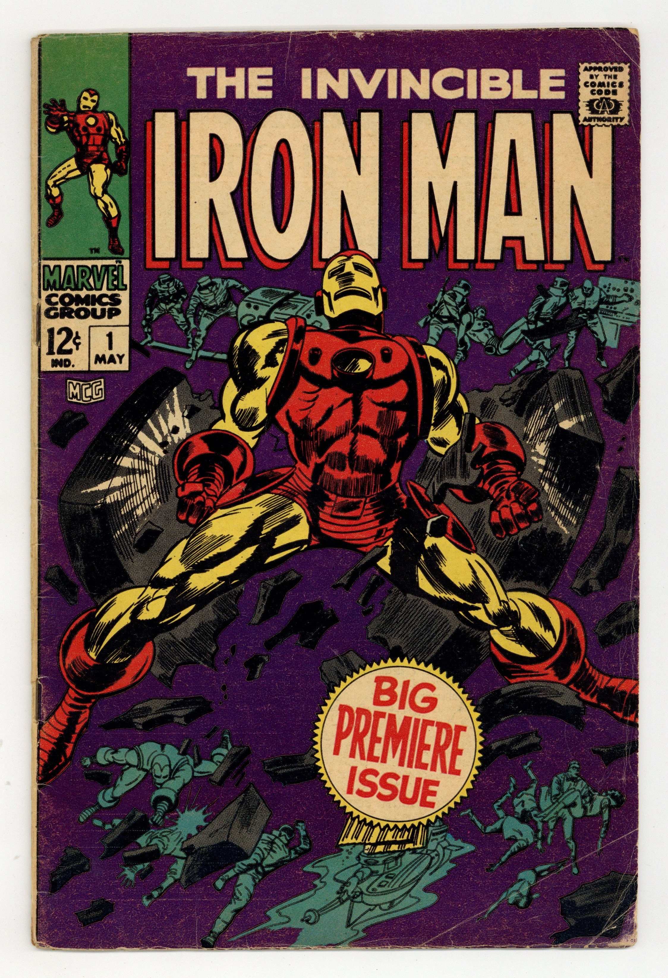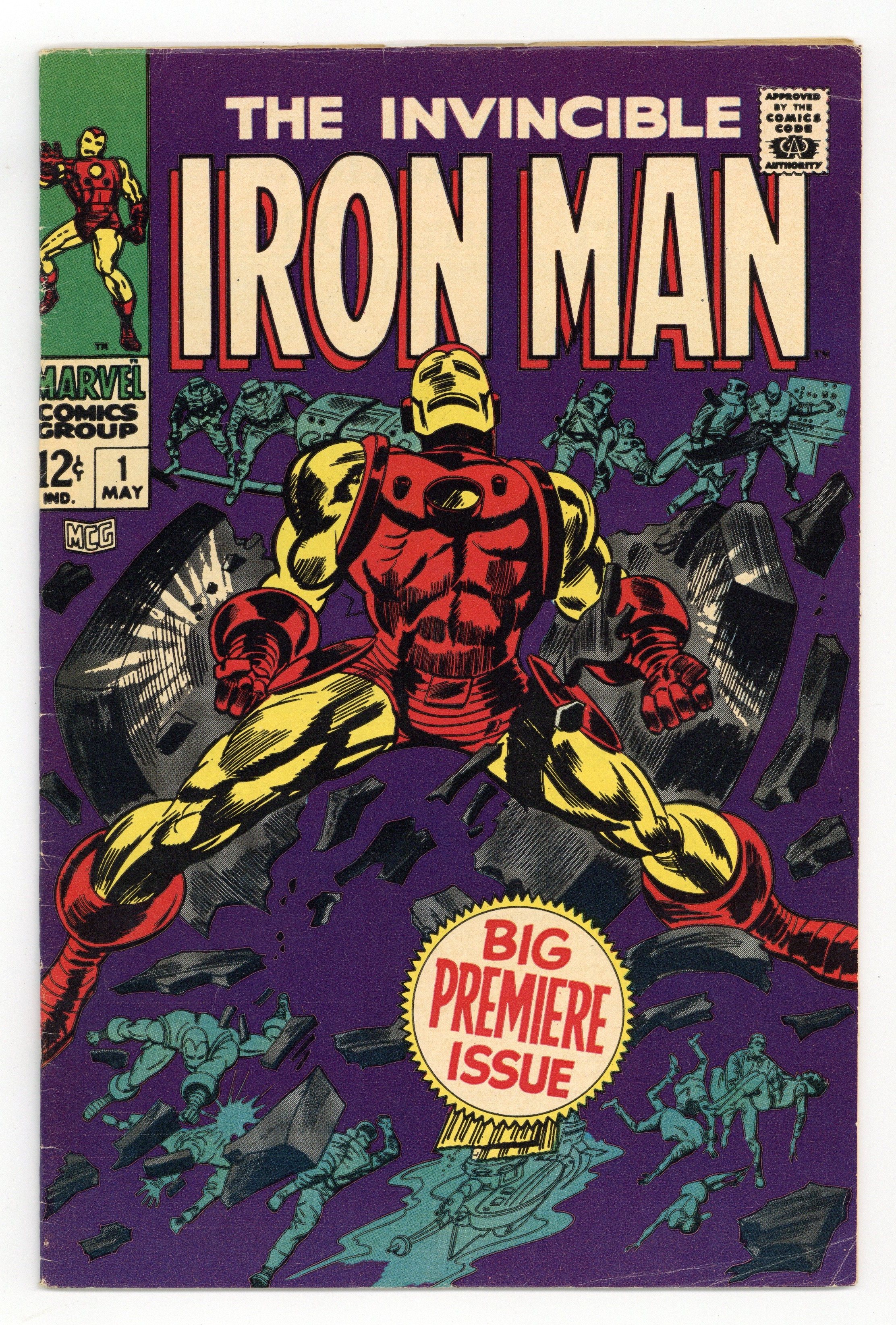 Cover pencils by Gene Colan, inks by Mike Esposito. "Alone Against AIM," script by Archie Goodwin, pencils by Gene Colan, inks by Johnny Craig; Iron Man is captured by A.I.M using a suction beam and trapped in a submarine by orders of Mordius; Meanwhile A.I.M. soldiers are gloating about how they have sunk The Maggias gambling ship and destroyed their leadership; The Golden Avenger is knocked out by gas while back on the sinking Maggia ship Jasper Sitwell is evacuating the passengers; Sitwell stumbles upon Whitney Frost whom he recognises from Stark Industries as one of Tonys admirers; Sitwell rescues Frost and they are taken aboard a S.H.I.E.L.D. helicopter where Nick Fury awaits; When alone Frost reveals herself to be The Big M, leader of The Maggia, and her plan to use Sitwell to learn the secrets of Stark Industries. Continued between Iron Man and Sub-Mariner #1 and Avengers #51. "The Origin of Iron Man," script by Archie Goodwin, pencils by Gene Colan, inks by Johnny Craig; An abridged retelling of Iron Man's origin from Tales of Suspense #39. 36 pgs., full color. $0.12. Cover price $0.12.