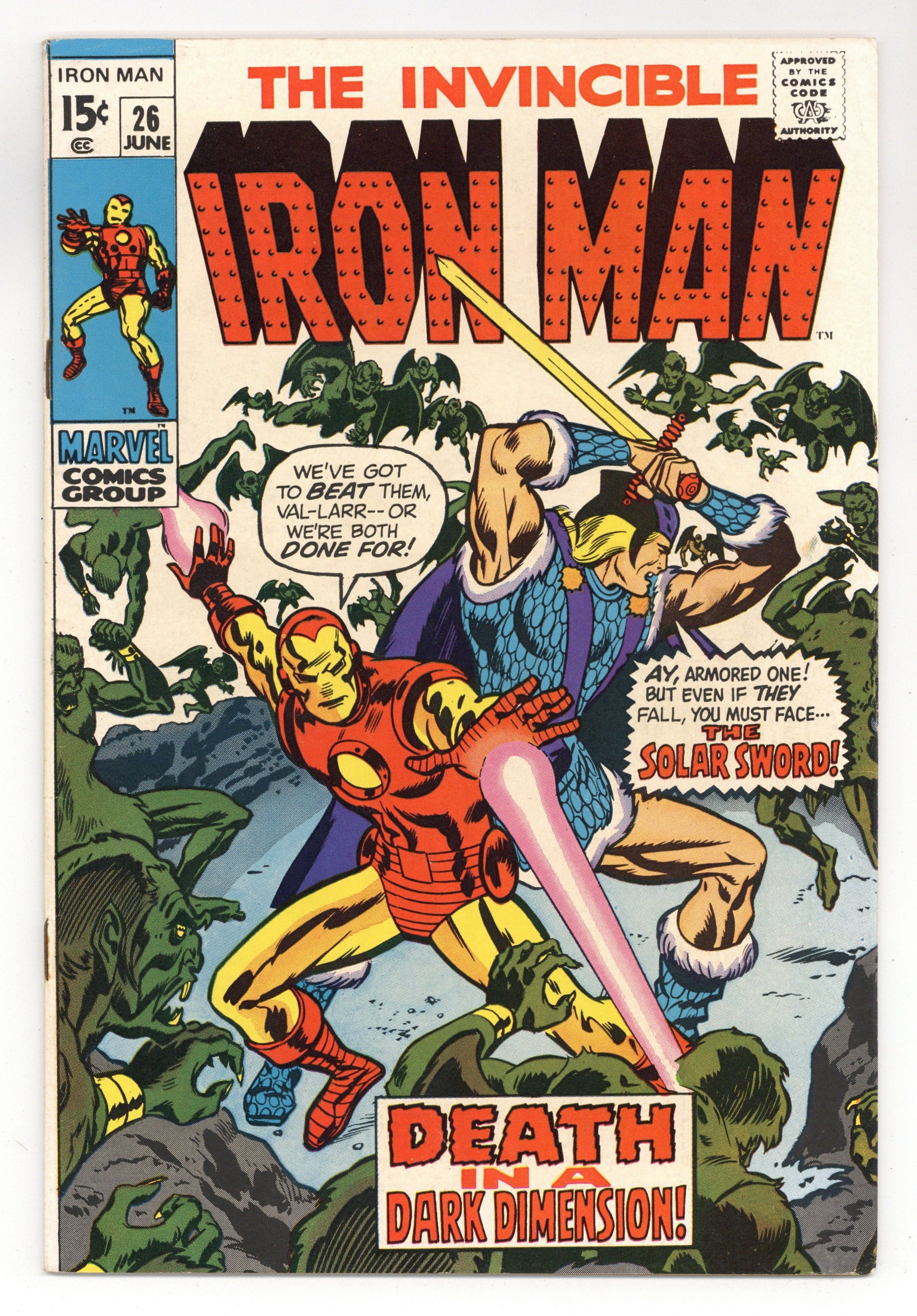 Tags: Marvel Legacy Numbering: Iron Man (part 26), Iron Man$11.00"Duel In A Dark Dimension!" Story by Archie Goodwin. Art by Don Heck and Johnny Craig. The Collector wants to add the Freak (aka Happy Hogan) to his intergalactic collection! So the ancient elder of the universe abducts Pepper Hogan to lure her husband and Iron Man to his spaceship. After the Collector captures Happy, he proposes a trade to Iron Man. If Shell-head can obtain the solar sword from the dark dimension, the Collector will release both Pepper and Happy. Will the golden avenger betray Val-Larr, the owner of the solar sword, in order to save his friends? 32 pages Cover price $0.15.