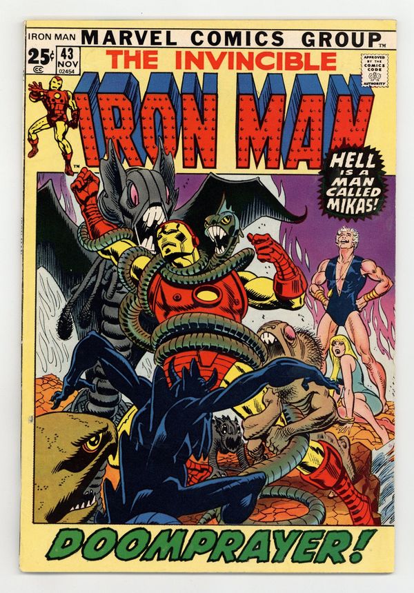 Giant-size issue. 25ยข cover price. "Doomprayer!" Story by Gerry Conway. Art by George Tuska and Jim Mooney. Cover by Gil Kane. The situation is dire indeed as both Iron Man and Marianne are prisoners of Mikas. It will take all of the inner strength and desire that the golden avenger can muster to beat Mikas! Meanwhile, Kevin O'Brien has his own plan to help Shell-head: become the Guardsman! First appearance of the Guardsman. Back up story: Reprint of Tales to Astonish 52 featuring Giant-Man and the Wasp. Art by Dick Ayers. 48 pages Cover price $0.25.