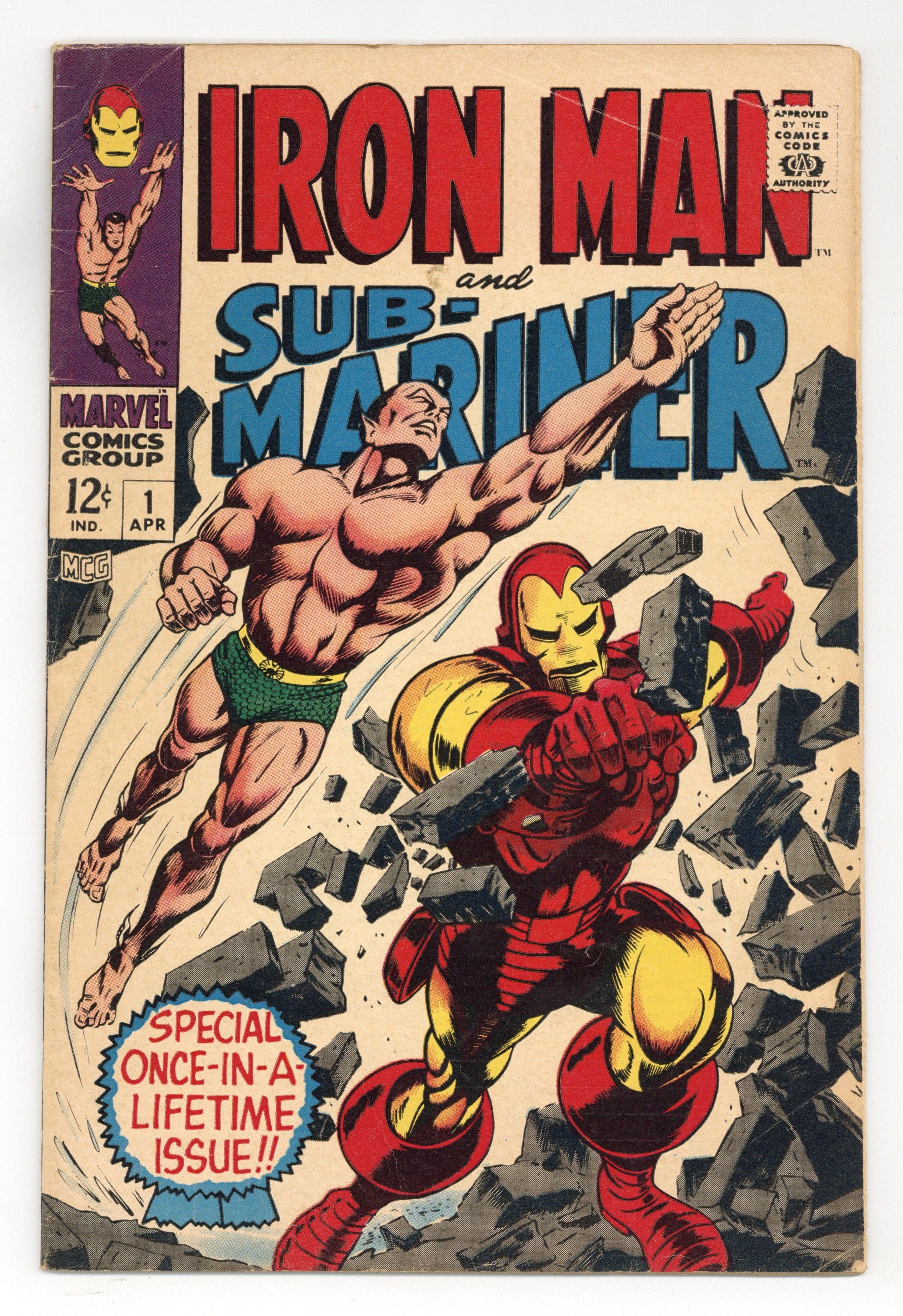 Cover pencils by Gene Colan, inks by Bill Everett. "The Torrent Without - The Tumult Within!," script by Archie Goodwin, pencils by Gene Colan, inks by Johnny Craig; Iron Man escapes from the trap set up by Whiplash and the Big M when a cadre of AIM agents attacks the Maggia's gambling ship. "Call Him Destiny... or Call Him Death!," script by Roy Thomas, pencils by Gene Colan, inks by Frank Giacoia; As Namor battles Destiny, the villain recounts his past connection to Namor's father. Pre-dates both Iron Man #1 and Sub-Mariner #1; Iron Man story continues in Iron Man #1, while the Sub-Mariner story continues in Sub-Mariner #1. 36 pgs., full color. $0.12. Cover price $0.12.