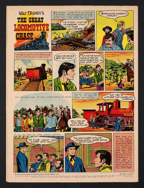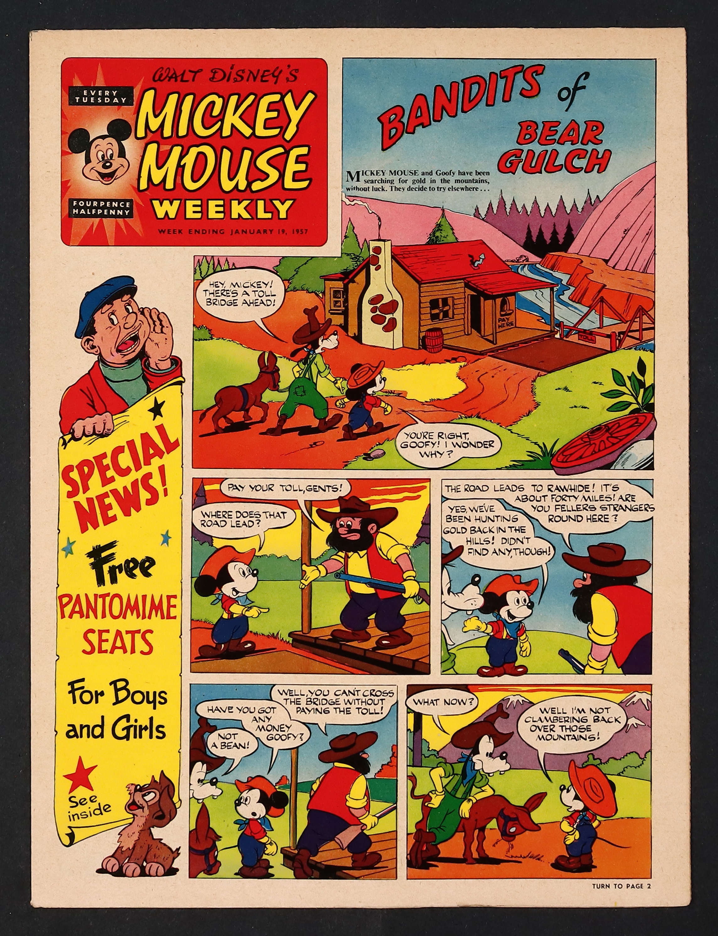 Tags: Cartoon, Disney Ducks & MicePublished Jan 1957 by Odhams Press Ltd..$75.00January 19, 1957 issue - Disney comics and text stories. Tabloid format 10 1/2-in. x 14-in. 12 pages, eight in black and white, and four full color