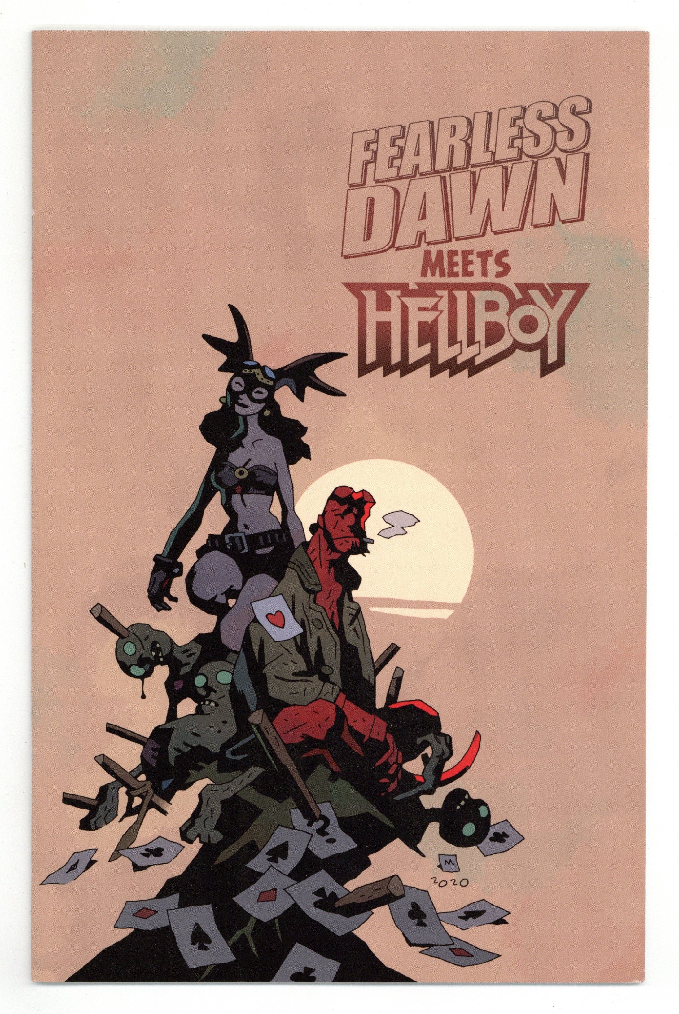 Published Sep 2020 by Albatross Funnybooks.$18.00Story and Art by Mike Mignola and Steve Mannion. Cover by Mike Mignola. For the hardcore collectors out there, Albatross offers a special limited-edition card stock cover of Fearless Dawn Meets Hellboy with art by Mike Mignola! It's all-out pulp adventure as Mike Mignola's Hellboy teams up with Steve Mannion's legendary underground comic hero, Fearless Dawn! A misadventure in Romania drops Hellboy into the middle of the paranormal mission of Fearless Dawn's crew. But this meeting of heroes ain't no picnic when the undead 666th Panzer Division shows up. Beautifully co-illustrated by Mike Mignola and Steve Mannion. 32 pages, full color. Cover price $5.99.