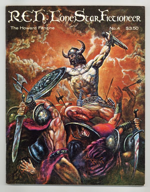 Issue #4 - Spring 1976. Cover by Marcus Boas, back cover by Frank Frazetta. Inside front and back covers by Howard Chaykin. Features a reprint of Robert E. Howard's Three Bladed Doom, illustrated by Jim Steranko. A portfolio by Marcus Boas. An interview with L. Sprague De Camp. Also an interview with John Severin and a full-page illustration of King Kull. MM Moamrath (Bill Wallace and Joe Pumilia Lovecraft parody) story titled My Sword is Quick. Walt Simonson, Nestor Redondo also contribute art. 8 1/2-in. x 11-in., 64 pages, black and white. Cover price $3.50.