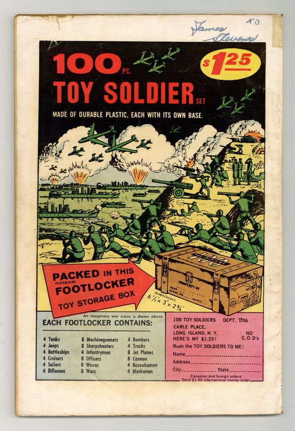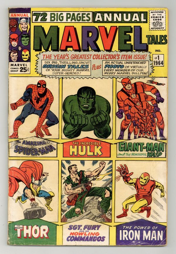 Reprints: Amazing Fantasy 15 (1st Spider-Man) by Steve Ditko; Hulk 1 by Jack Kirby, Tales to Astonish 35 (Ant-Man); Tales to Astonish 49 (Giant Man), Tales of Suspense 39 & 48 (1st Iron Man), Journey into Mystery 83 (1st Thor) by Kirby, and Sgt. Fury 1 by Kirby. Kirby photo. Cover price $0.25.