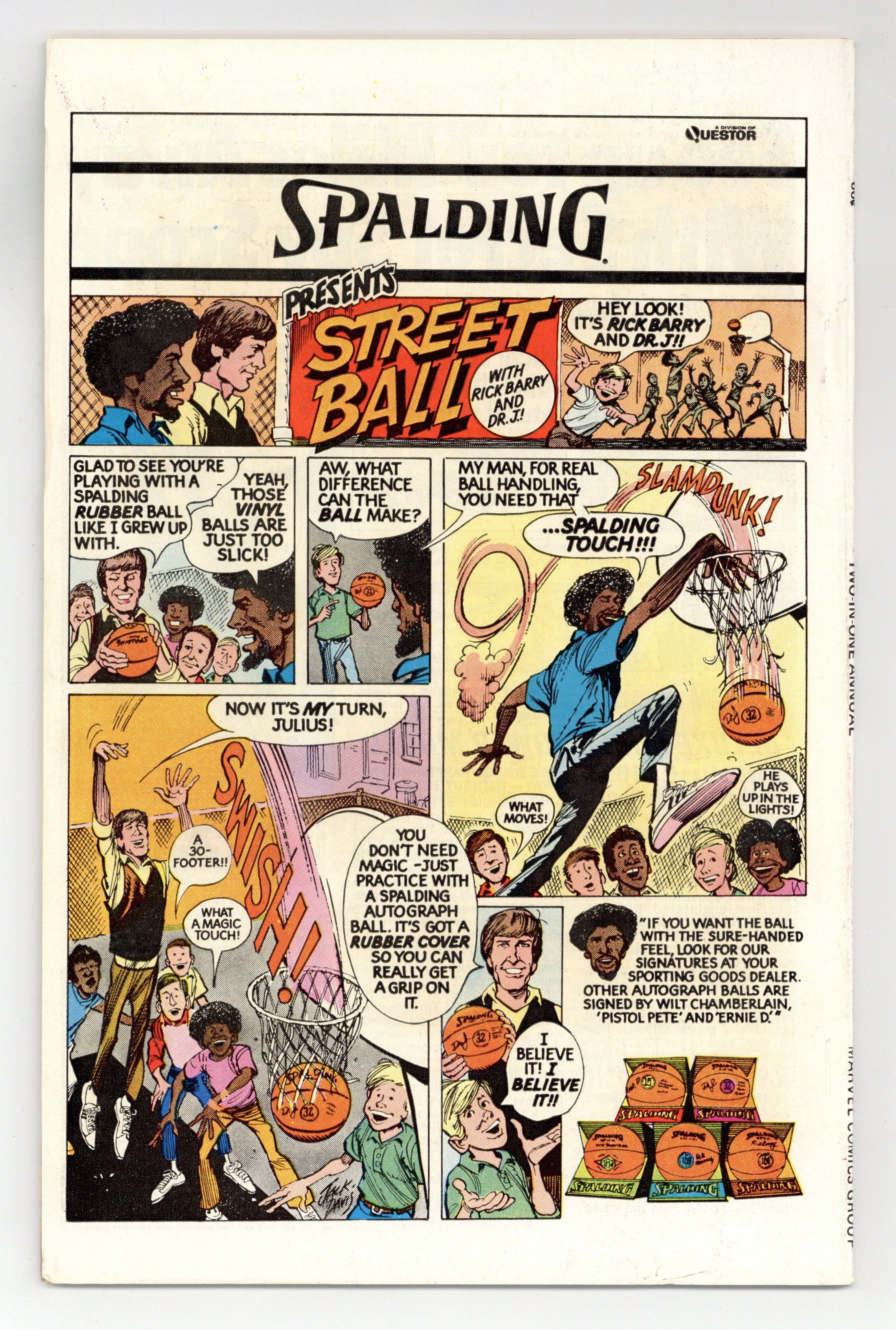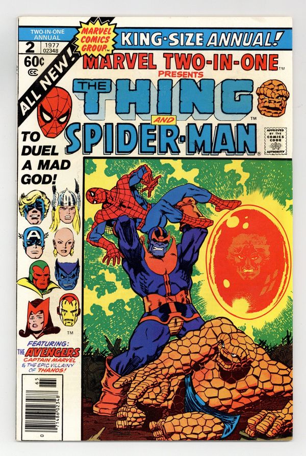 "Death Watch!" Part 2 of 2. Guest-starring Spider-Man, the Thing, Captain Marvel, and the Avengers. Script by Jim Starlin. Art by Jim Starlin (breakdowns) and Joe Rubinstein (finishes). Cover by Jim Starlin. Story continues from Avengers Annual 7. After Captain Marvel, Iron Man, and Thor destroyed Thanos' synthetic power gem, victory appeared close at hand for Earth's Mightiest Heroes. But the evil genius' back up plan has worked to perfection and knocked out the Avengers! Before succumbing to unconsciousness though, Moondragon sends a desperate plea for help back to Earth, specifically to Peter Parker! The web-slinger knows that cosmic battles in outer space are not his specialty, so he swings by the Baxter Building to scoop up a friend. After a quick pow-wow, the blue-eyed idol of millions and your friendly neighborhood Spider-Man blast off to save the galaxy! It's an epic encounter onboard the mad Titan's space ark as the Thing, Thor, Spider-Man, and finally Adam Warlock test their mettle vs. Thanos! Simply a fantastic annual! First appearances of Master Order and Lord Chaos. Avengers Lineup: Beast, Captain America, Iron Man, Scarlet Witch, Thor, and the Vision. (Note: Besides a surreal appearance in the Death of Captain Marvel Graphic Novel (1982), Thanos does not appear again until Silver Surfer (2nd series) #34 thirteen years later.) 48 pages Cover price $0.60.