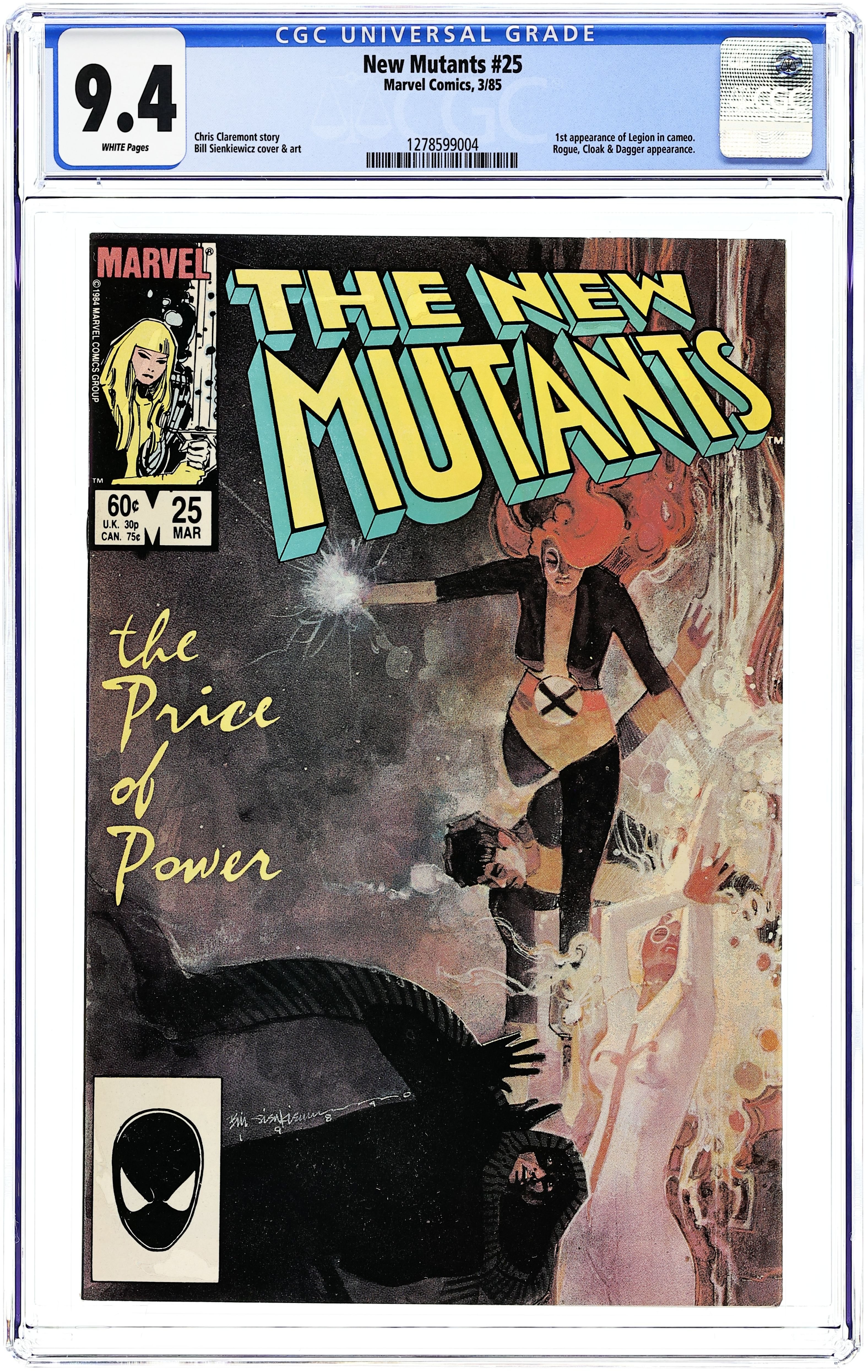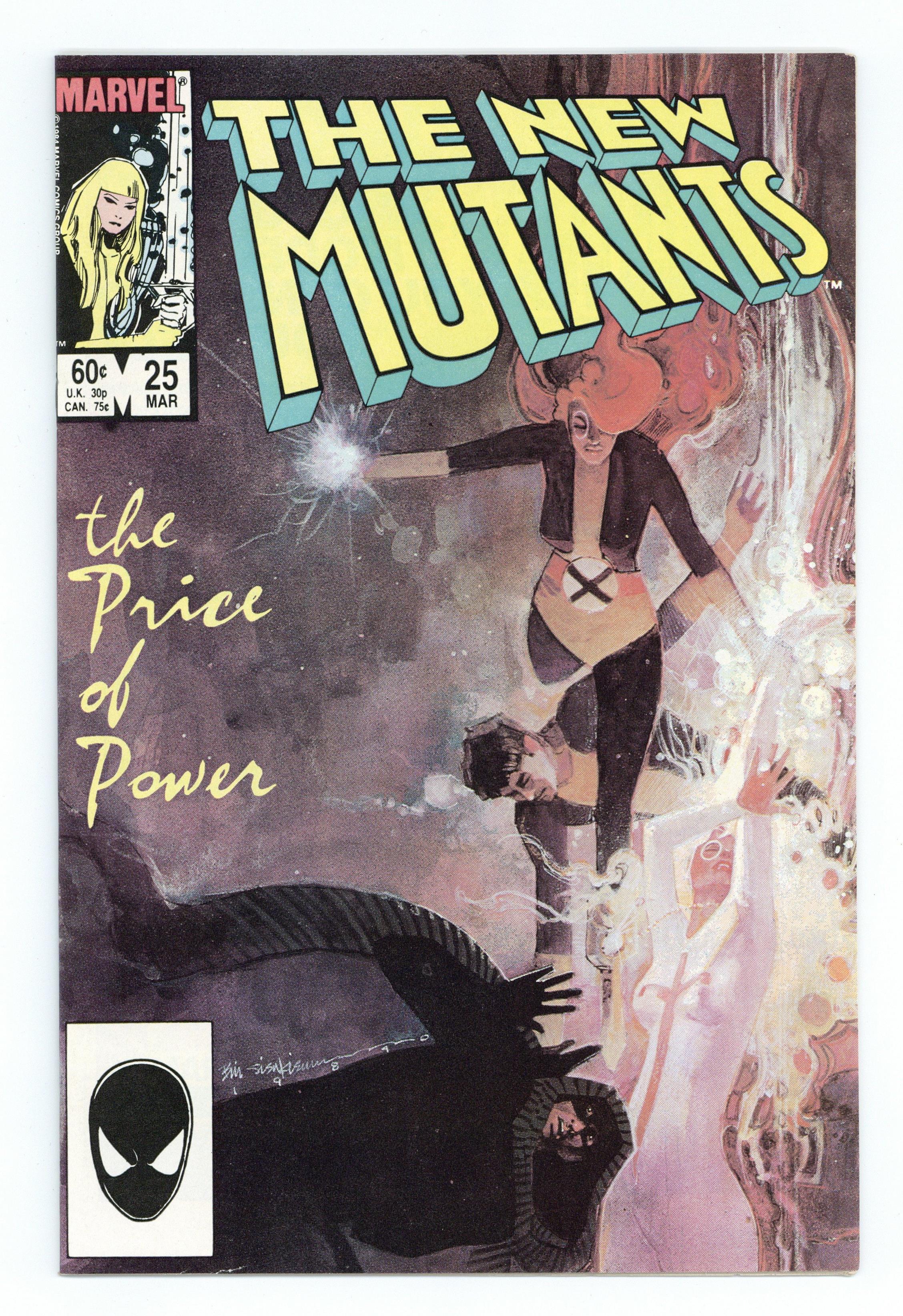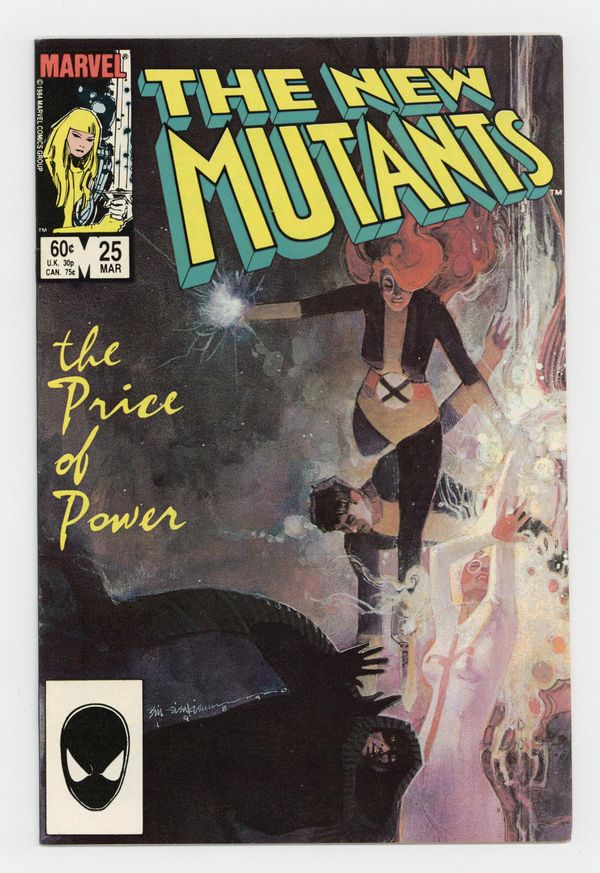 Direct Edition. Last 60-cent cover price issue. 1st appearance of Legion (cameo). Cover art by Bill Sienkiewicz. The Only Thing to Fear . . ., script by Chris Claremont, art by Bill Sienkiewicz; Professor X talk with Cloak and Dagger, then asks Magik to transport them all to Limbo; Magik and Rogue succeed in Cloak and Dagger's powers from Sunspot and Wolfsbane back to Cloak and Dagger; Cloak and Dagger renew their fight against injustice. David Charles Haller and Lila Cheney illustrations by Bill Sienkiewicz. 36 pgs. $0.60. Cover price $0.60.