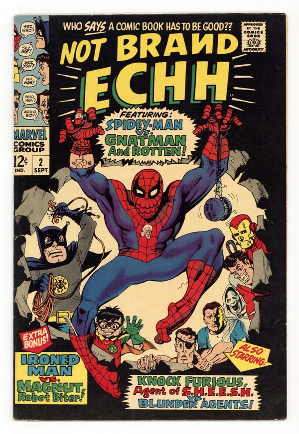 Stan Lee and the Marvel Bullpen parody themselves in MAD-style spoof stories. This issue includes Marvels spoof heroes taking on characters that strongly resemble other companies superheroes. Spidey-Man vs. Gnatman and Rotten, written by Stan Lee, with art by Marie Severin, John Romita and Frank Giacoia; Ironed Man vs. Magnut, Robot Biter written by Roy Thomas, with art by Don Heck; and Knock Furious, Agent of SHEESH vs. The Blunder Agents written by Gary Friedrich, with art by Marie Severin. Cover by Severin. 32 pages. Cover price $0.12. Cover price $0.12.