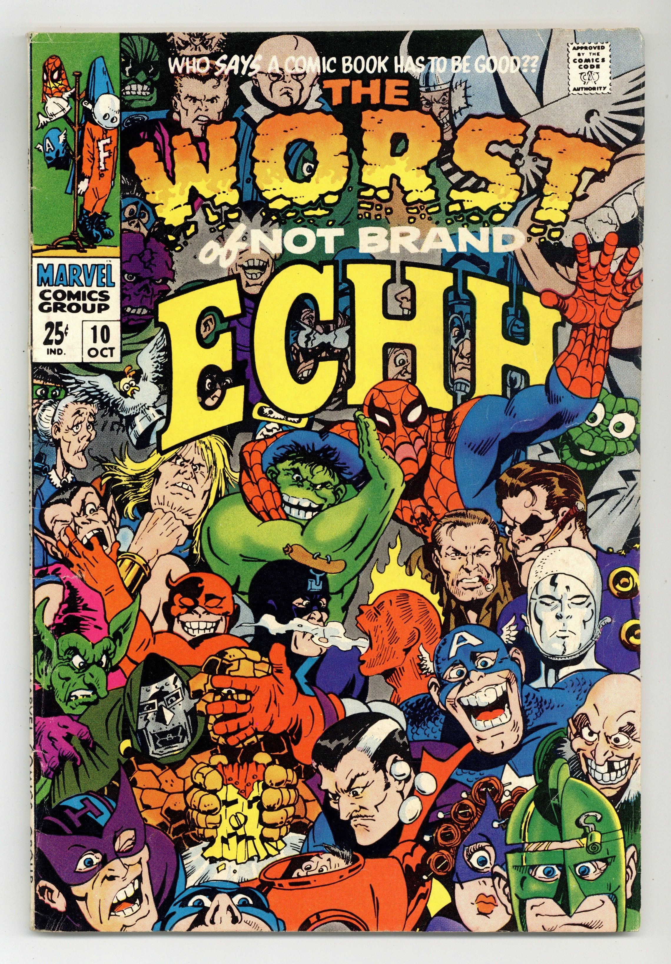 Stan Lee, Jack Kirby and the Marvel Bullpen parody themselves in MAD-style spoof stories. Reprint issue includes The Silver Burper, written by Stan Lee, with art by Jack Kirby; Spidey-Man vs. Gnatman and Rotten, written by Stan Lee, with art by Marie Severin, John Romita and Frank Giacoia; The Origin of Charlie America, written by Roy Thomas, with art by Tom Sutton; Knock Furious, Agent of SHEESH vs. The Blunder Agents written by Gary Friedrich, with art by Marie Severin; The Ecchs-Men, If Magneat-O Should Clobber Us written by Roy Thomas, with art by Tom Sutton; Sore, Son of Shmodin, written by Stan Lee, with art by Jack Kirby; and The Origin of Forbush-Man, written by Stan Lee, with art by Jack Kirby. Cover by Severin. 64 pages. Cover price $0.25.