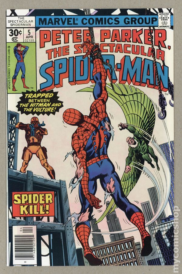 Tags: Marvel Legacy Numbering: Spectacular Spider-Man (part 5), Spider-Man$15.00"Spider-Kill!" Part 2 of 2. Script by Archie Goodwin. Art by Sal Buscema (breakdowns) and Mike Esposito (finishes). Cover by Dave Cockrum. An awesome three-way battle rages outside Peter Parker's apartment! The Vulture vs. the Hitman vs. the Spectacular Spider-Man! As the cover shows, the situation looks grim for the web-slinger as he dangles in midair with the Vulture closing in and the Hitman lining up the kill shot! Will the spectacular one survive? Meanwhile, Flash Thompson and Mary Jane Watson investigate the mysterious reappearance of Sha Shan. (Note: The Hitman returns in Amazing Spider-Man 174.) 32 pages Cover price $0.30.