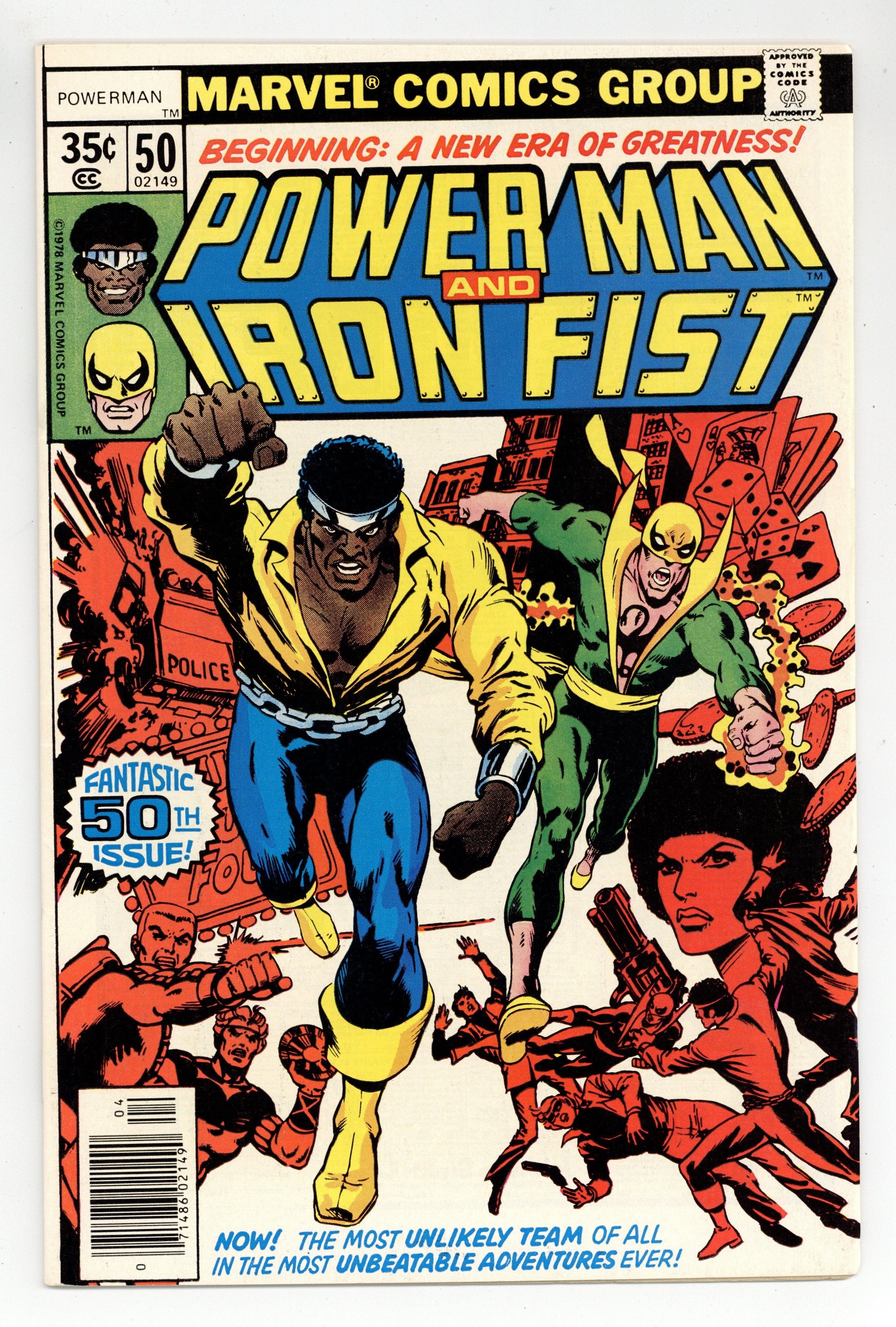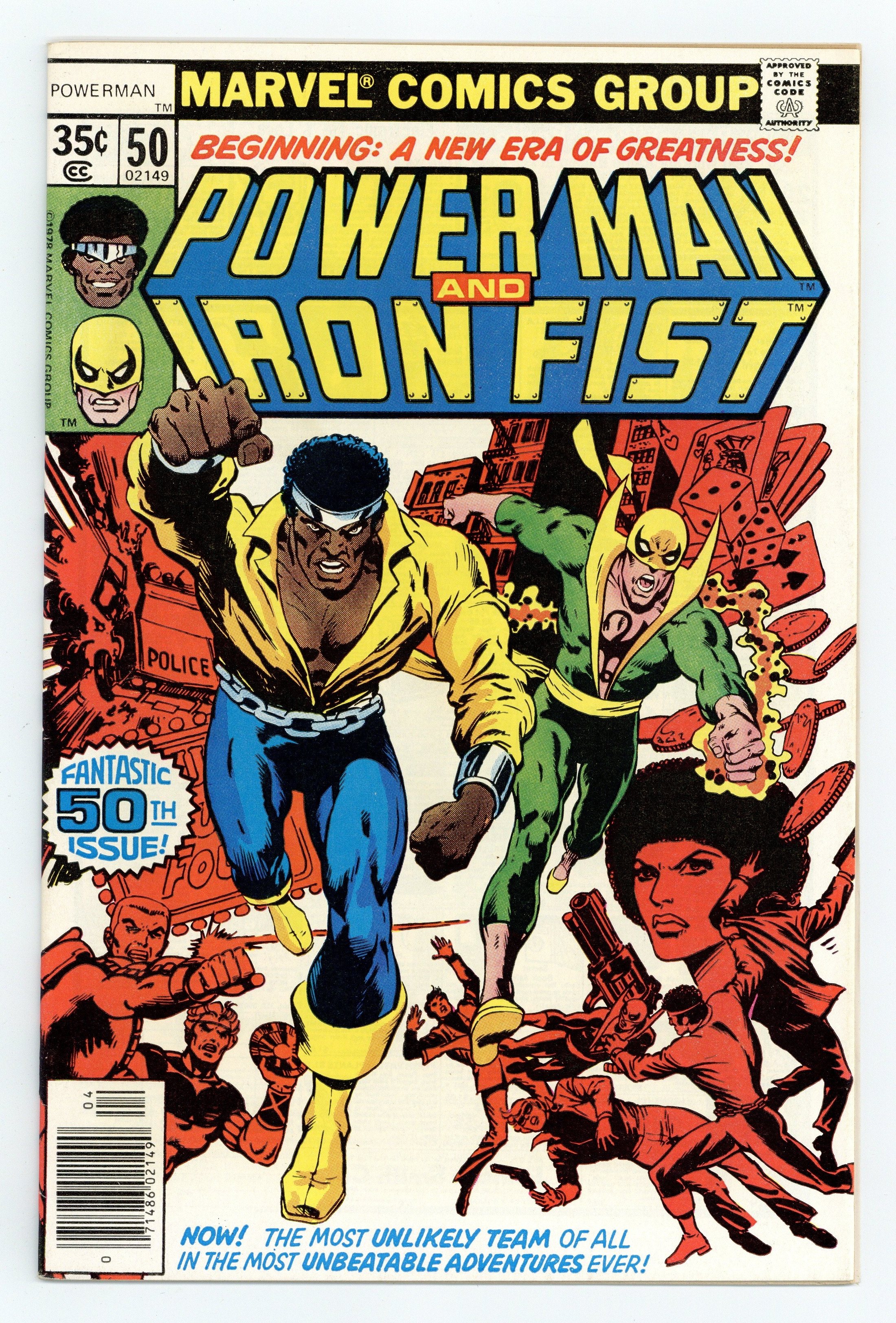 "Freedom!" Guest-starring the Daughters of the Dragon. Story by Chris Claremont. Art by John Byrne and Dan Green. Luke Cage has cleared his name of the bogus charges that landed him in jail to begin with, and now he is free to start his life anew as a free man. Plus, Power Man and Iron Fist officially become a team, as reflected in the title. But will their first adventure as partners be their last when the deadly assassins Stiletto and Discus attack? NOTE: First issue titled "Power Man and Iron Fist!" Cover price $0.35.