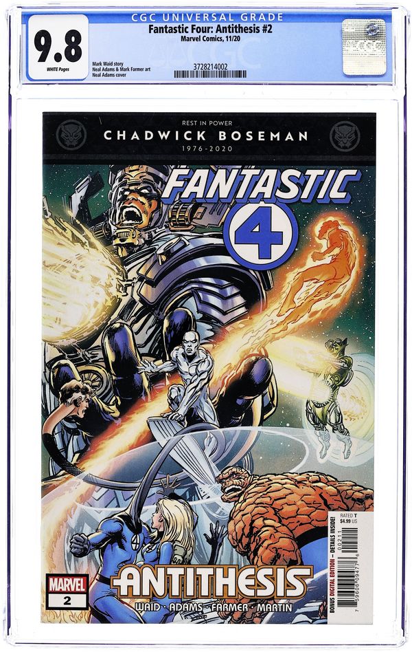 Written by Mark Waid. Art by Neal Adams and Mark Farmer. Cover by Neal Adams. The Silver Surfer leads the Fantastic Four in a mad race to find the missing Galactus. Only he has the power to defeat Antithesis - the Negative Zone version of Galactus himself! 32 pages, full color. Rated T Cover price $4.99.