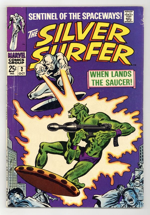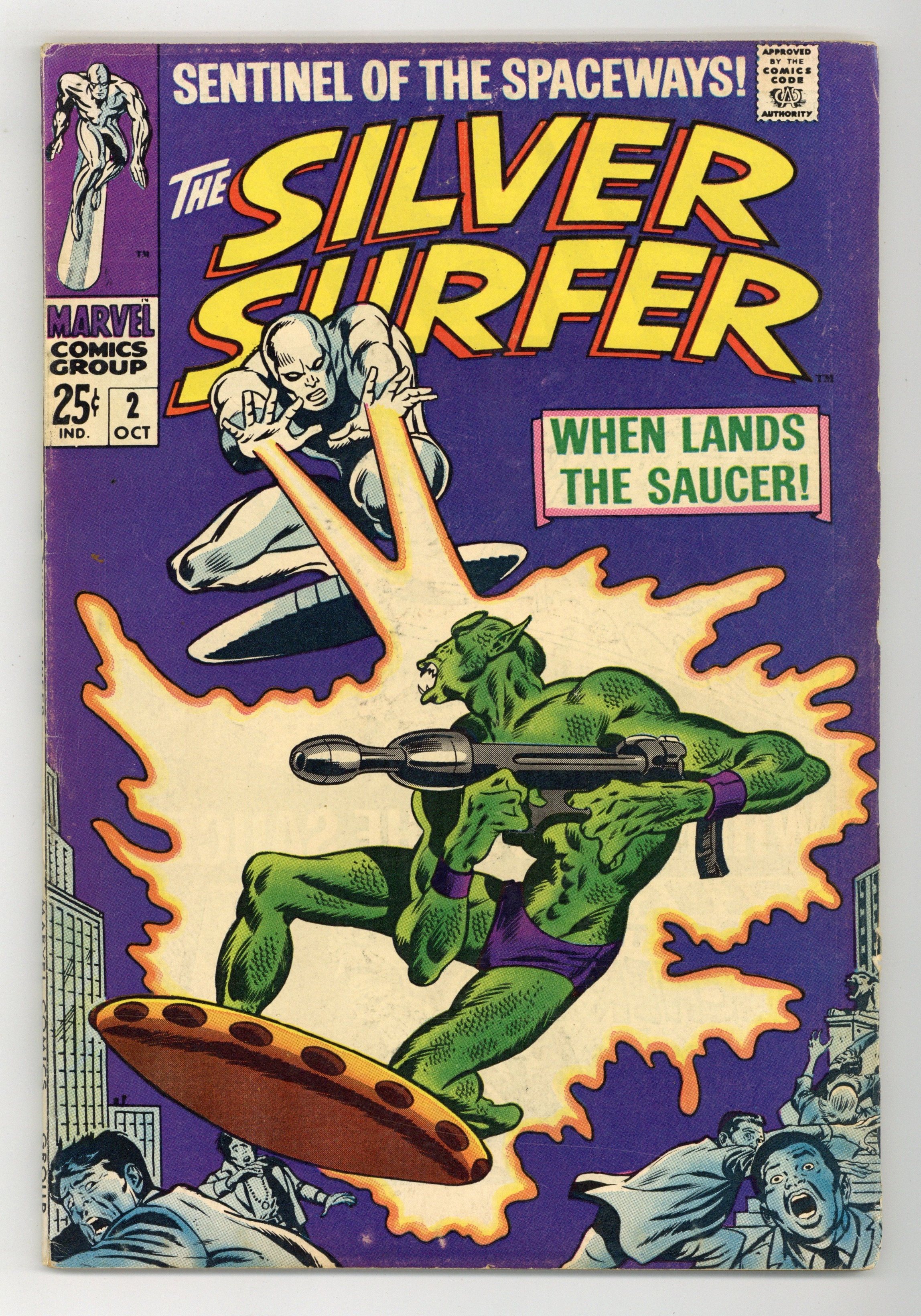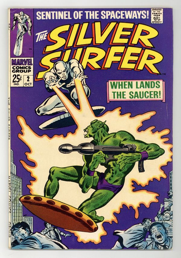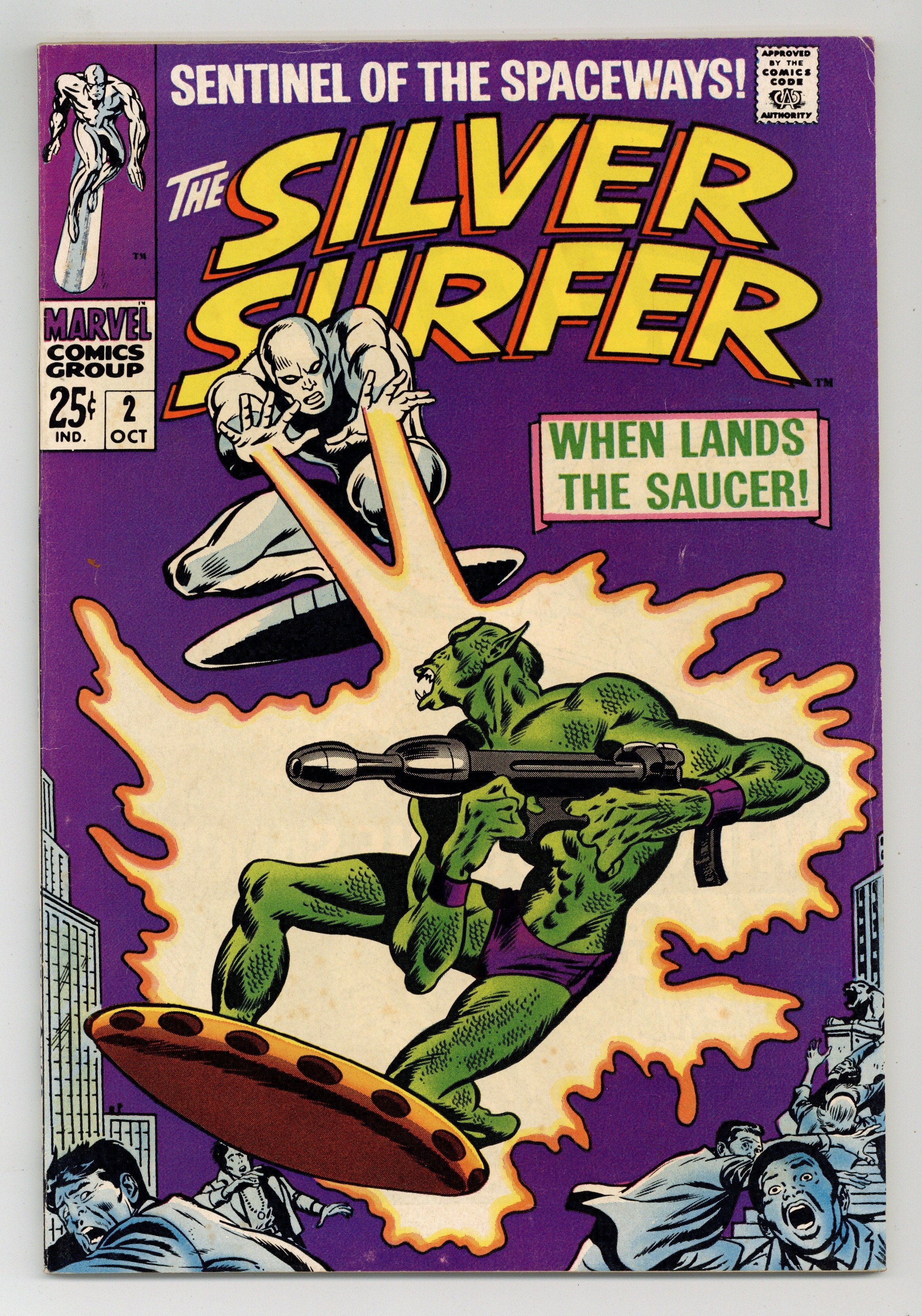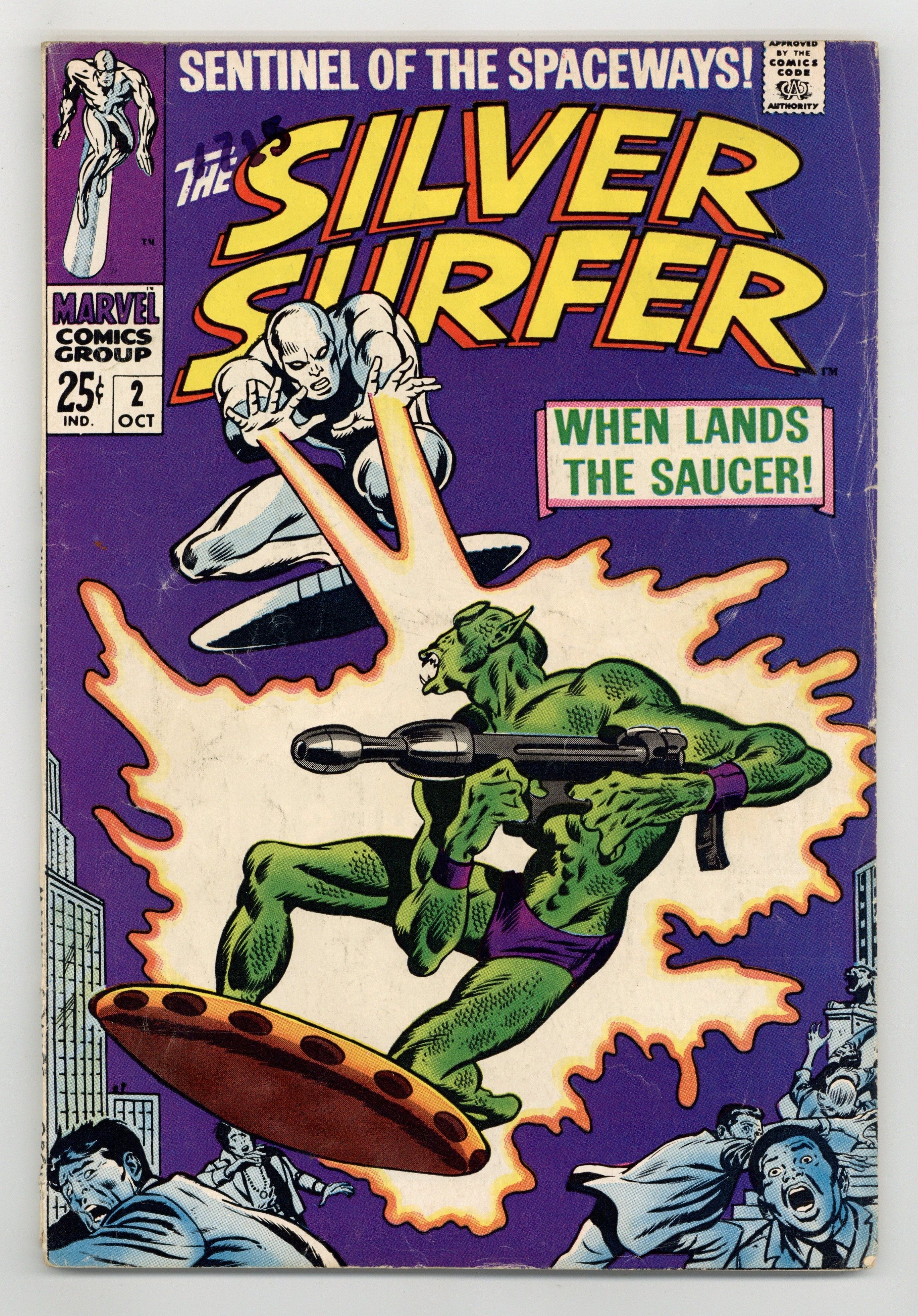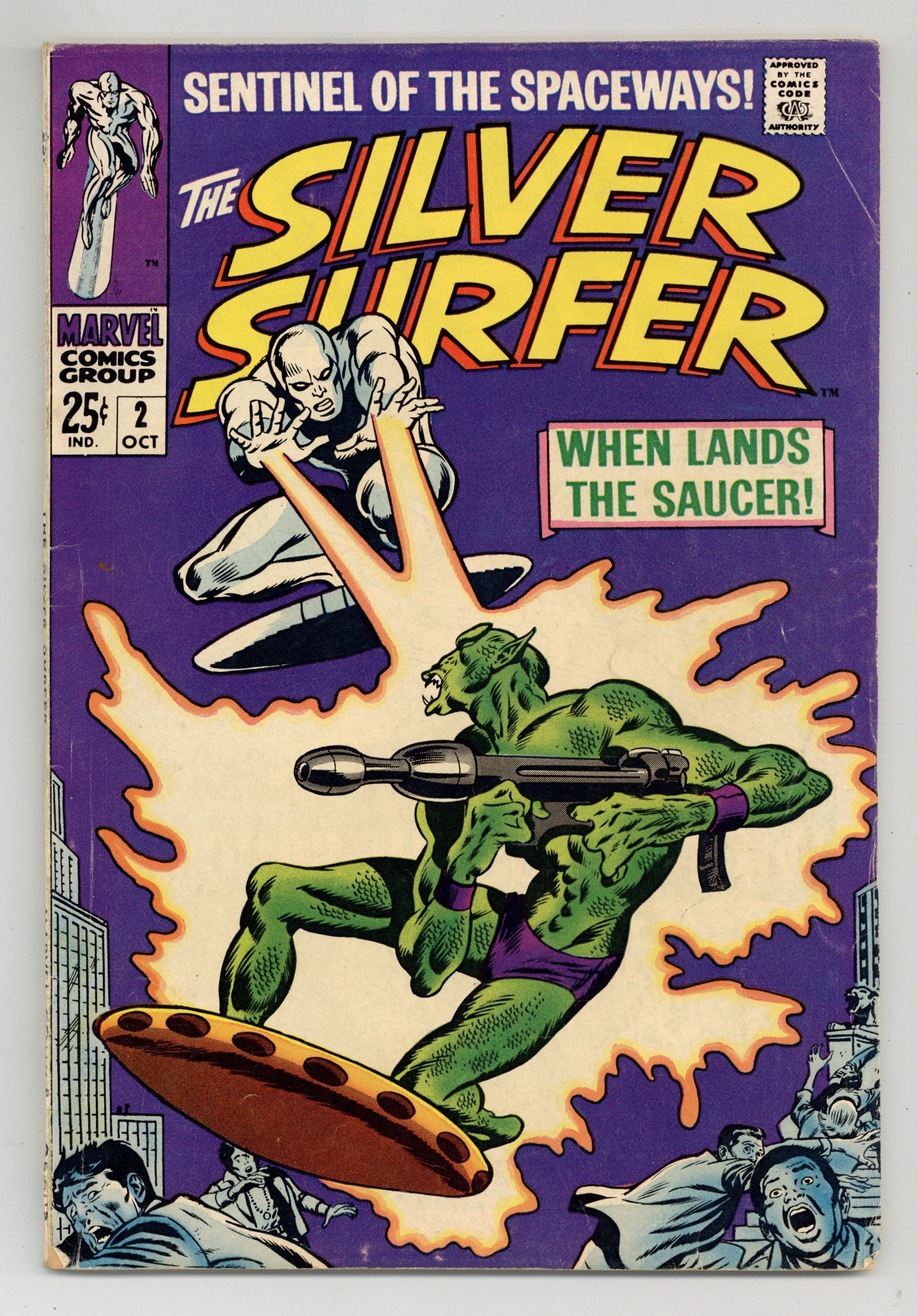 "When Lands the Saucer!" Written by Stan Lee. Art and cover by John Buscema and Joe Sinnott. Exiled to planet Earth by his former master, Galactus, the Silver Surfer, a being empowered with the Power Cosmic itself, finds he cannot penetrate the invisible barrier which the Devourer of Worlds has encompassed the planet with. However, this barrier does not prevent others from beyond the stars from coming to Earth and wrecking havoc. Thus, when a malevolent race of aliens descend upon the unsuspecting citizens of Earth, only the Silver Surfer possesses the power to stop them. Includes the Watcher back-up "The Coming of the Krills!" Story by Stan Lee. Art by Gene Colan and Paul Reinman. 68 pages Cover price $0.25.