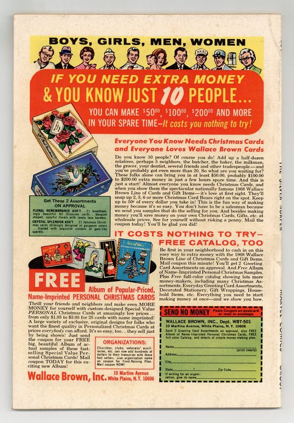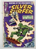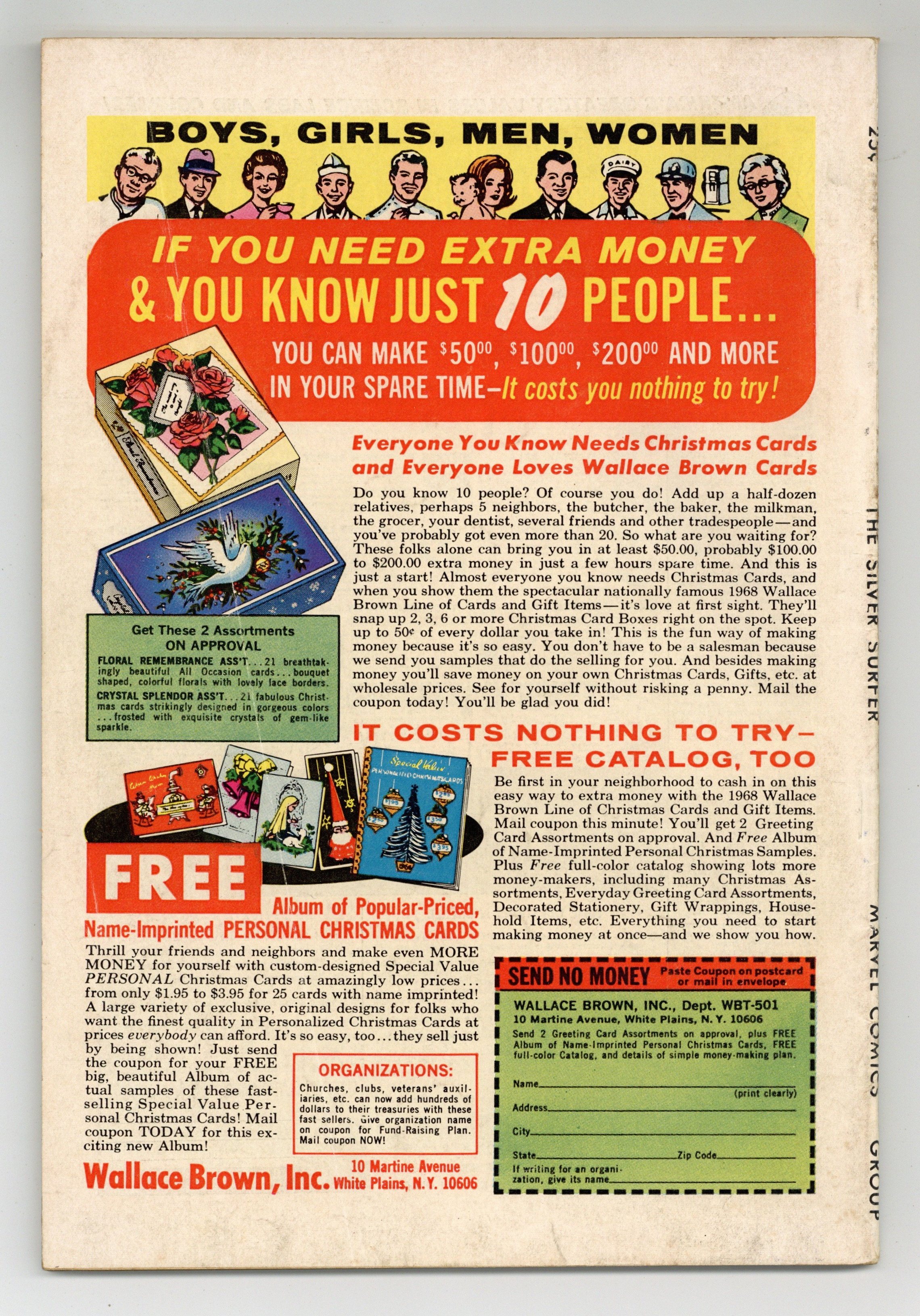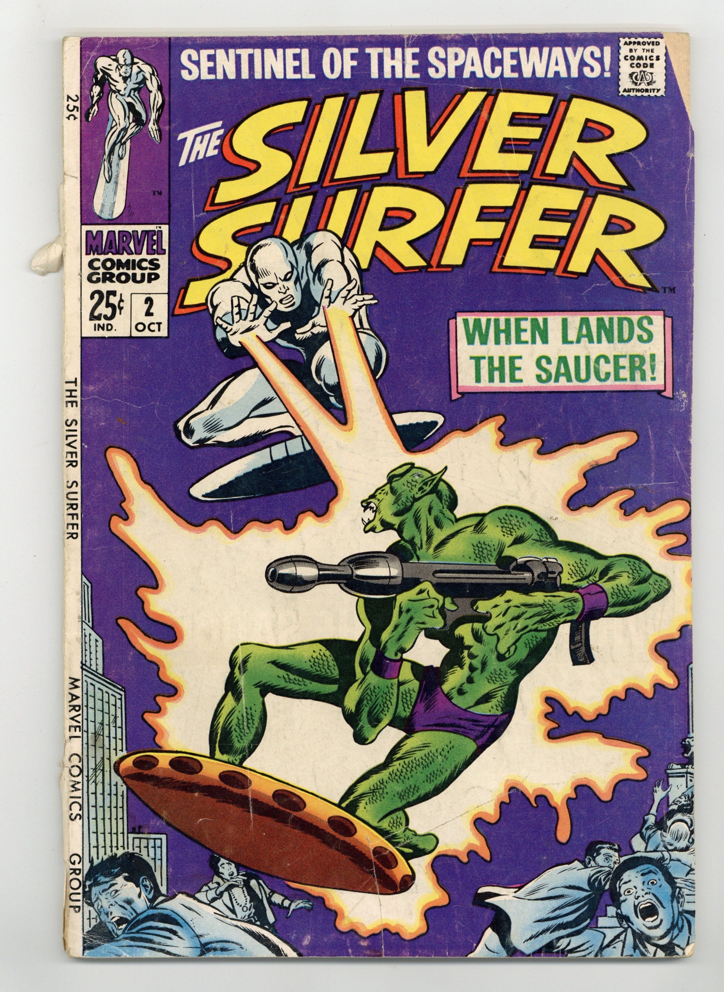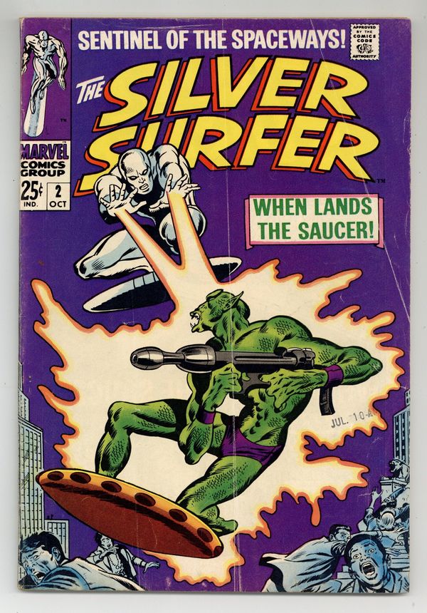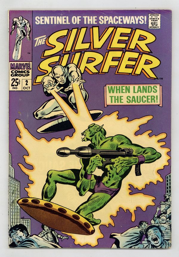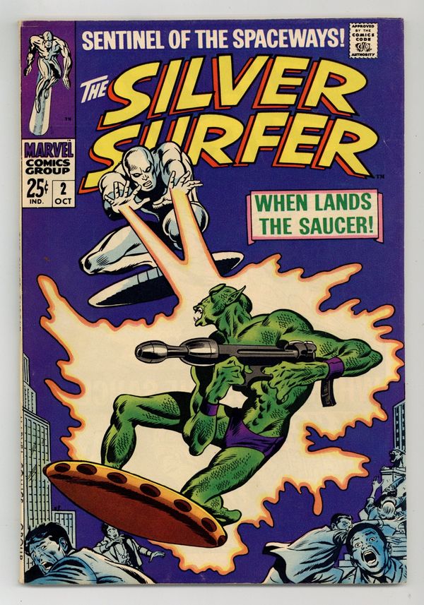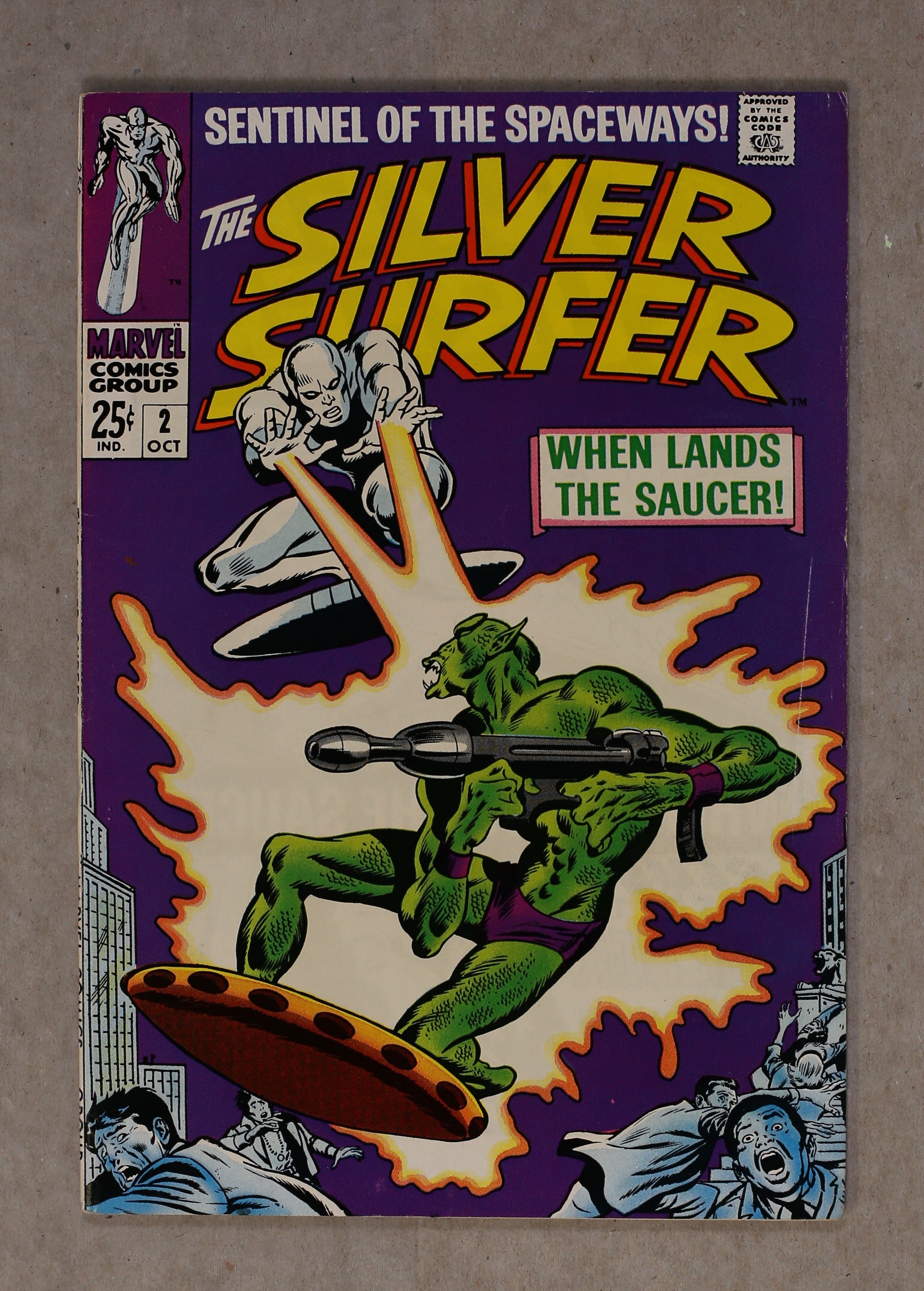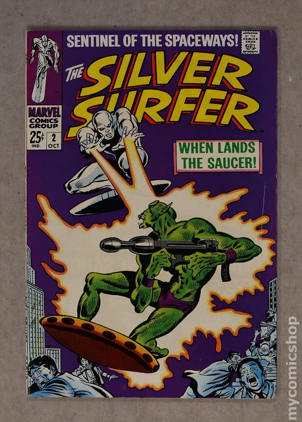 "When Lands the Saucer!" Written by Stan Lee. Art and cover by John Buscema and Joe Sinnott. Exiled to planet Earth by his former master, Galactus, the Silver Surfer, a being empowered with the Power Cosmic itself, finds he cannot penetrate the invisible barrier which the Devourer of Worlds has encompassed the planet with. However, this barrier does not prevent others from beyond the stars from coming to Earth and wrecking havoc. Thus, when a malevolent race of aliens descend upon the unsuspecting citizens of Earth, only the Silver Surfer possesses the power to stop them. Includes the Watcher back-up "The Coming of the Krills!" Story by Stan Lee. Art by Gene Colan and Paul Reinman. 68 pages Cover price $0.25.