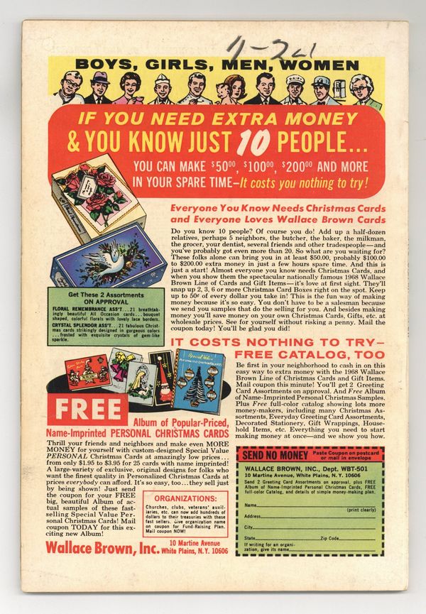 Tags: Fantastic Four$54.00"When Lands the Saucer!" Written by Stan Lee. Art and cover by John Buscema and Joe Sinnott. Exiled to planet Earth by his former master, Galactus, the Silver Surfer, a being empowered with the Power Cosmic itself, finds he cannot penetrate the invisible barrier which the Devourer of Worlds has encompassed the planet with. However, this barrier does not prevent others from beyond the stars from coming to Earth and wrecking havoc. Thus, when a malevolent race of aliens descend upon the unsuspecting citizens of Earth, only the Silver Surfer possesses the power to stop them. Includes the Watcher back-up "The Coming of the Krills!" Story by Stan Lee. Art by Gene Colan and Paul Reinman. 68 pages Cover price $0.25.