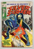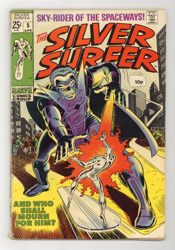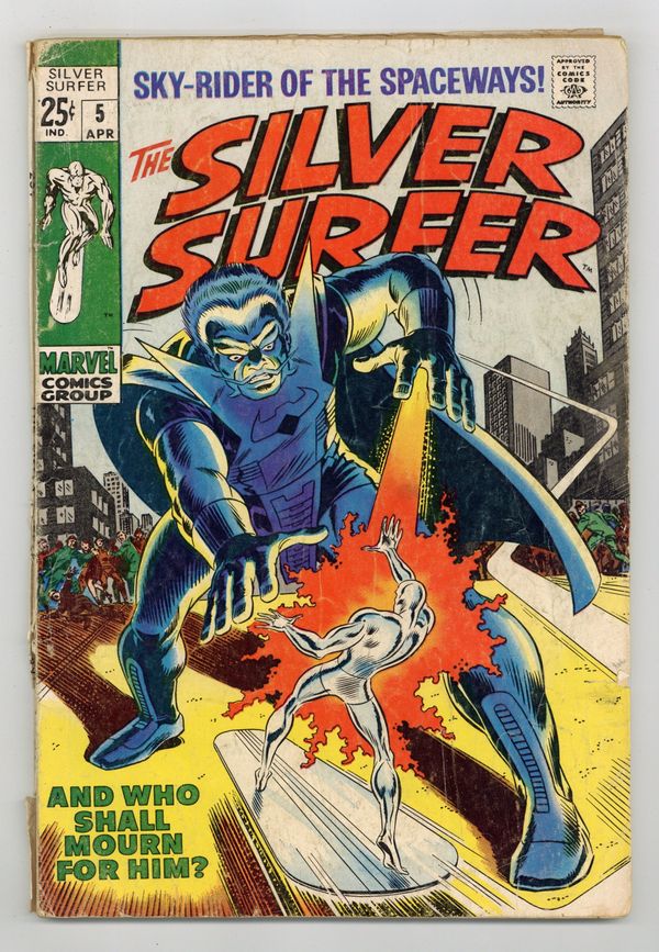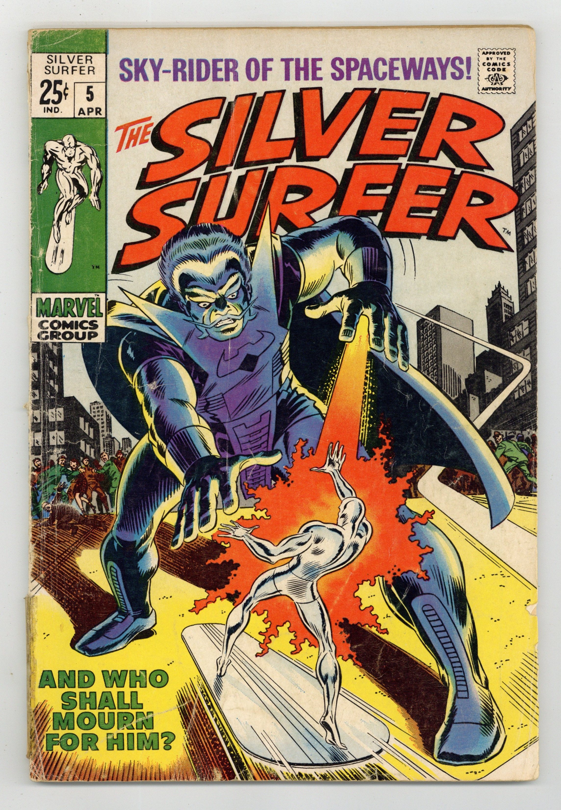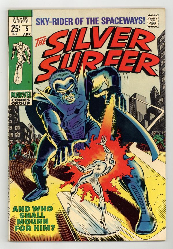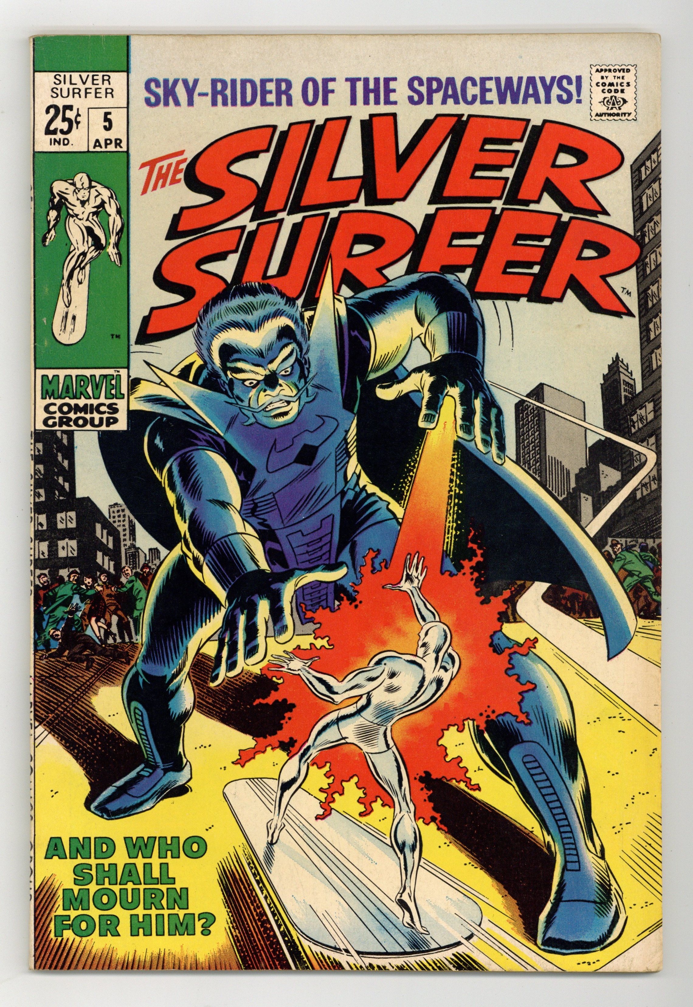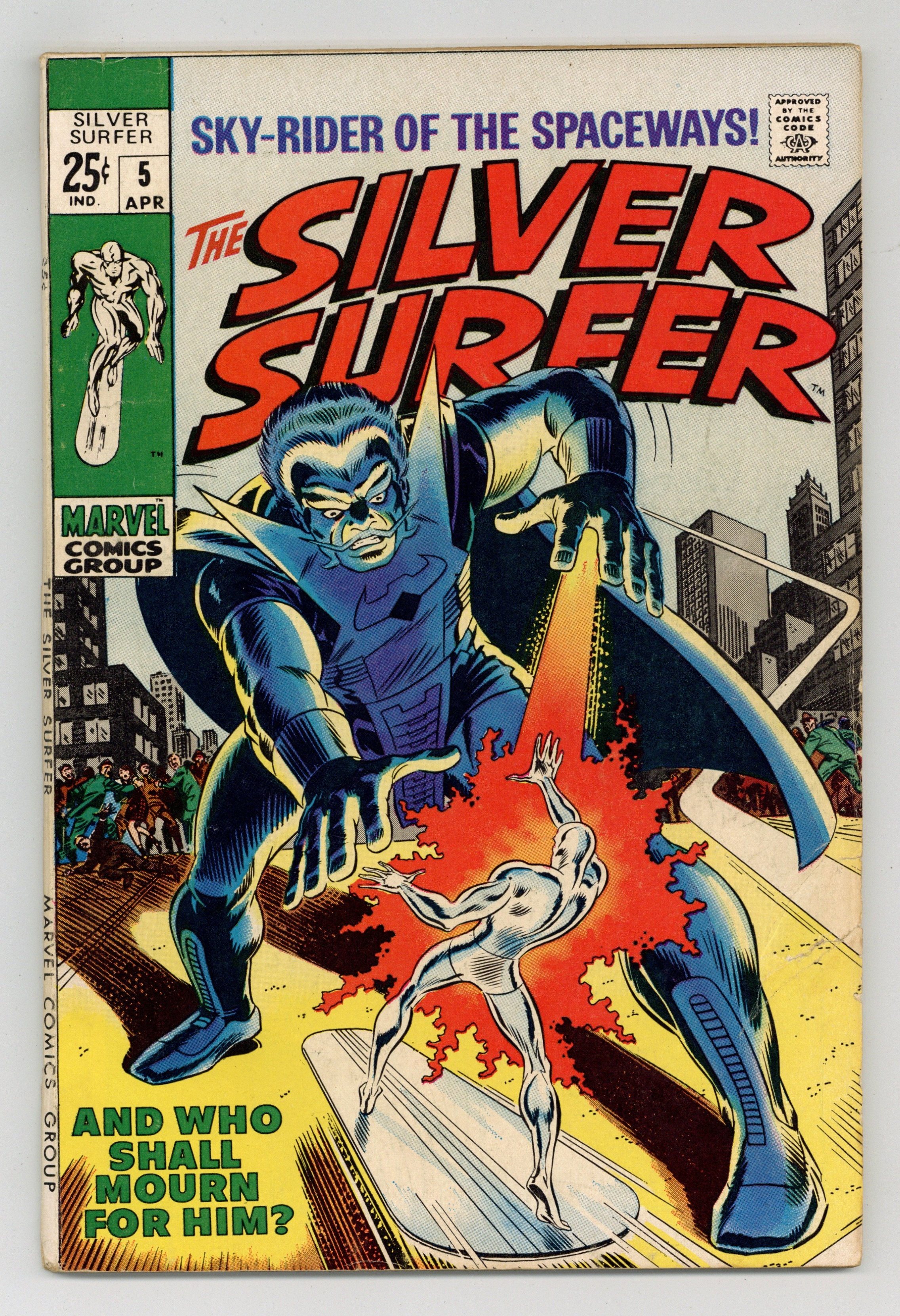 "...And Who Shall Mourn for Him?!" Cameos by the Fantastic Four and the X-Men. Written by Stan Lee. Art by John Buscema and Sal Buscema. The Silver Surfer encounters a being of unimaginable cosmic power. Can even the Sentinel of the Spaceways hope to defeat the enigmatic Stranger? Meanwhile, for the fate of many innocent lives, one man will make the ultimate sacrifice. Includes the Watcher back-up "Run, Roco, Run!" Story by Stan Lee. Art by Howard Purcell and John Tartaglione. 68-page giant. Letter to the editor from Wendy Pini (Fletcher) of Elfquest fame.