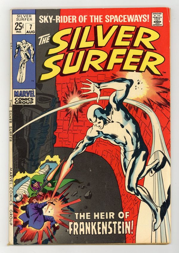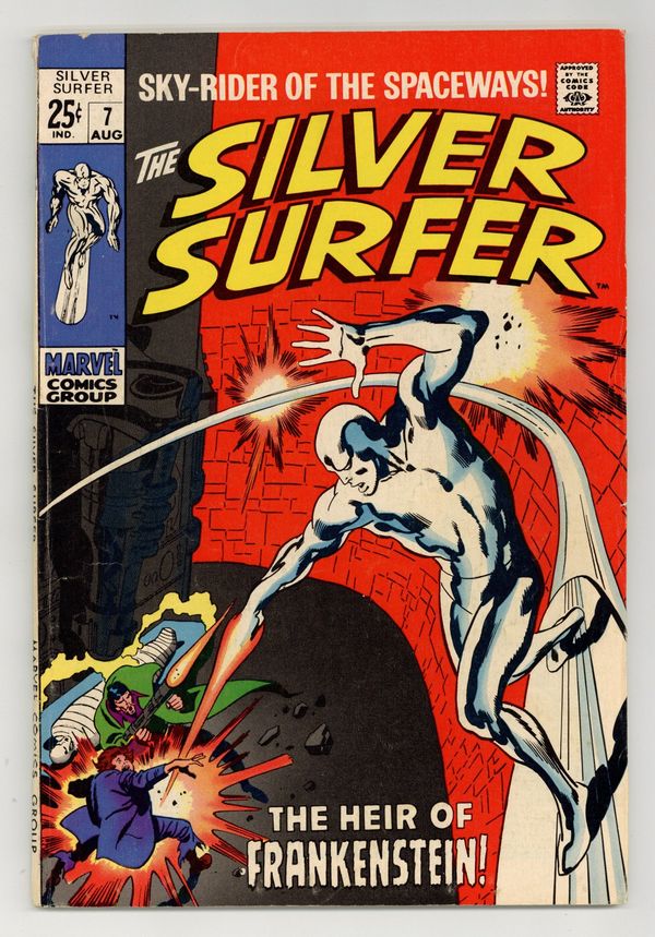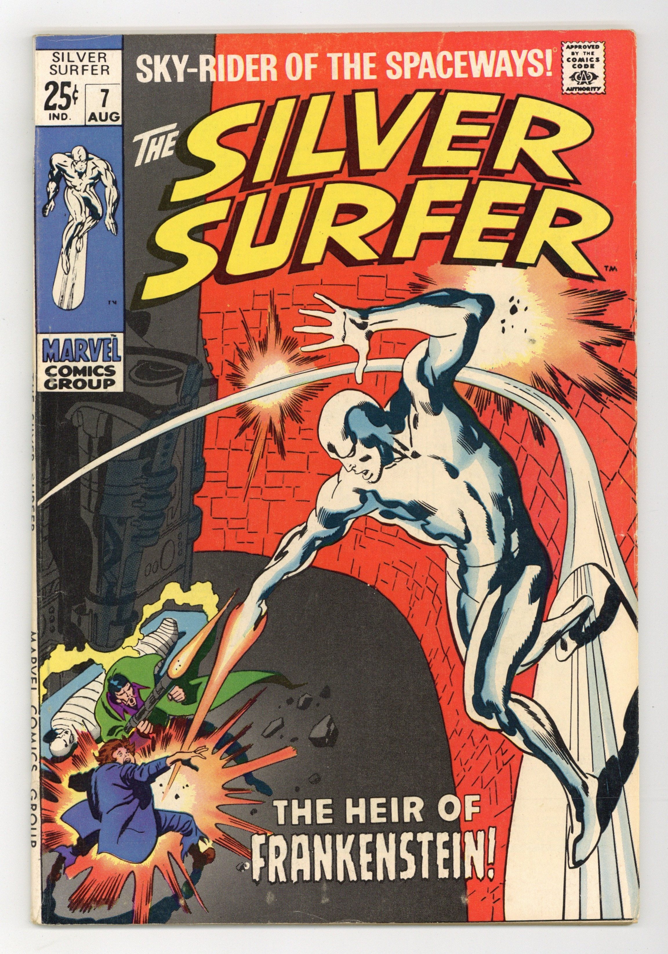"The Heir of Frankenstein!" Written by Stan Lee. Art by John Buscema and Sal Buscema. Cover by John John Buscema. When a madman clones the power of the Silver Surfer, the Sentinel of the Spaceways finds himself in mortal combat with a creatures who power rivals his own. Includes the Watcher back-up "I, the Gargoyle." Story by Stan Lee. Art by Howard Purcell and Dan Adkins. Final 64-page giant. First appearance of Marvel's Frankenstein. Cover price $0.25.