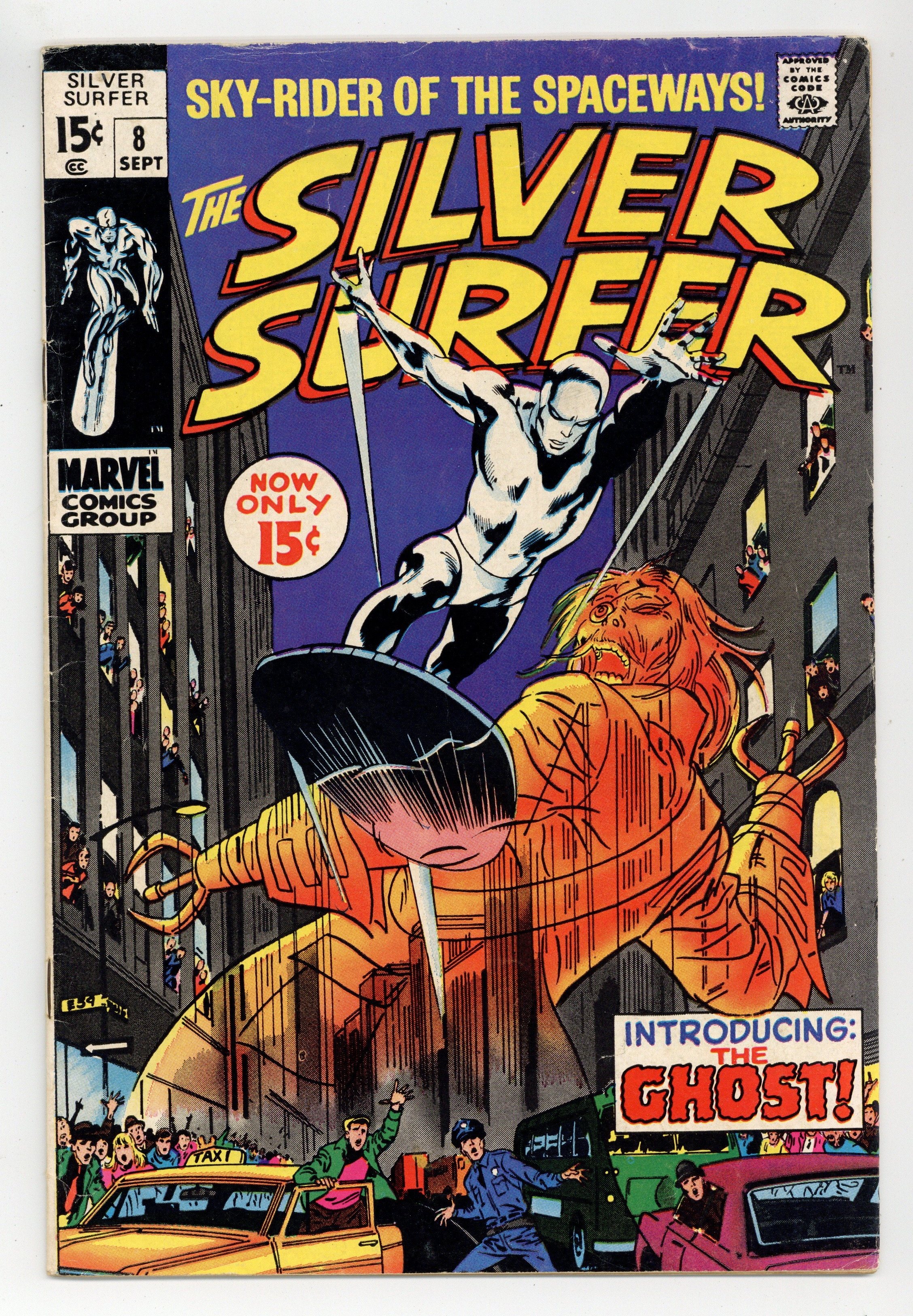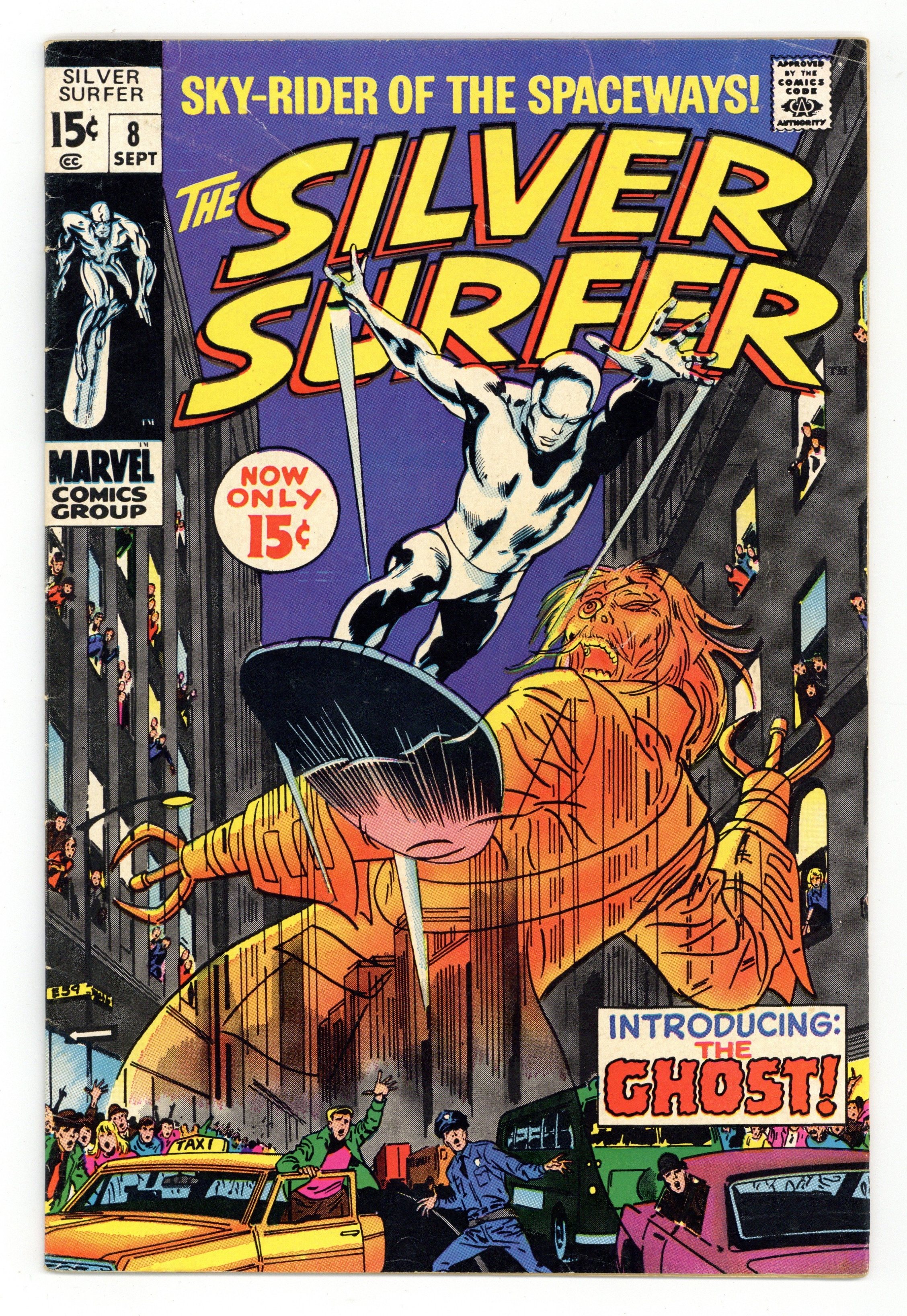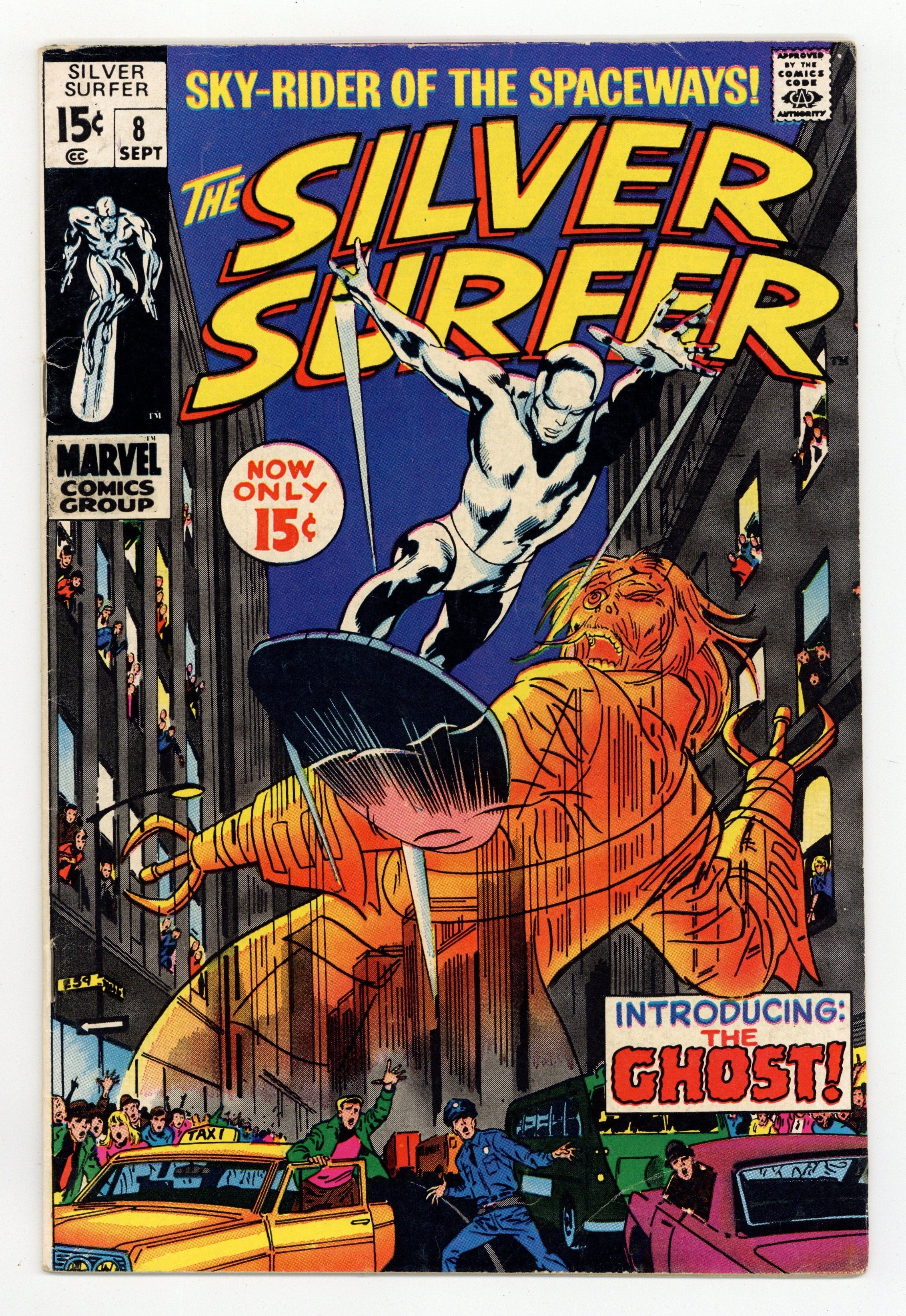 "Now Strikes the Ghost!" Part 1 of 2. Written by Stan Lee. Art by John Buscema and Dan Adkins. Mephisto, the very embodiment of evil, sends a powerful emissary, The Flying Dutchman, to destroy his hated enemy, the Silver Surfer. Cover price $0.15.