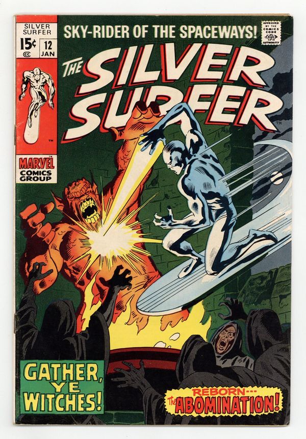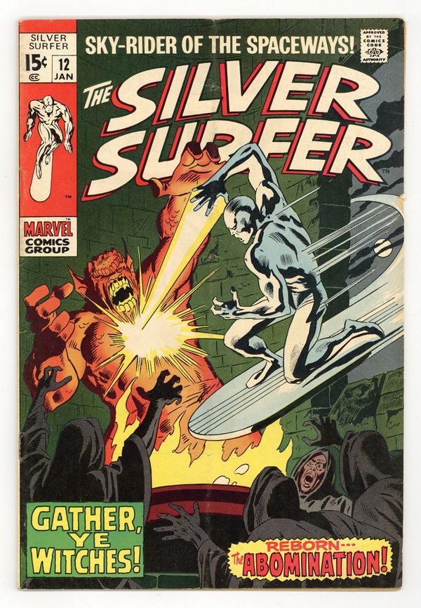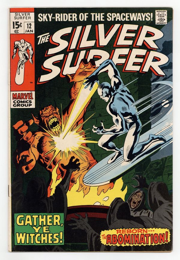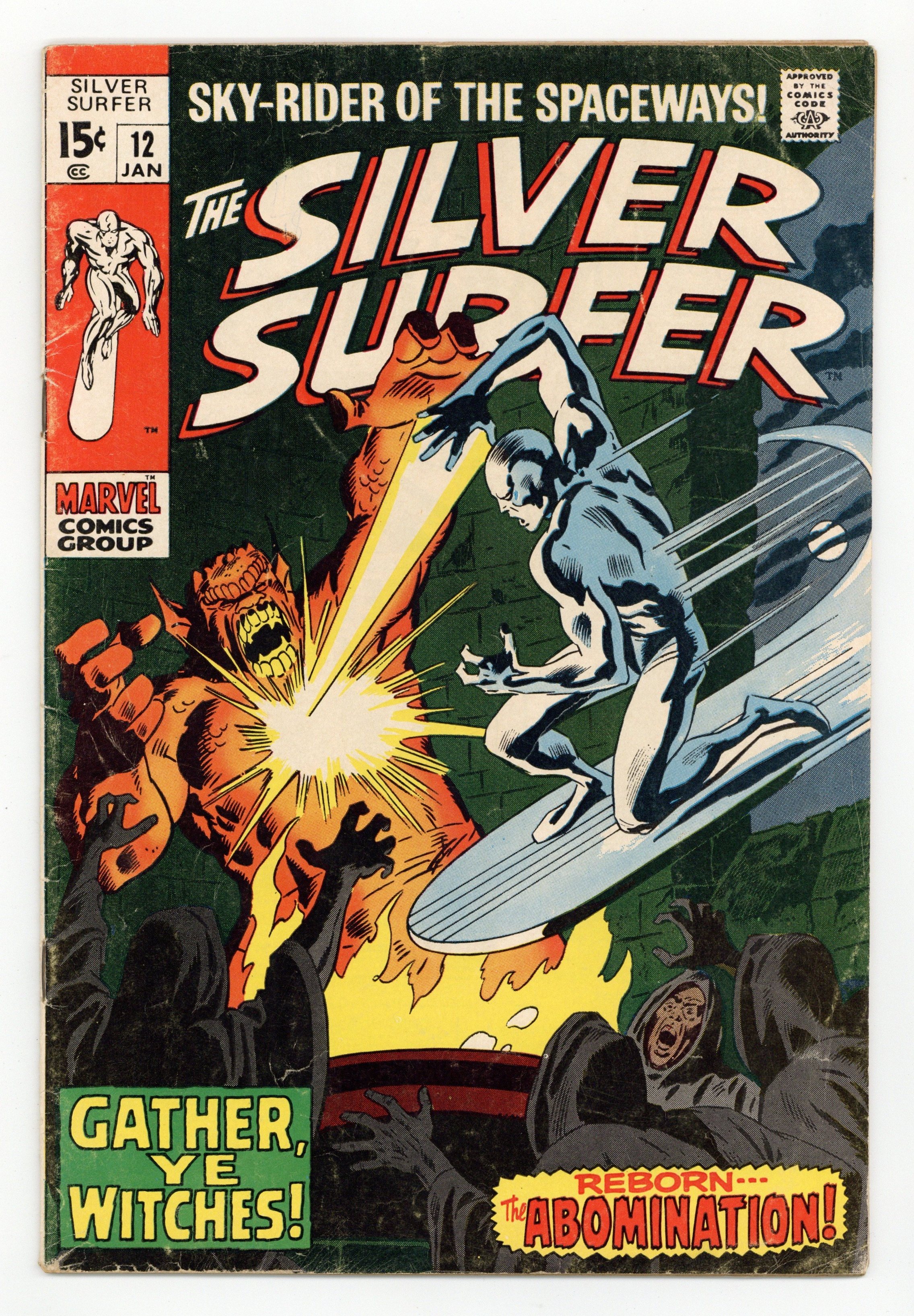 "Gather, Ye Witches!" Written by Stan Lee. Art by John Buscema and Dan Adkins. Can even the Silver Surfer hope to survive an encounter with the awesome might of the Abomination, a creature whose strength rivals that of the Incredible Hulk himself? Cover price $0.15.