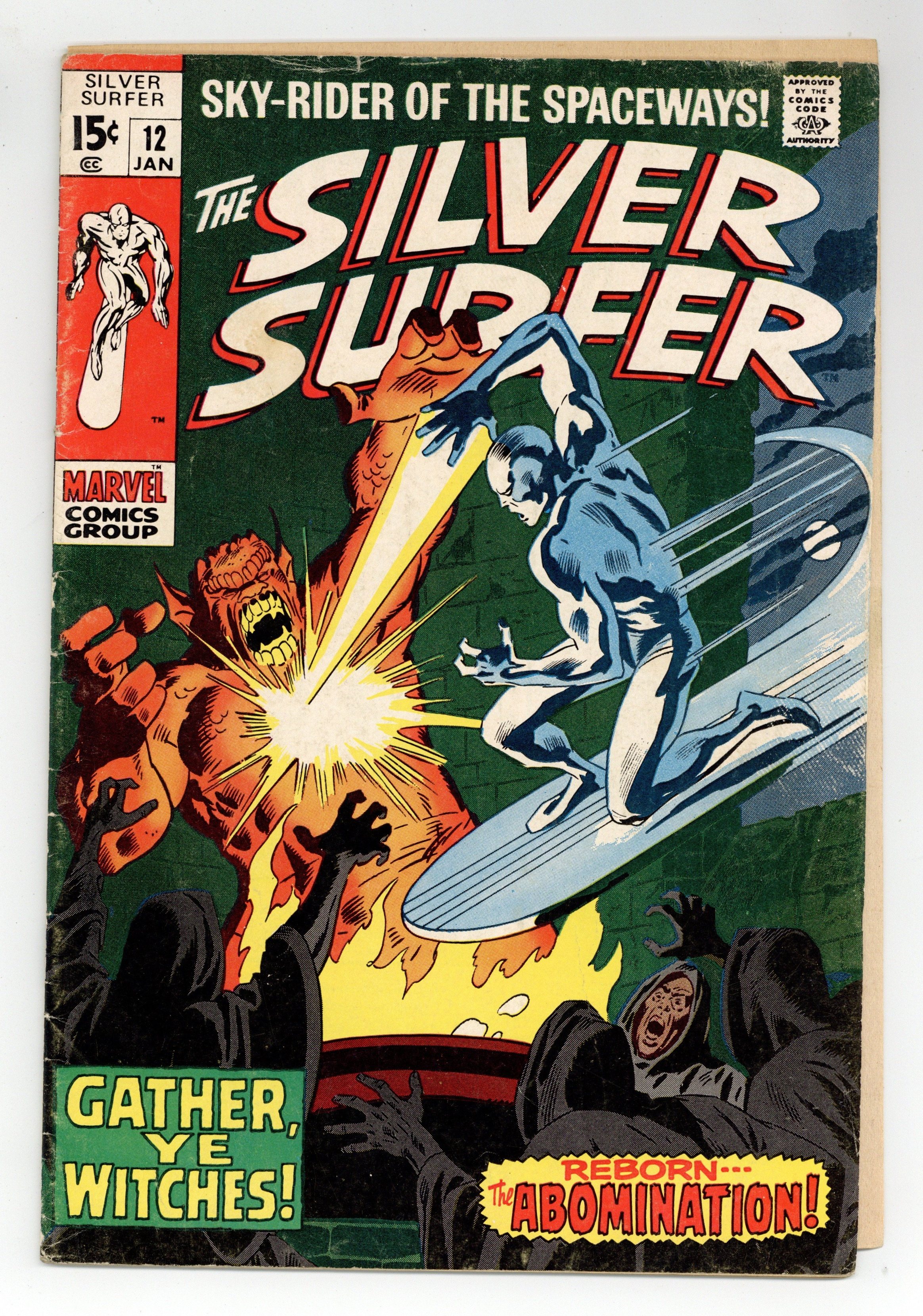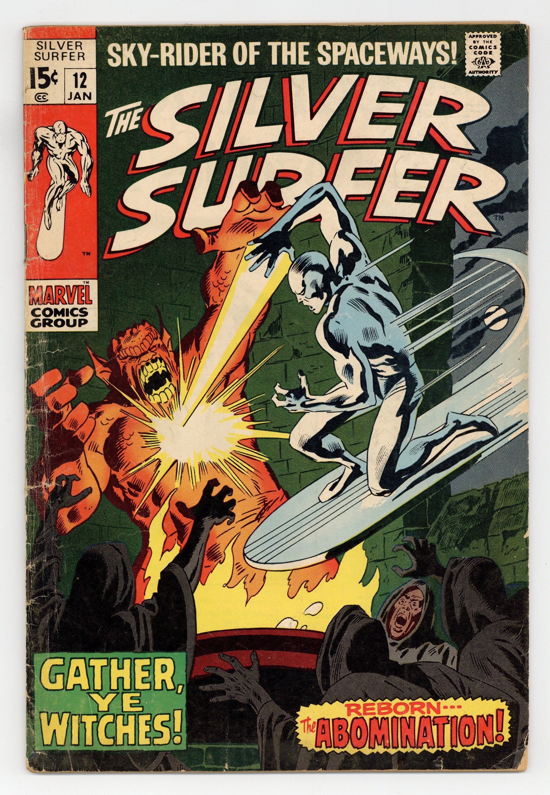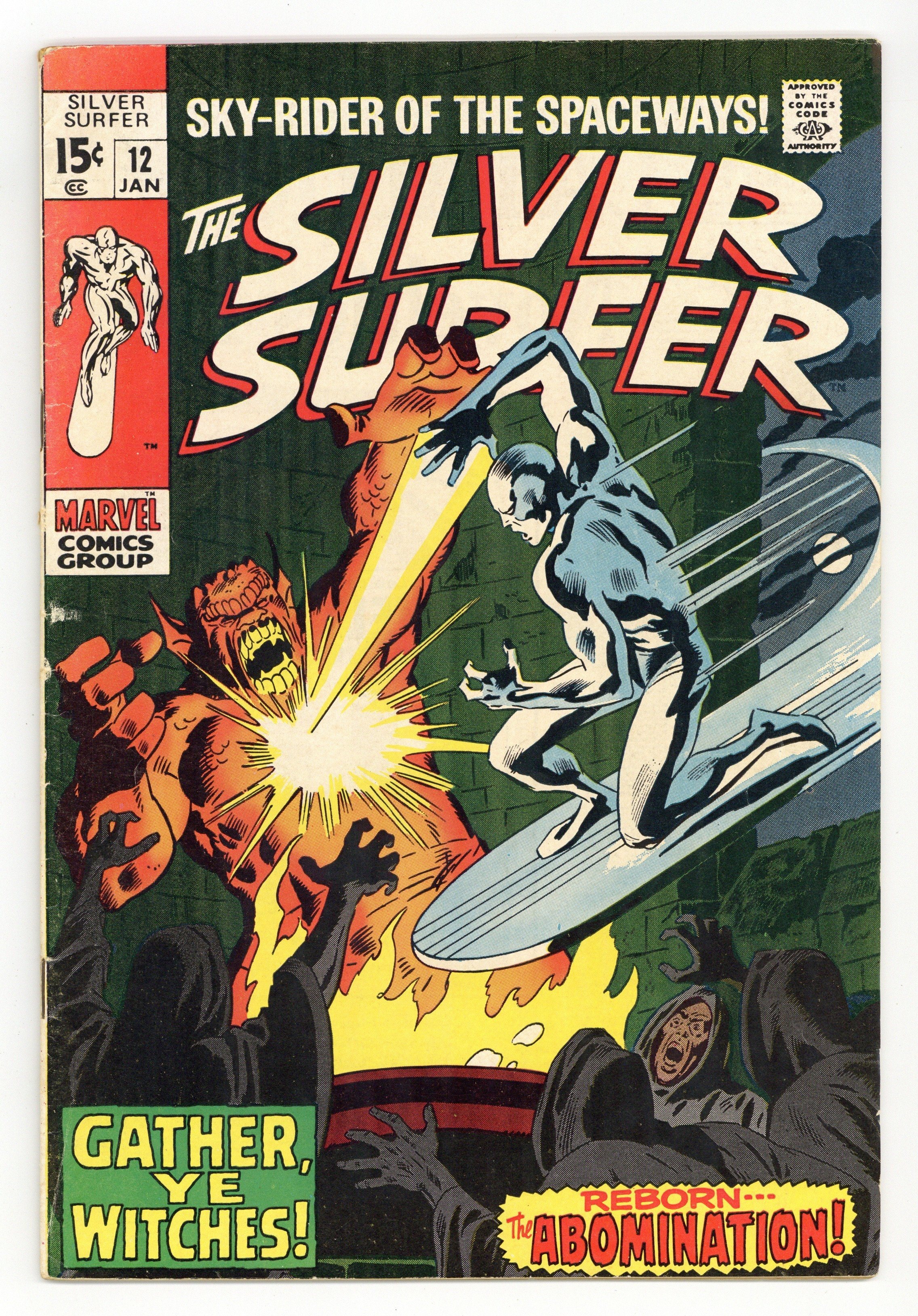 "Gather, Ye Witches!" Written by Stan Lee. Art by John Buscema and Dan Adkins. Can even the Silver Surfer hope to survive an encounter with the awesome might of the Abomination, a creature whose strength rivals that of the Incredible Hulk himself? Cover price $0.15.