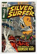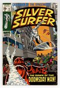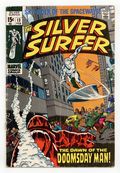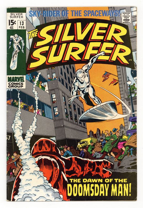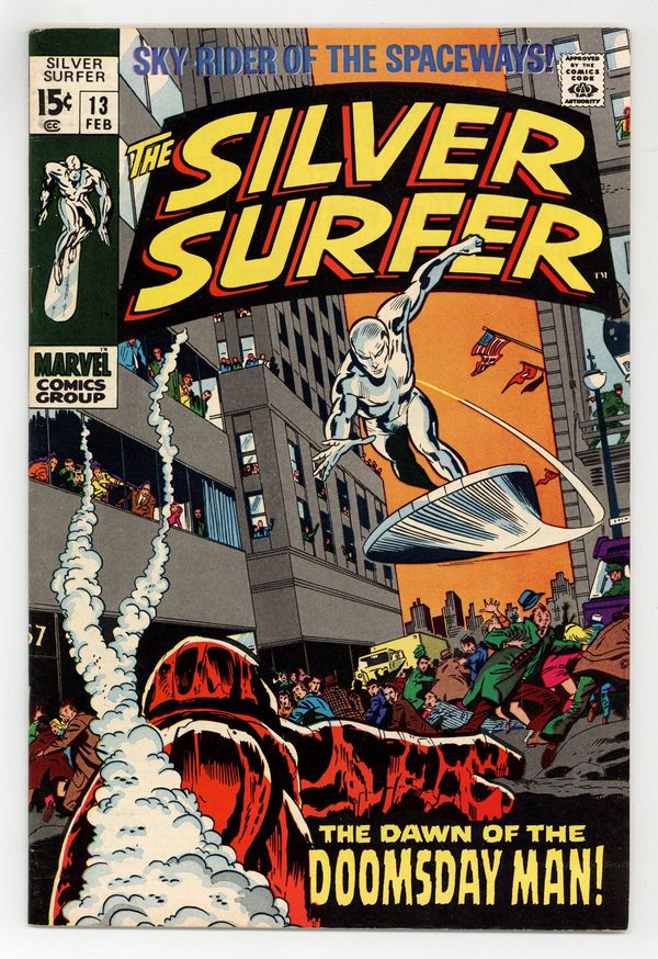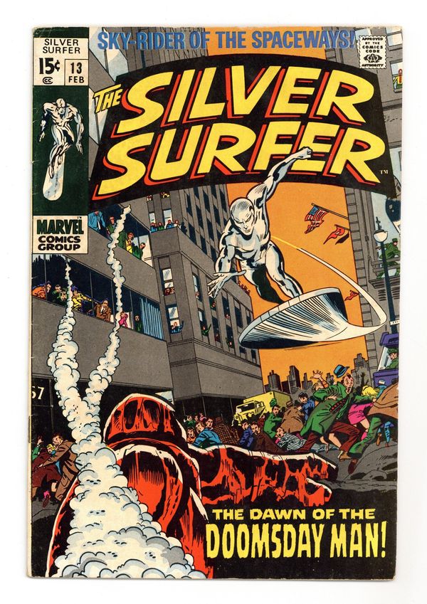 "The Dawn of the Doomsday Man!" Written by Stan Lee. Art by John Buscema and Dan Adkins. The ground rumbles and the citizens of New York City tremble in fear as the monstrosity known as the Doomsday Man rise from the bowels of the earth. Only the Silver Surfer, a being whom the people of Earth have ridiculed and alienated time and again, can save them now. Cover price $0.15.