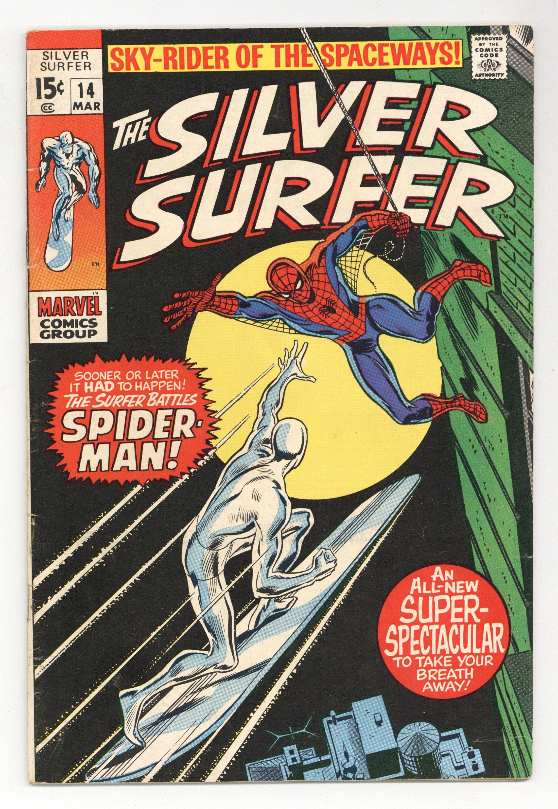 "The Surfer and the Spider!" Guest-starring Spider-Man. Captain America cameo. Written by Stan Lee. Art by John Buscema and Dan Adkins. A misunderstanding sets the Amazing Spider-Man against the awesome power of the Silver Surfer. Letters to the editor from comic writers Doug Moench and Alan Brennert. Cover price $0.15.