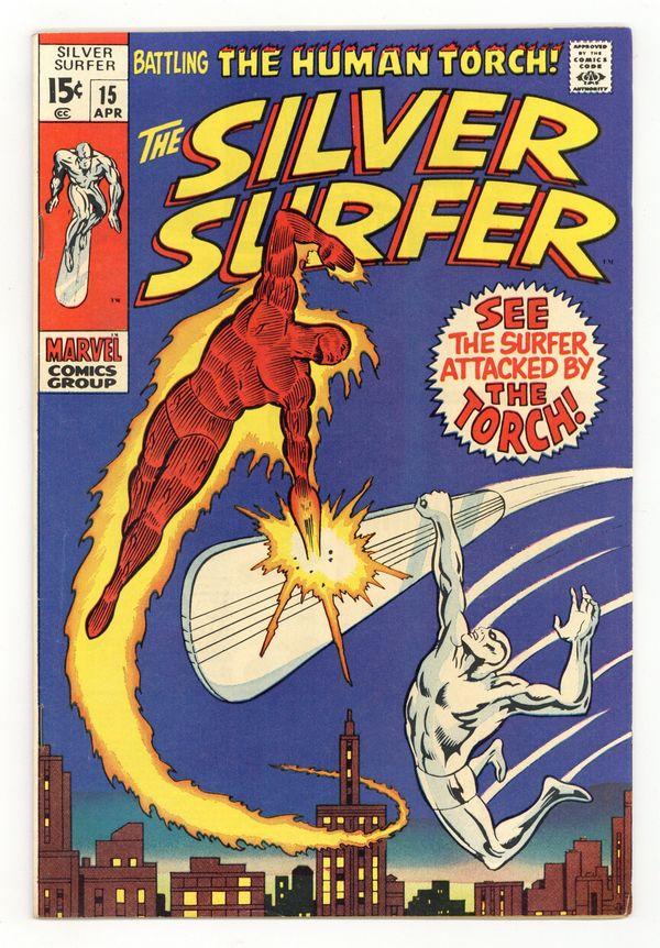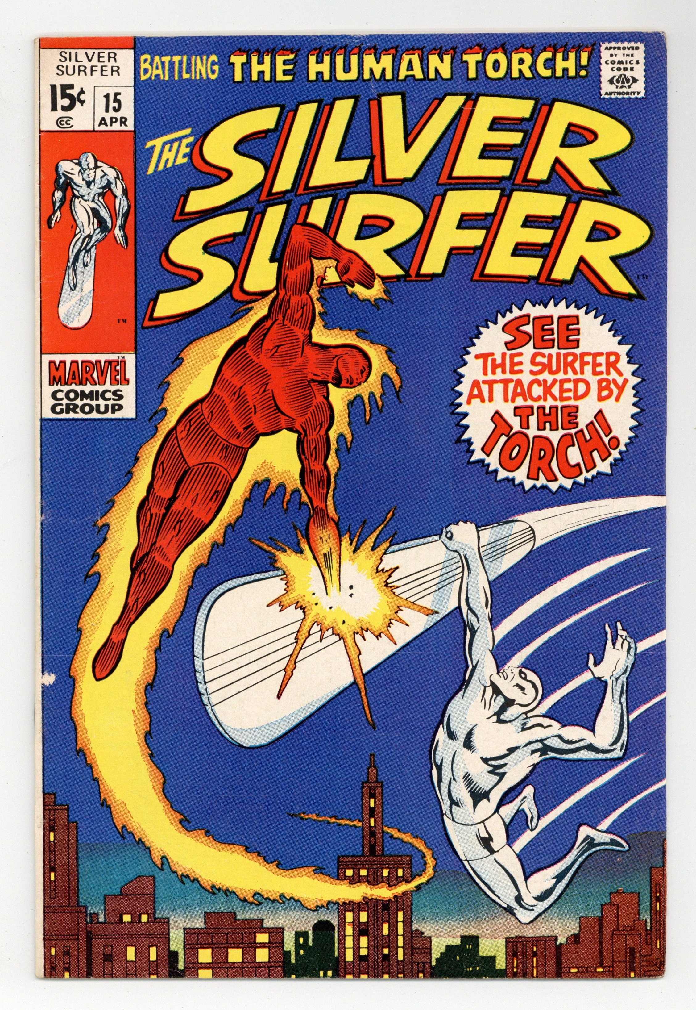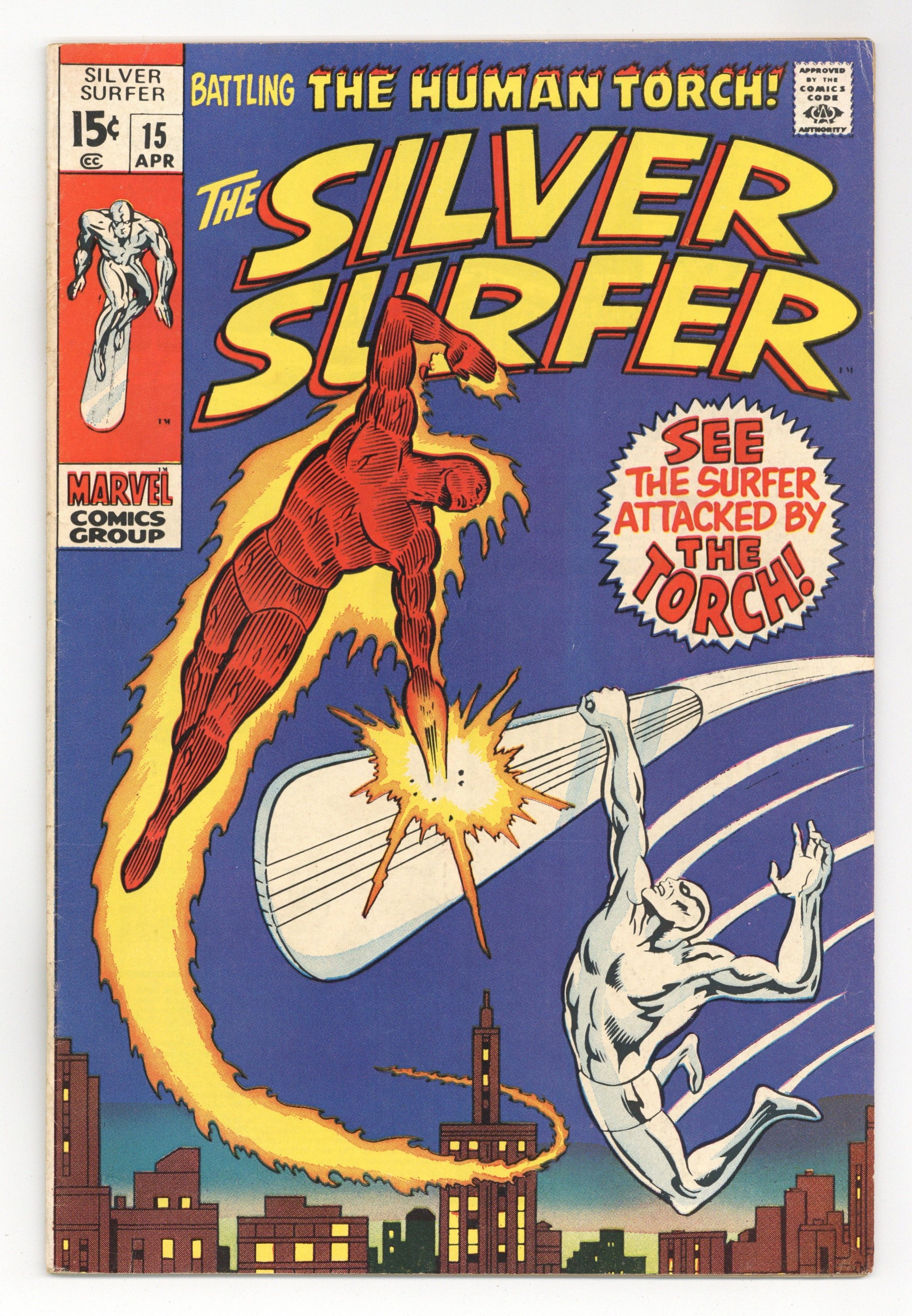 Starts Apr 4 Cover pencils by Marie Severin, inks by Joe Sinnott. The Flame and the Fury!, script by Stan Lee, pencils by John Buscema, inks by Dan Adkins; The Silver Surfer tries to ask the Fantastic Four for help and ends up battling the Human Torch. Cameos by Spider-Man, the Overlord, the Stranger, Mephisto, and Galactus. 36 pgs. $0.15. Cover price $0.15.
