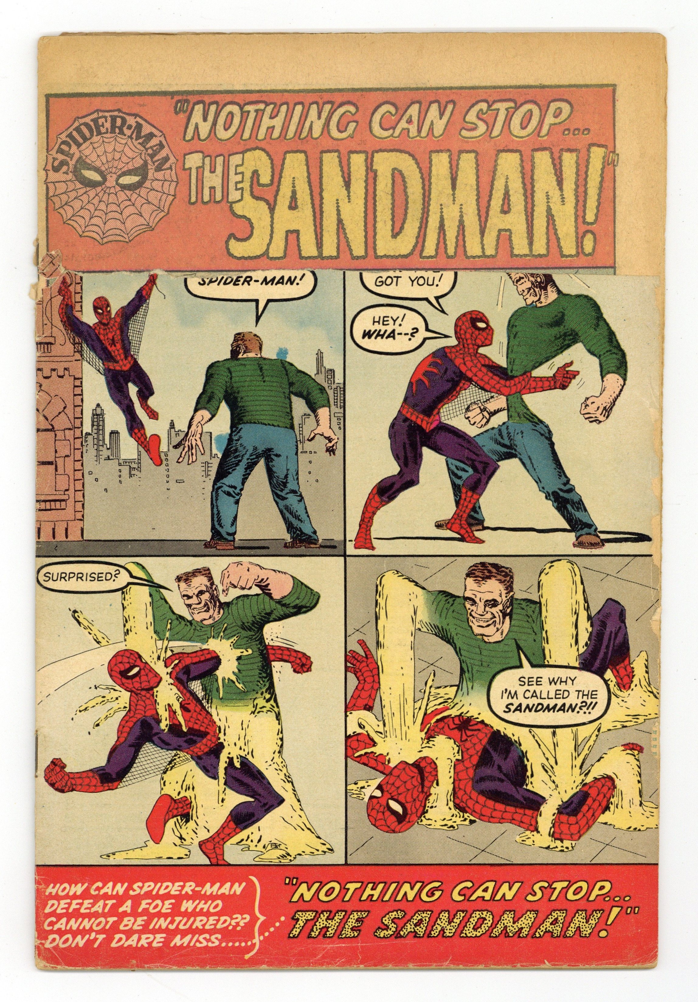 Cover art by Steve Ditko. First appearance of the Sandman in Nothing Can Stop The Sandman!, script by Stan Lee, art by Steve Ditko; The Sandman tries to hide from police in the high school where Peter Parker goes to school. Intro Betty Brant and Liz Allen. Reprinted in Marvel Tales # 141. 36 pgs. $0.12. Cover price $0.12.