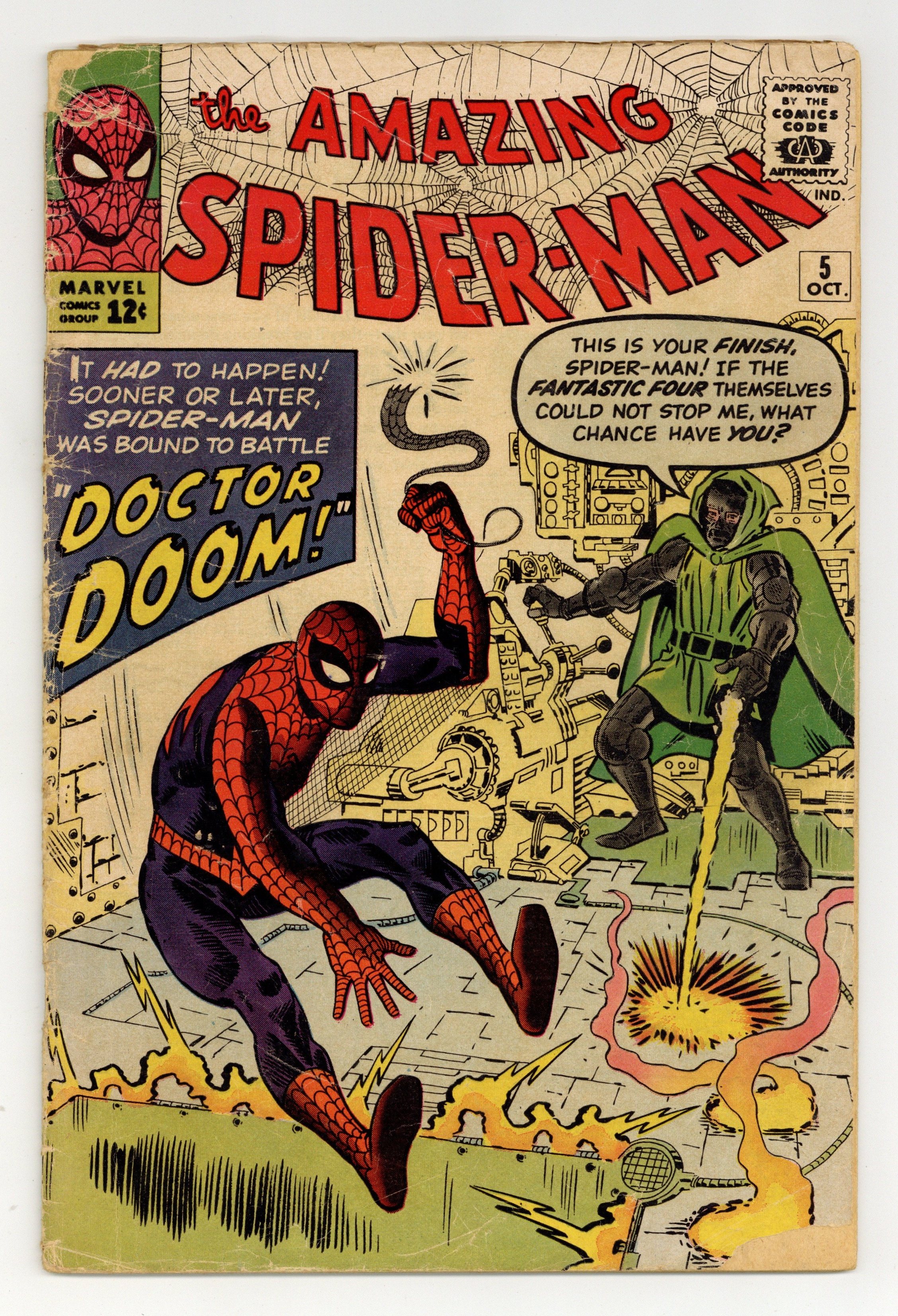Cover art by Steve Ditko. Marked for Destruction by Doctor Doom!, script by Stan Lee, art by Steve Ditko; Dr. Doom tries to trick Spider-Man into helping him defeat the Fantastic Four; When Spider-Man turns him down, he decides to capture Spider-Man; Flash Thompson dresses up as Spider-Man for a prank and Dr. Doom mistakes him for the real Spider-Man and captures him instead, and Flash has to be saved by the real Spider-Man. First Time Doctor Doom uses a robot to take his place. Reprinted in Marvel Tales # 142. 36 pgs. $0.12. Cover price $0.12.