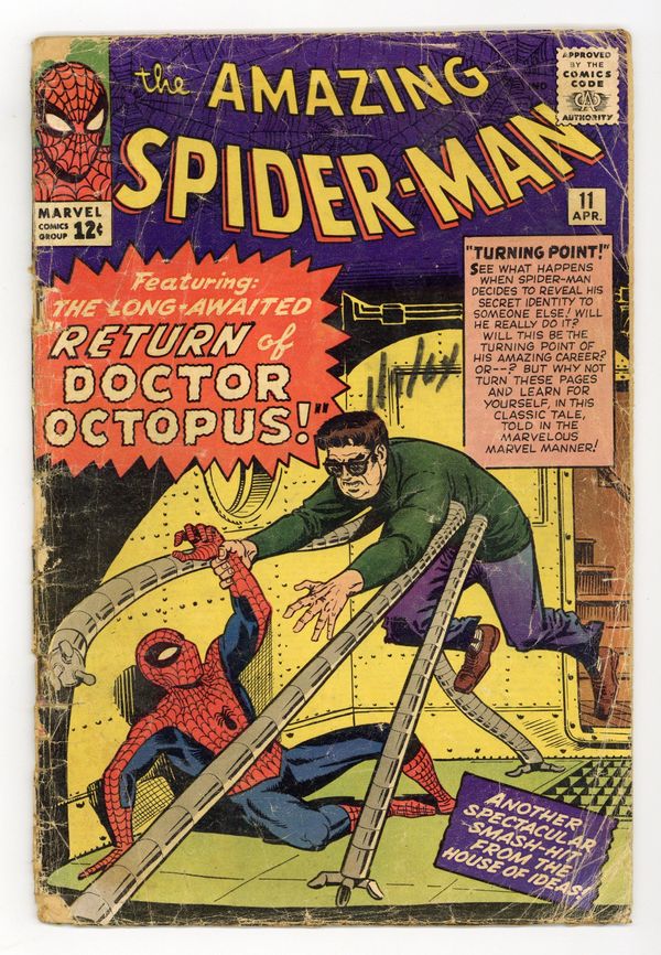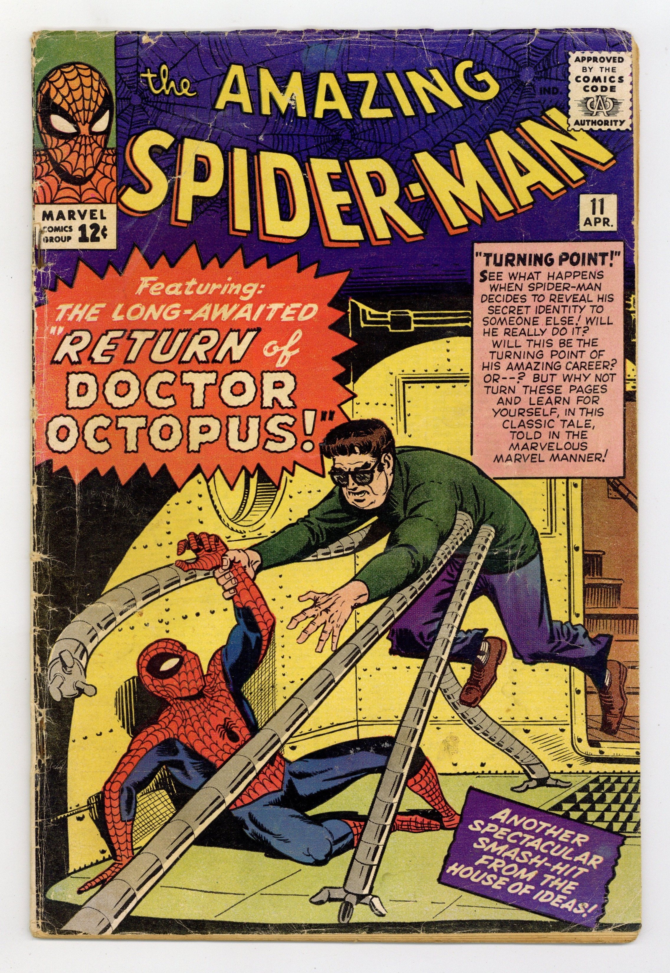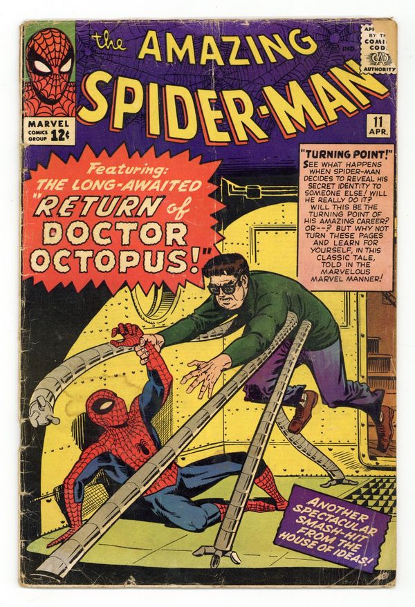Cover art by Steve Ditko and Jack Kirby. Turning Point, script by Stan Lee, art by Steve Ditko; Betty's brother has gotten himself into trouble with gambling debts and Betty is forced to help in Doc Ock's plot to break Blackie Gaxton out of prison to keep her sibling alive; Spider-Man interrupts the escape and Blackie shoots Bennett during the conflict; Gaxton is captured but Doc Ock gets away; Peter tries to comfort Betty over the loss of her brother. Reprinted in Marvel Tales # 148. House ads for Avengers #4 and Daredevil #1. Letter to the editor from comics artist Ken Landgraf. 36 pgs. $0.12. Cover price $0.12.