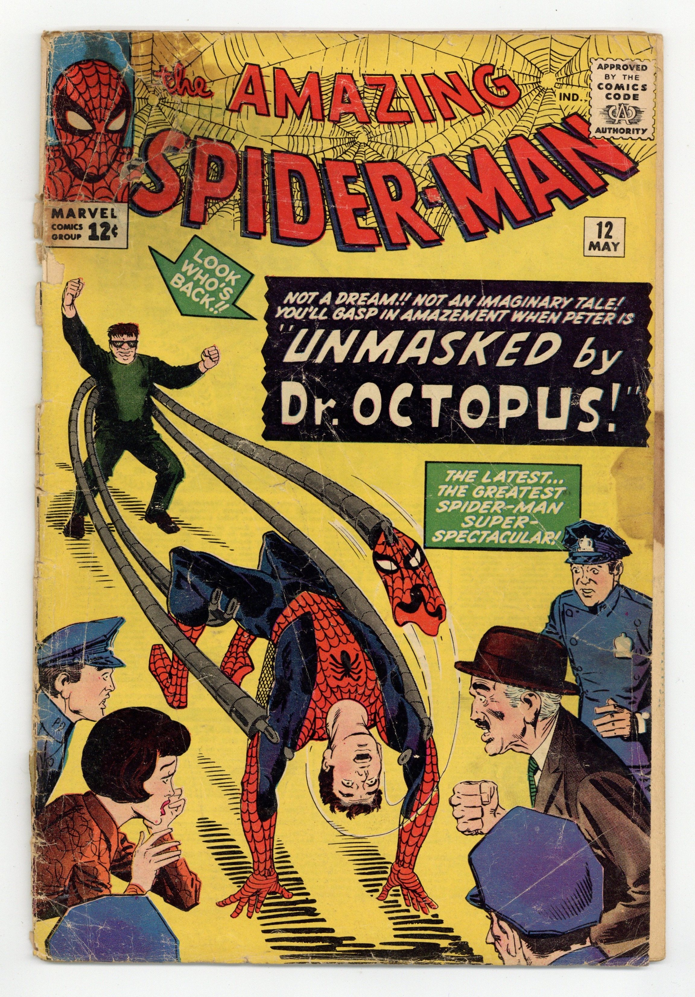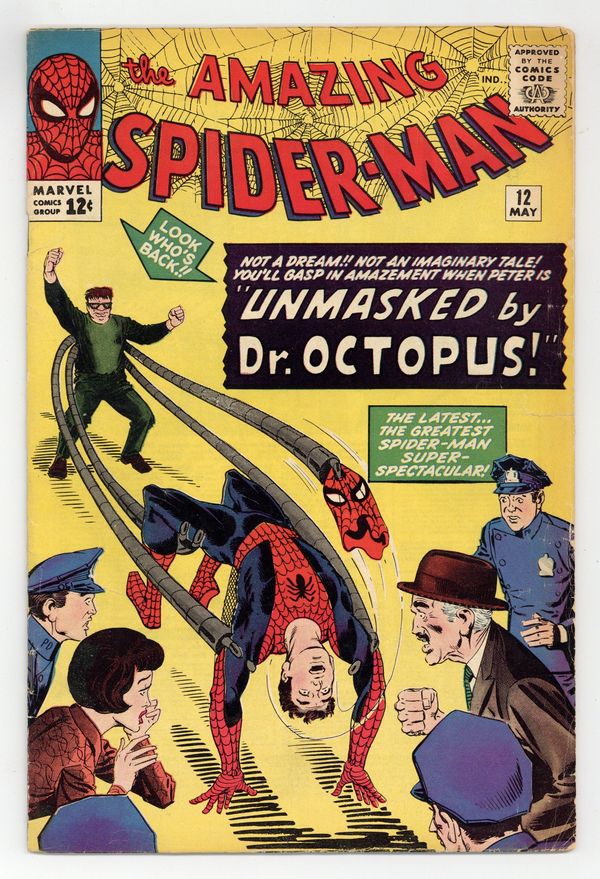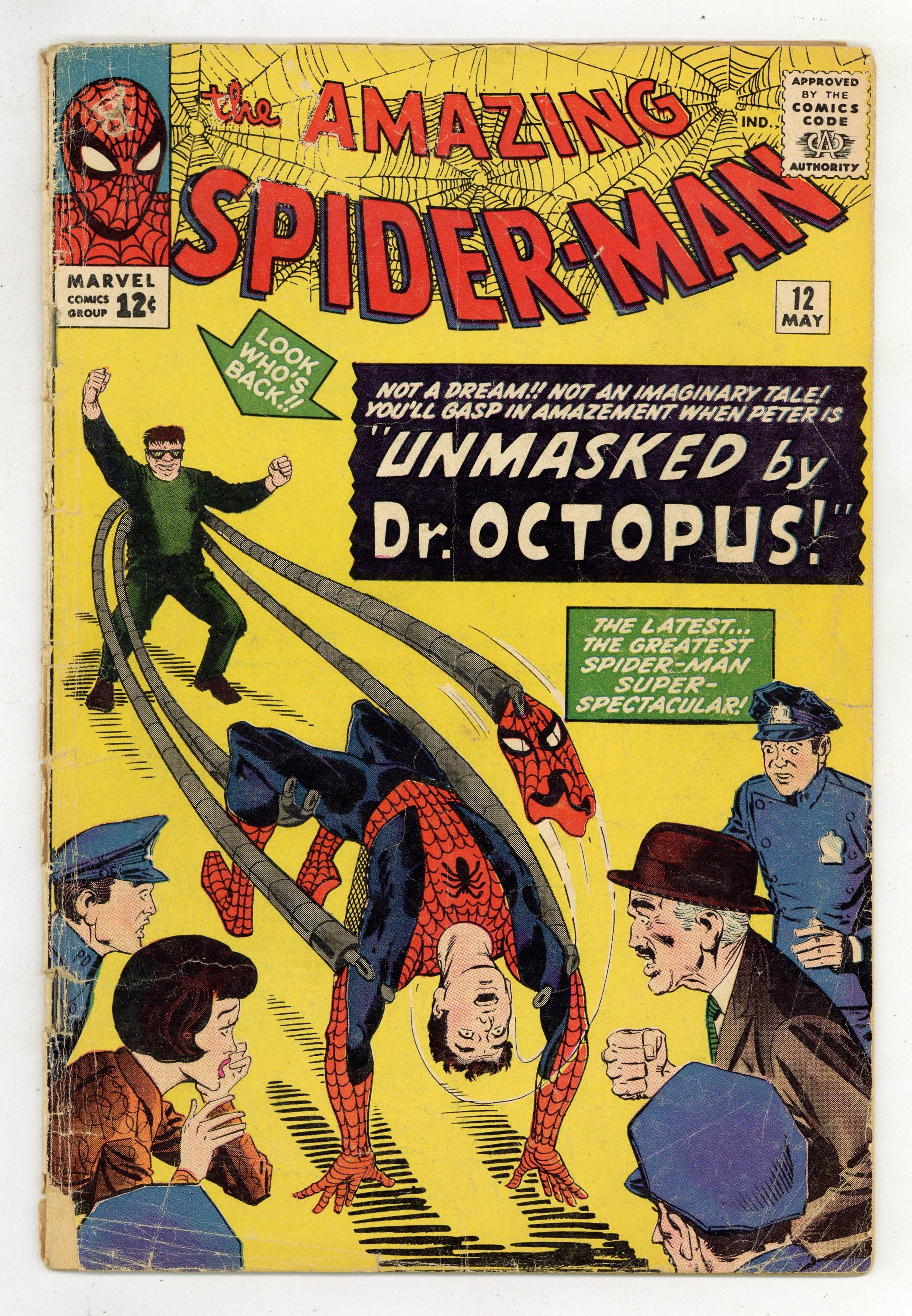 Cover art by Steve Ditko. Unmasked by Dr. Octopus!, script by Stan Lee, art by Steve Ditko; Peter has the 24 hour flu when Doc Ock captures Betty Brant in hopes of luring Spider-Man into battle; Ock beats the under the weather web-head and unmasks him, but everyone thinks it is just Peter trying to be brave by impersonating Spidey; Once he has recovered, Spider-Man battles through the wild animals Ock has released from the zoo to take on old six-arms himself. Reprinted in Marvel Tales # 149. Letter to the editor from comics artist Dave Cockrum. 36 pgs. $0.12. Cover price $0.12.