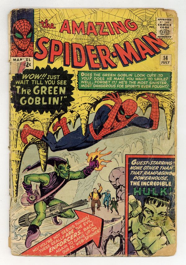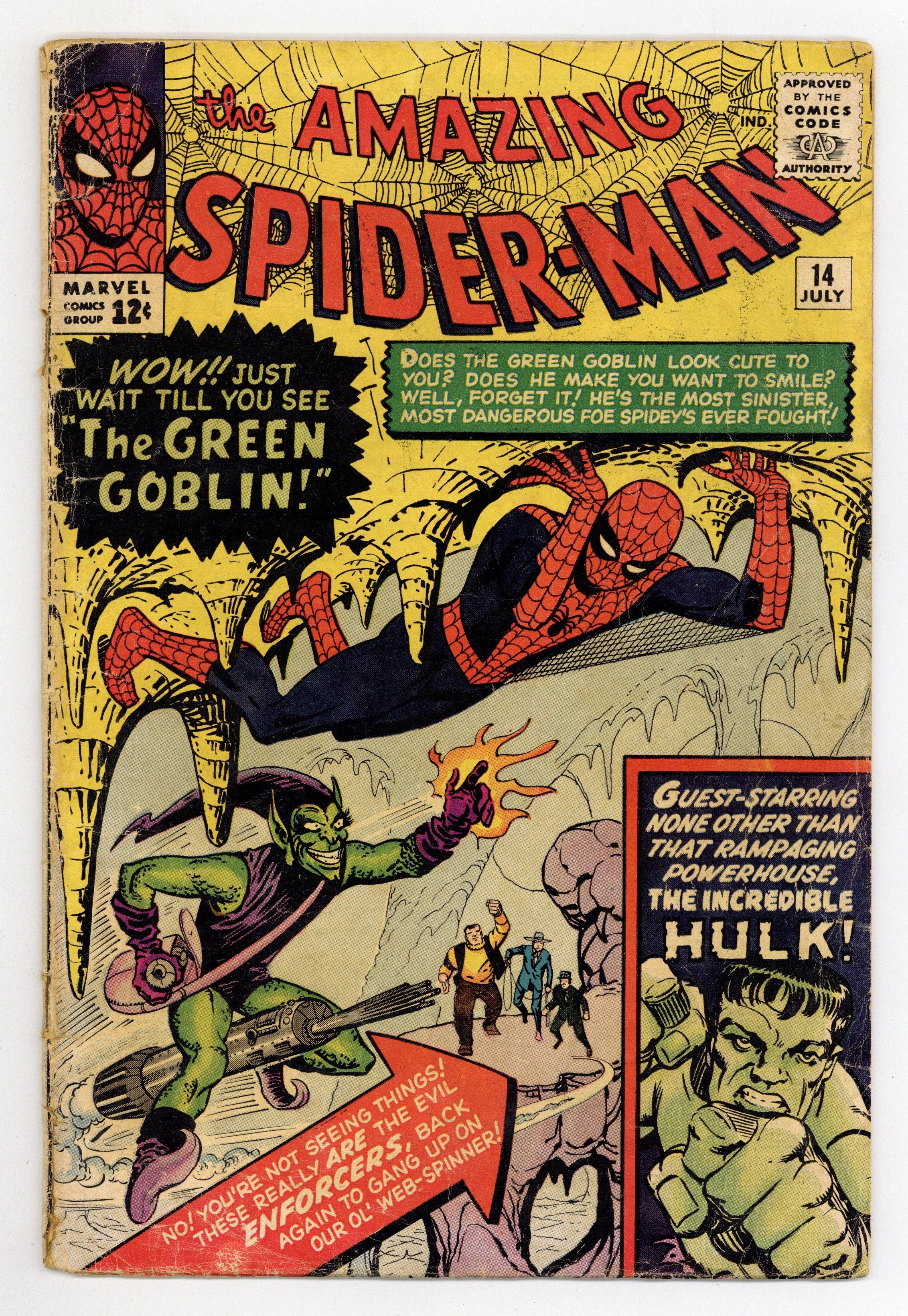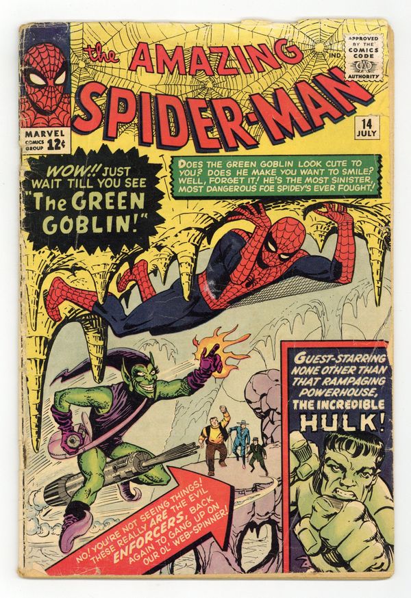 Cover art by Steve Ditko. First appearance of the Green Goblin (Norman Osborn) in The Grotesque Adventure of the Green Goblin!, script by Stan Lee, art by Steve Ditko; The Green Goblin hires the Enforcers to help him defeat Spider-Man; To further his plan he convinces B.J. Cosmos to film a movie of Spider-Man fighting Goblin and the Enforcers in the desert; While filming, Goblin and the Enforcers attack Spider-Man and accidentally awaken the Hulk. Reprinted in Marvel Tales # 9 and 152. 36 pgs. $0.12. Cover price $0.12.