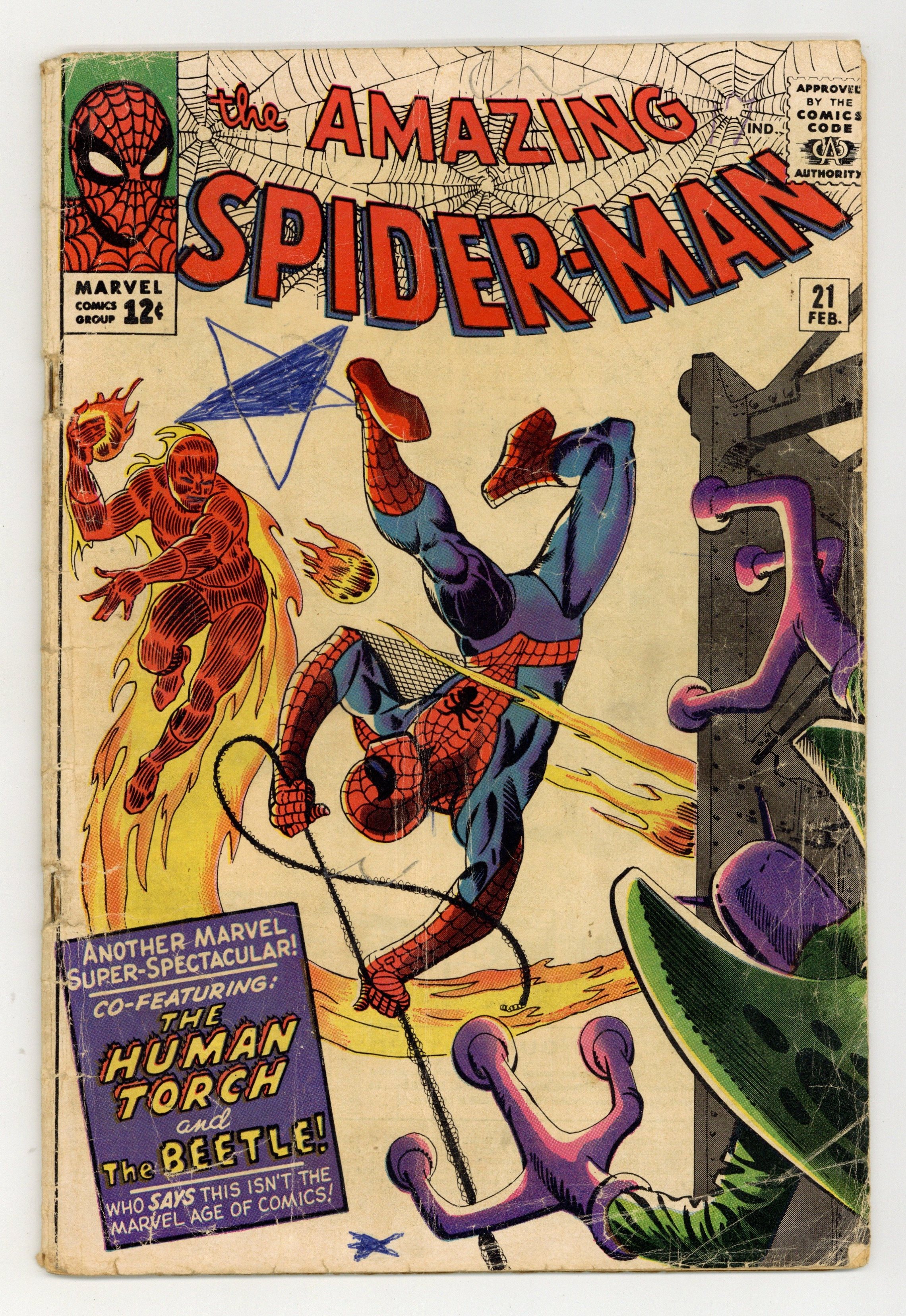 Starts Jan 3 Cover art by Steve Ditko. Second appearance of the Beetle in Where Flies the Beetle...!, script by Stan Lee, art by Steve Ditko; after getting out of jail, Abner Jenkins dons his Beetle guise and prepares for revenge on the Human Torch; drama between Johnny Storm and Doris Evans and Peter Parker and Betty Brant; Human Torch teams with Spidey against Beetle. Reprinted in Marvel Tales # 16 and 159. Spider-Man pin-up by Ditko. 36 pgs. $0.12. Cover price $0.12.