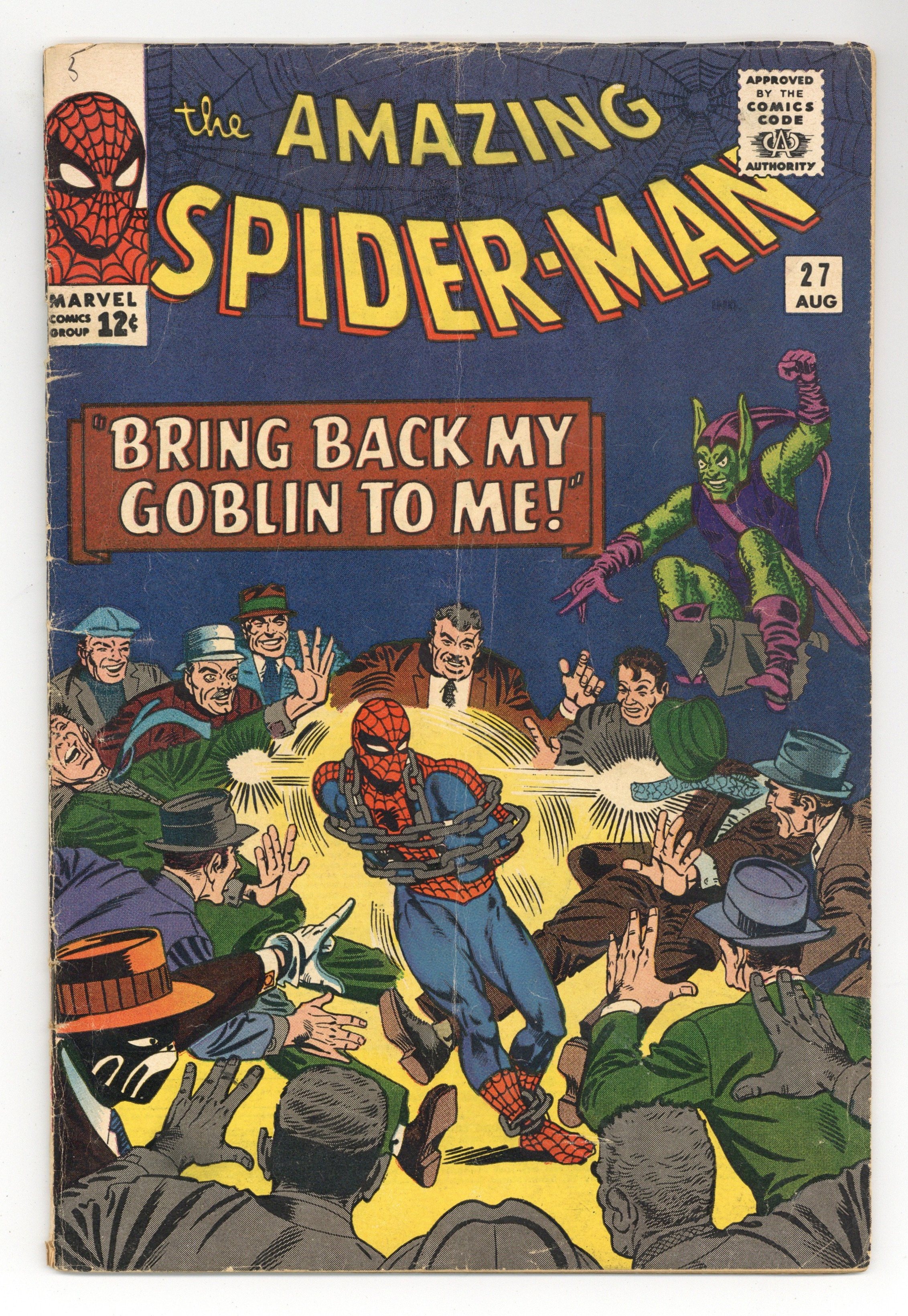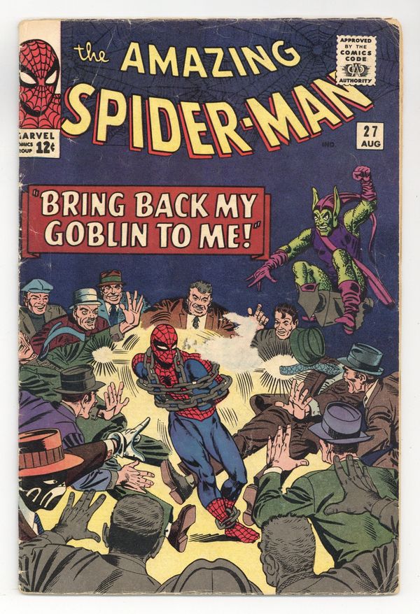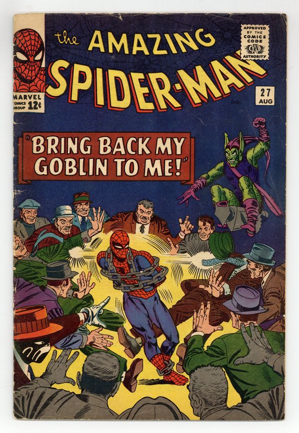 Cover by Steve Ditko. Fifth appearance of the Green Goblin in "Bring Back My Goblin to Me," script by Steve Ditko (plot) and Stan Lee (script), art by Steve Ditko; Spider-Man is caught between the Green Goblin and the Crime-Master. The Merry Marvel Bullpen Page; Ads for Spider-Man T-Shirt and MMMS fan club. Reprinted in Marvel Tales # 22 and 165. 36 pgs., full color. $0.12. Cover price $0.12.