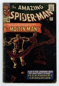 Tags: Marvel Legacy Numbering: Amazing Spider-Man (part 28), Spider-Man$90.00Cover art by Steve Ditko. First appearance of the Molten Man in "The Menace of the Molten Man!", script by Steve Ditko (plot) and Stan Lee (script), art by Steve Ditko; Peter Parker needs his old costume, so he goes to the lab of the inventor Smythe, who created the robot J. Jonah Jameson used to try and beat Spiderman with; During that battle Parker had to remove his costume in order to escape; While there he witnesses an argument between Smythe and a man named Raxton, which results in an accident turning Raxton into, the Molten Man; At first Raxton is confused when he walks out of the lab, but on the street he gets mad at a driver and smashes the car with his fists; Realizing his power Raxton decides he can be a super villain, but before he can do anything Spiderman comes in through his window and asks Raxton to turn himself in stating that so far no major crimes have been committed; A fight ensues; Peter graduates from high school. The Merry Marvel Bullpen Page. Reprinted in Marvel Tales #166. This is a very difficult book to find in the higher grades because the black cover easily shows virtually every imperfection, no matter how minor. 36 pgs., full color. Cover price $0.12.