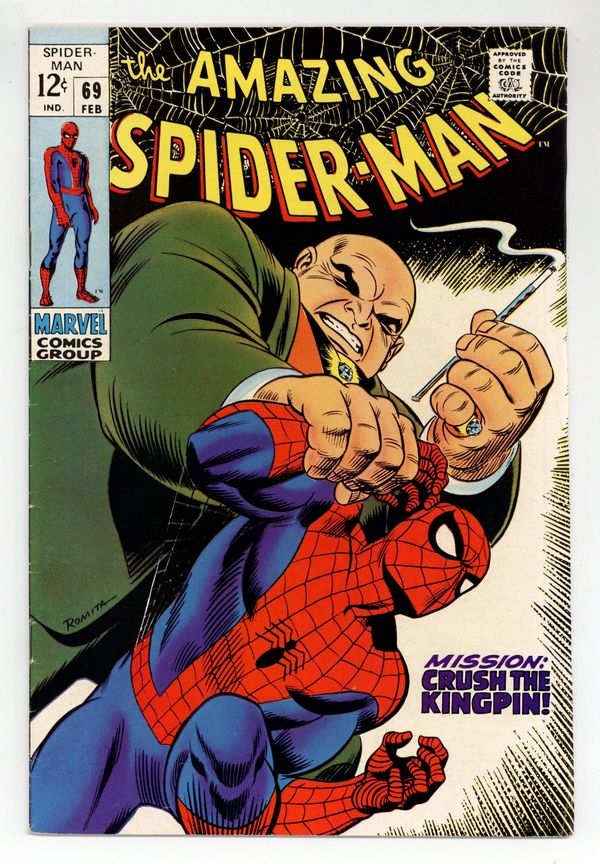 "Mission: Crush the Kingpin!" Part 2 of 3. Plot by John Romita. Script by Stan Lee. Art by John Romita (layouts) and Jim Mooney (finishes). Cover by John Romita. The Spectacular Spider-Man is on the hunt for the Kingpin-- after the crime boss stole the ancient clay tablet from the ESU exhibit hall. However the Kingpin actually wants the web-slinger to find him, so he can polish off the wall-crawler permanently! When the amazing one locates Wilson Fisk's hideaway...another great battle between Spider-Man and the Kingpin erupts! Who will win this time? And where is the clay tablet? Cameo appearances by Captain Stacy, Gwen Stacy, J. Jonah Jameson, Joe Robertson, and Randy Robertson. (Notes: The first mention of the Kingpin's wife occurs in this issue. The letters page includes a letter from comics artist Kerry Gammill. This story was reprinted in Marvel Tales #52.) 36 pages. Cover price $0.12.