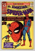 Cover art by Steve Ditko. Doctor Strange guest stars in an all-new 20-page story, "The Wondrous World of Doctor Strange!", script by Stan Lee, art by Steve Ditko; Xandu sends his two henchmen to retrieve half of the Wand of Watoomb from Dr. Strange; Spider-Man mistakes the henchmen for burglars and tries to stop them, leading to a team up between Spider-Man and Dr. Strange to stop Xandu's plan. Spider-Man, script by Stan Lee, art by Steve Ditko; Spider-Man rescues John Jameson, J. Jonah Jameson's son, from his malfunctioning space capsule; reprinted from Amazing Spider-Man 1. The Uncanny Threat of the Terrible Tinkerer!, script by Stan Lee, art by Steve Ditko; When Peter Parker discovers some alien modifications to a professor's radio he tracks down a group of aliens with plans to take over the Earth; reprinted from Amazing Spider-Man 2. Marked for Destruction by Dr. Doom!, script by Stan Lee, art by Steve Ditko; Dr. Doom tries to trick Spider-Man into helping him defeat the Fantastic Four. Ditko also provides 5 pages of new pin-ups (Spider-Man's famous foes). Finally, there are three reprints from Amazing Spider-Man 1 ("Spider-Man"), 2 ("The Uncanny Threat of the Terrible Tinkerer!"), and 5 ("Marked for Destruction by Dr. Doom!"). Giant 76-page special! Reprinted in Marvel Tales # 167. 76 pgs., full color. Cover price $0.25.