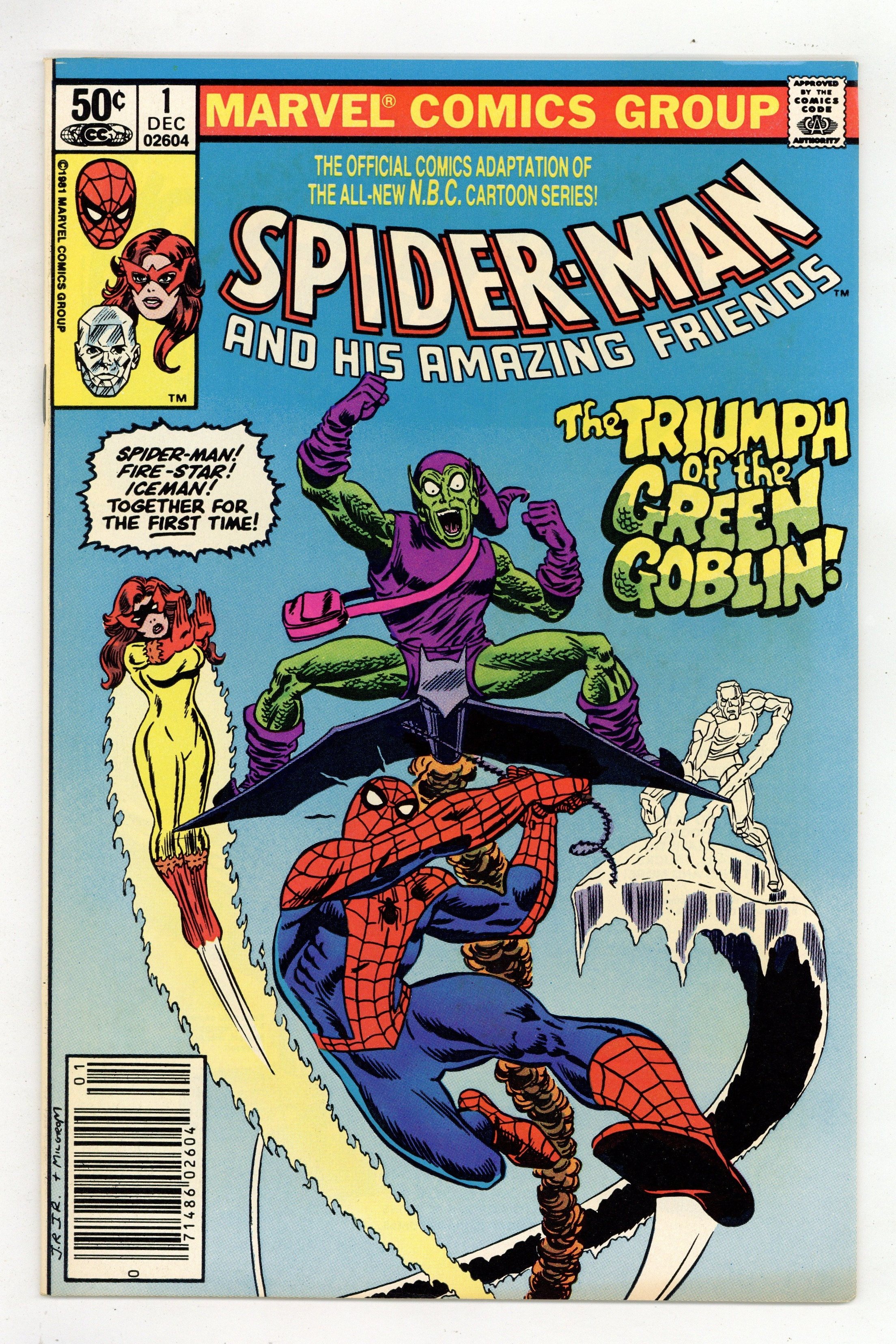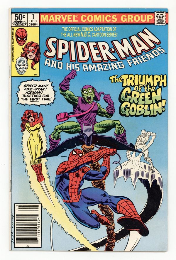 Newsstand Edition. Cover pencils by John Romita, Jr., inks by Al Milgrom. "The Triumph of the Green Goblin," script by Dennis Marks (Original Screenplay) and Tom DeFalco, pencils by Dan Spiegle, inks by Vincent Colletta; Green Goblin busts up a college costume party to steal his secret Goblin Formula. "The Hulk vs. the Phoomie Goonies" Hostess Fruit Pies ad. "Meet the Men of Marvel Productions" article; Information on Marvel Productons, includes photographs and some artwork. Based on the cartoon. 36 pgs., full color. Cover price $0.50.