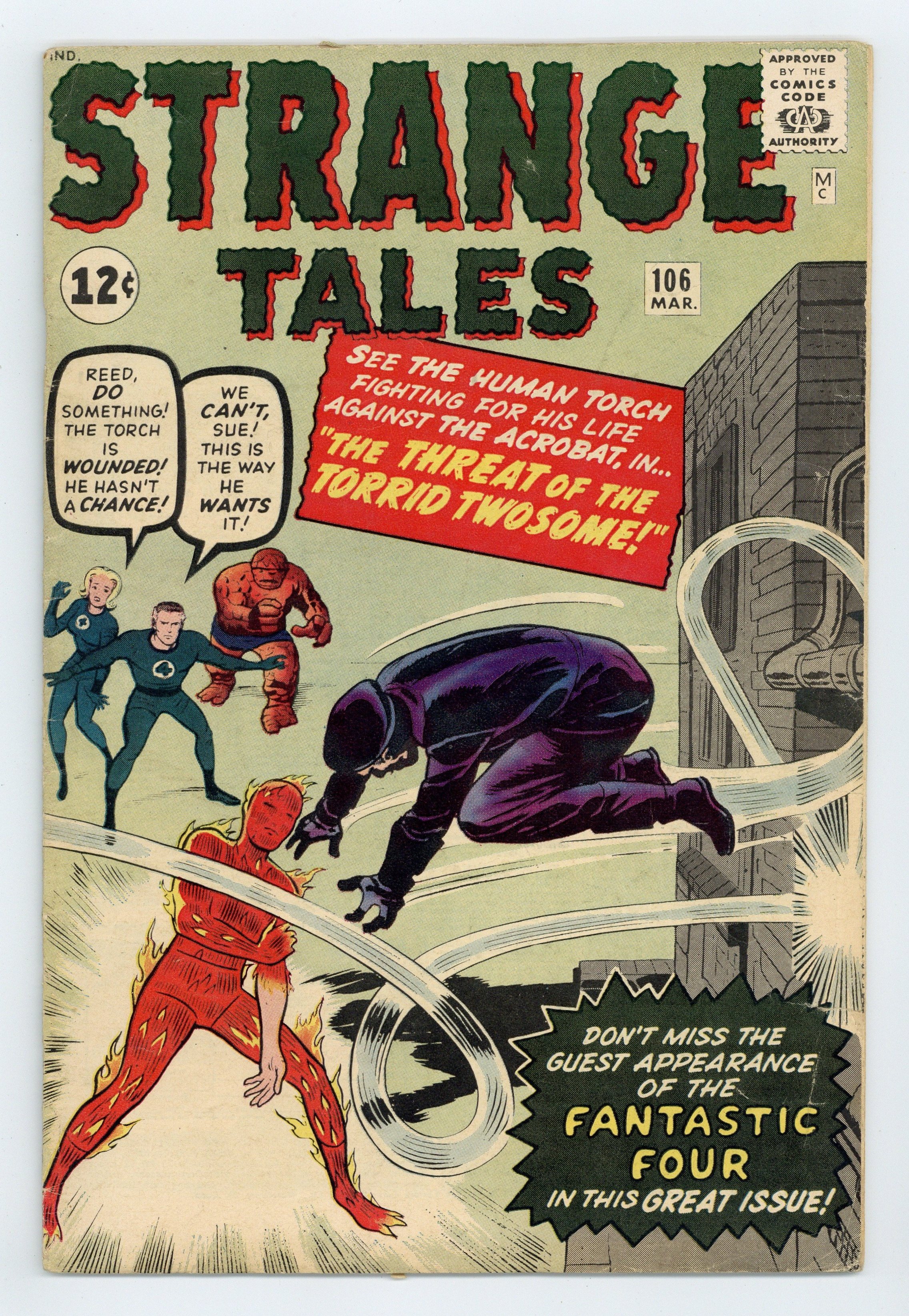 Cover pencils by Jack Kirby, inks by Dick Ayers. The Human Torch stars in "The Threat of the Torrid Twosome," script by Stan Lee (plot) and Larry Lieber (script), art by Dick Ayers; The Acrobat tricks the Human Torch into helping him rob a bank before double crossing him; The Torch chases and captures the thief with the help of the Fantastic Four. "The Recipe" text story. "Man on the Scaffold!", script by Stan Lee, art by Steve Ditko; A teller of tall tales becomes the butt of some ribbing when he tries to tell his fellow painters that he has acquired some magic paints. "The Mystery of the Purple Planet!", script by Stan Lee (plot) and Larry Lieber (script), art by Paul Reinman; A space expedition is sent to a distant planet when it is suddenly covered with an artificial mist; The team finds gold and takes it, but are transformed into aliens like the inhabitants. 36 pgs., full color. Cover price $0.12.
