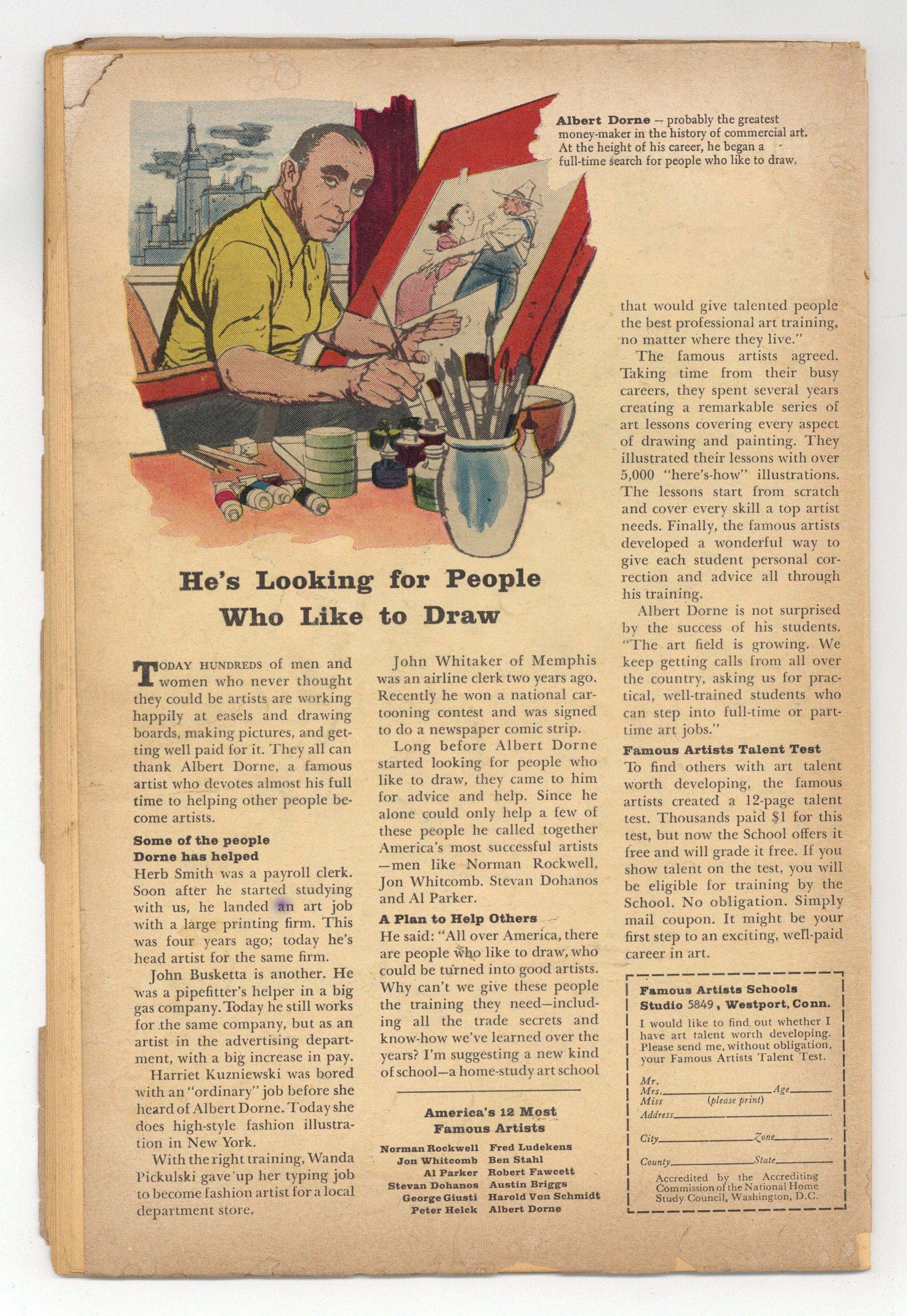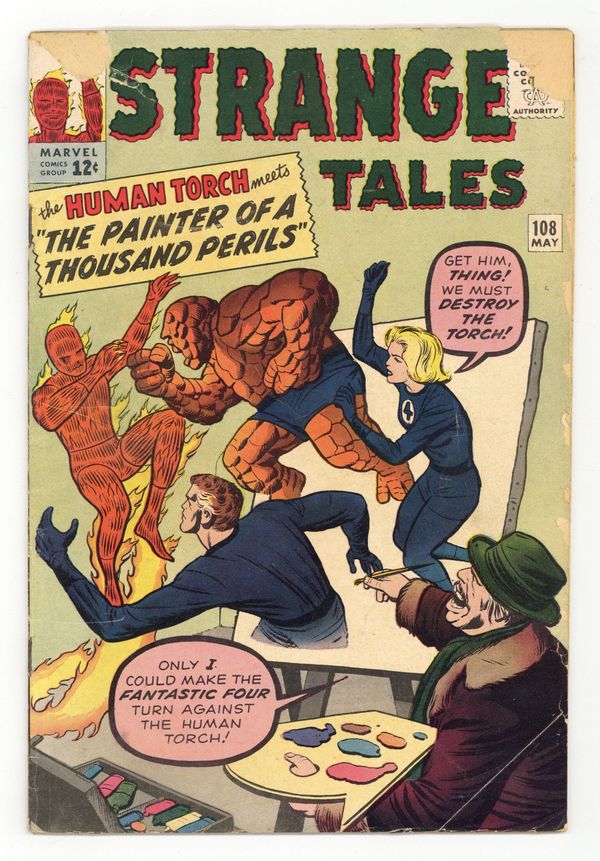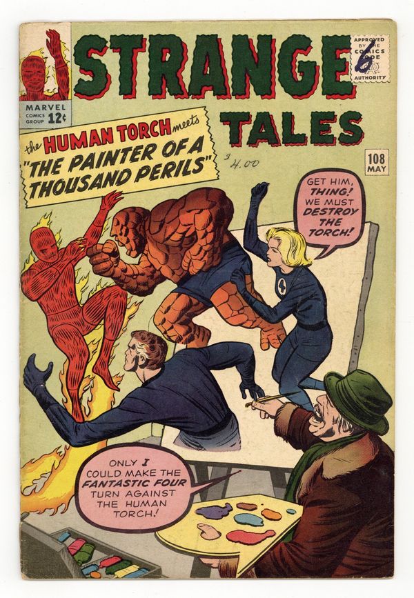 Cover pencils by Jack Kirby, inks by Dick Ayers. The Human Torch stars in "The Painter of a Thousand Perils!", script by Stan Lee (plot) and Robert Bernstein [as R. Berns] (script), pencils by Jack Kirby, inks by Dick Ayers; A counterfeiter caught by the Human Torch finds magic paints and uses them to escape from prison and strike back at the Torch; Fantastic Four guest appearance. "The Heat's On" text story, art by Don Heck. "The Silent Giant," script by Stan Lee (plot) and Larry Lieber (script), pencils by Larry Lieber, inks by Sol Brodsky; An old hermit becomes enraged that the nearby redwood tree will outlive him, but when he dies the tree transforms its friend into an immortal redwood too. "The Iron Warrior," art by Steve Ditko; A knight of King Arthur's court resents the favor shown Merlin and so challenges him to a battle; Merlin's champion, a black knight, wins the competition; The envious knight still sneers at Merlin and claims he has no true magic powers. 36 pgs., full color. Cover price $0.12.