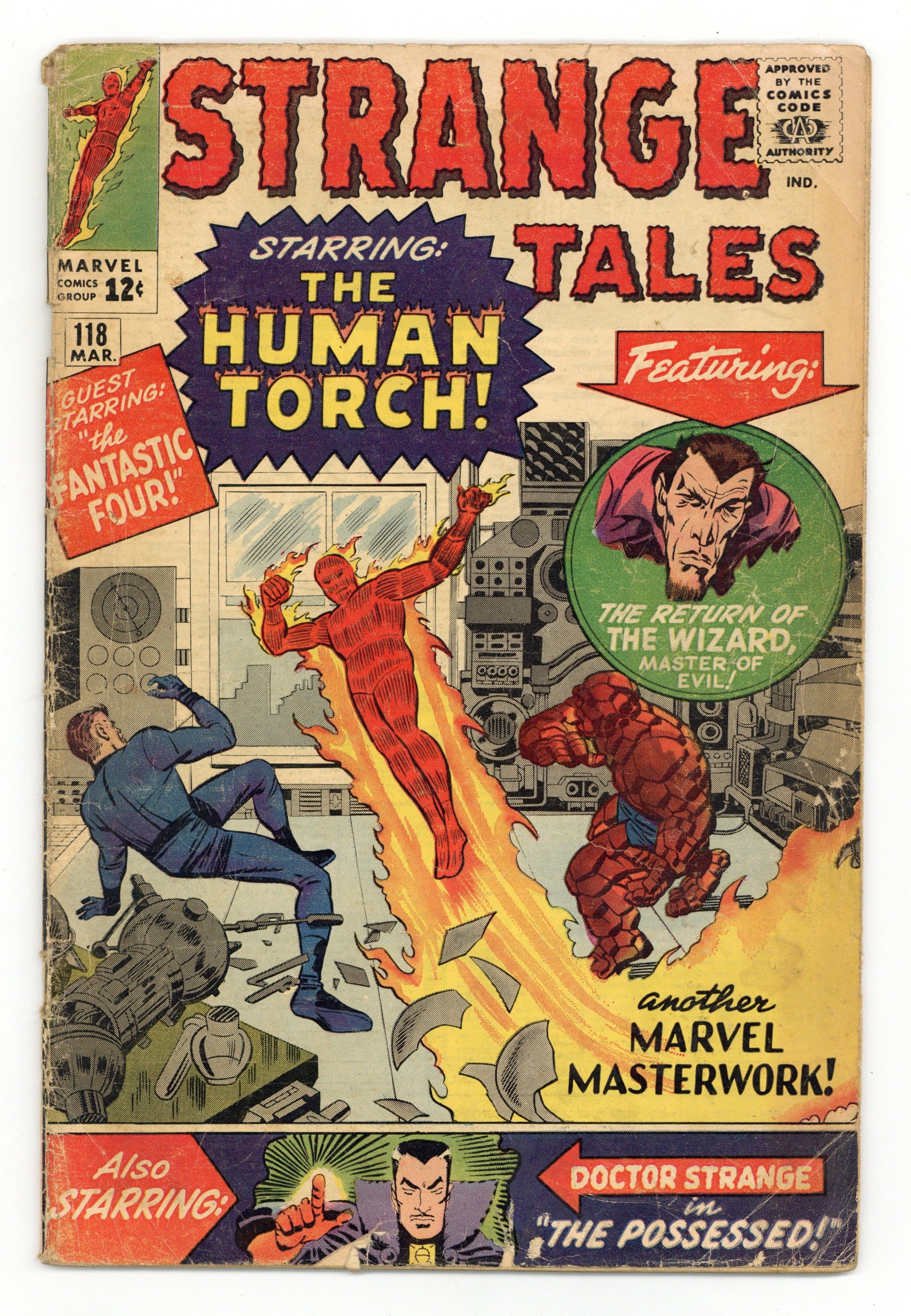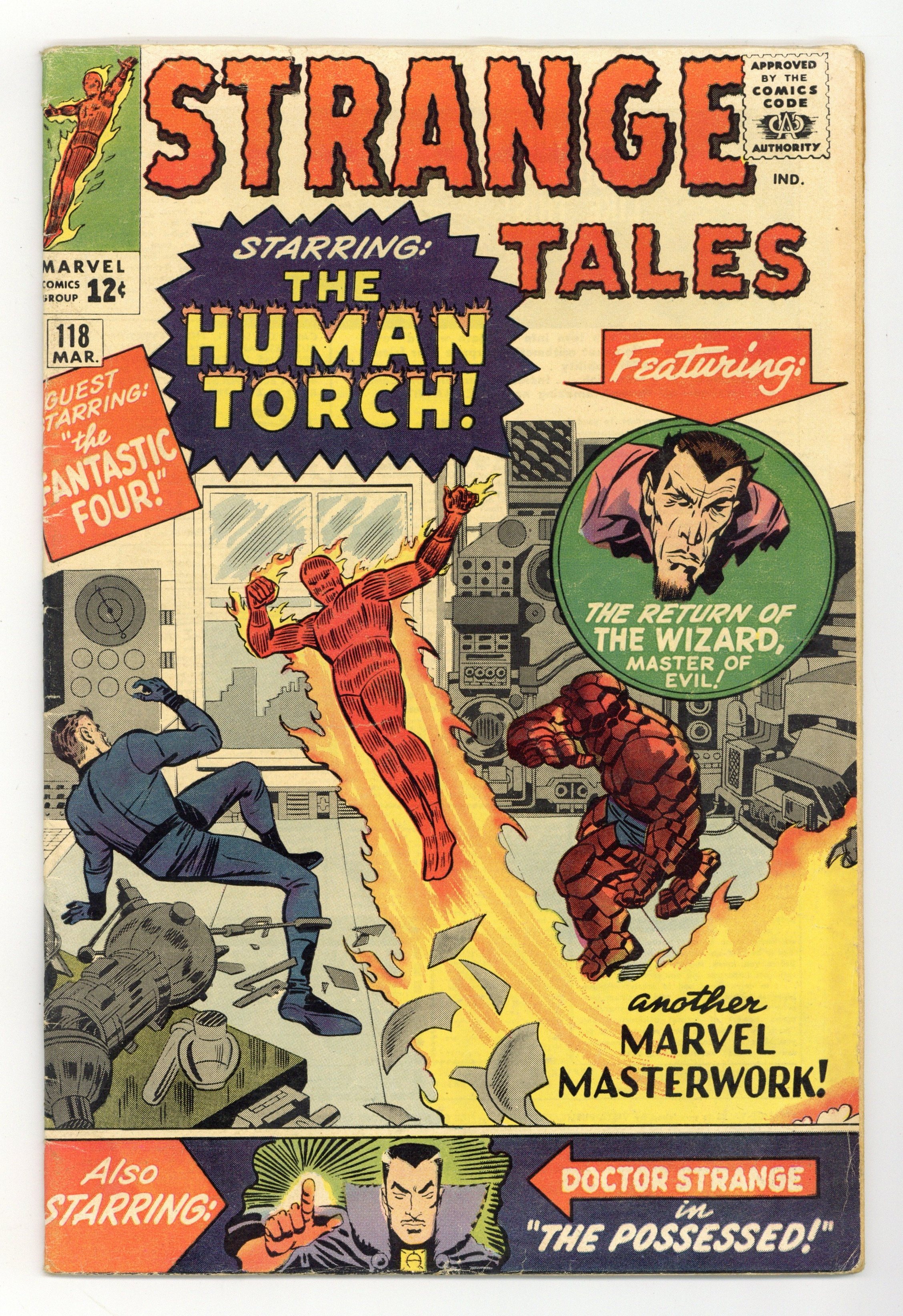 Cover pencils by Jack Kirby and Steve Ditko (inset), inks by Chic Stone and Steve Ditko (inset). "The Man Who Became the Torch!", script by Stan Lee (co-plot, script) and Dick Ayers (co-plot, un-credited), art by Dick Ayers; The Wizard breaks jail, and begins pulling crimes using a new anti-gravity flying device he's invented; Via trickery and disguise, he captures Johnny, then Sue, and begins impersonating Johnny, while planning bigger and bolder crimes with which to use his anti-gravity device. "The Weatherman" text story, art by Joe Maneely. "The Possessed!", script by Stan Lee and Steve Ditko (co-plot), art by Steve Ditko; Using his "Earthly Scanner," in which is a small replica of the planet, Dr. Strange senses evil somewhere in Bavaria; In a remote village, he finds the townspeople the victims of some strange form of possession, and believes a supernatural force is at work; First appearance of the Eye of Agamotto. 36 pgs., full color. Cover price $0.12.