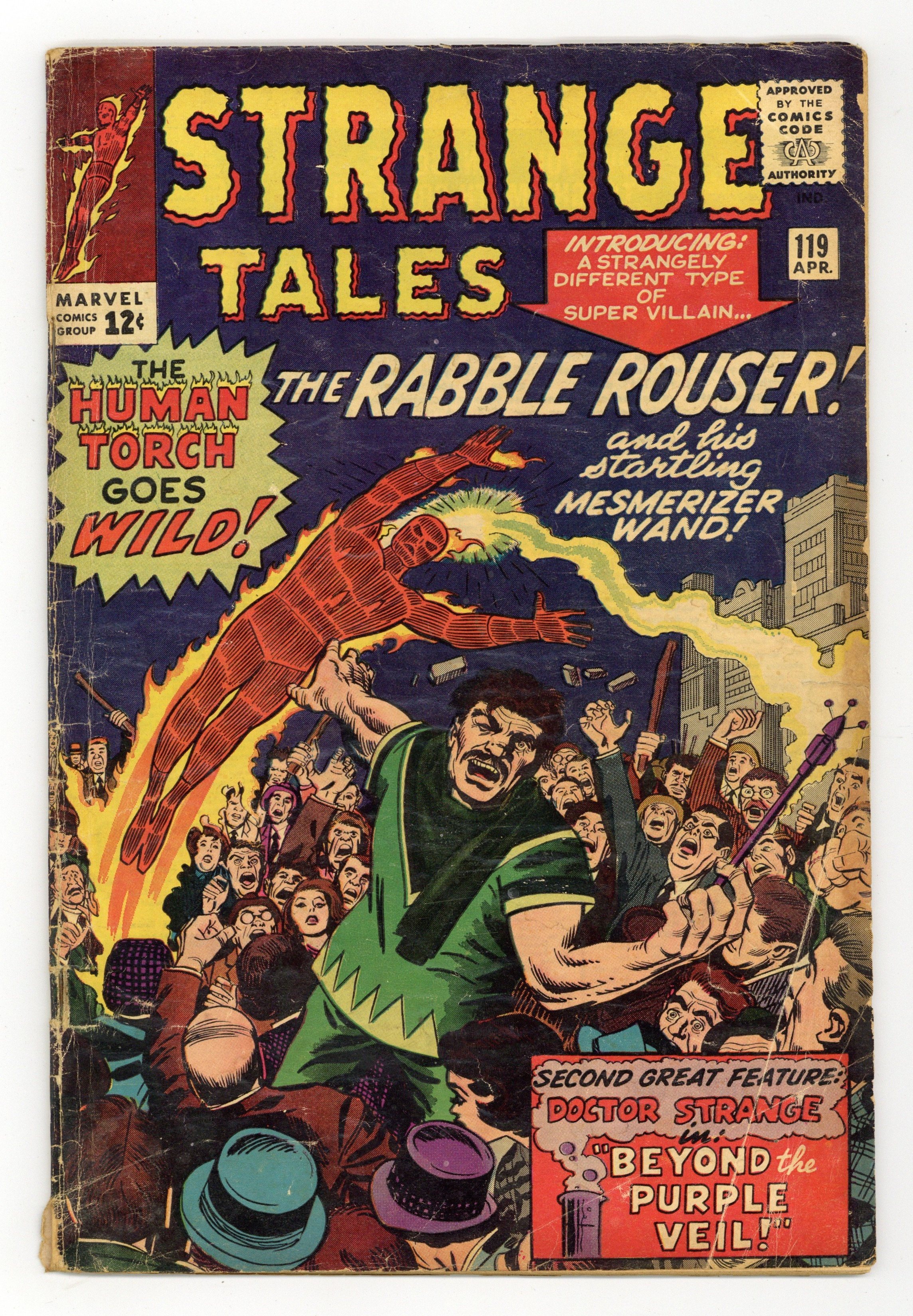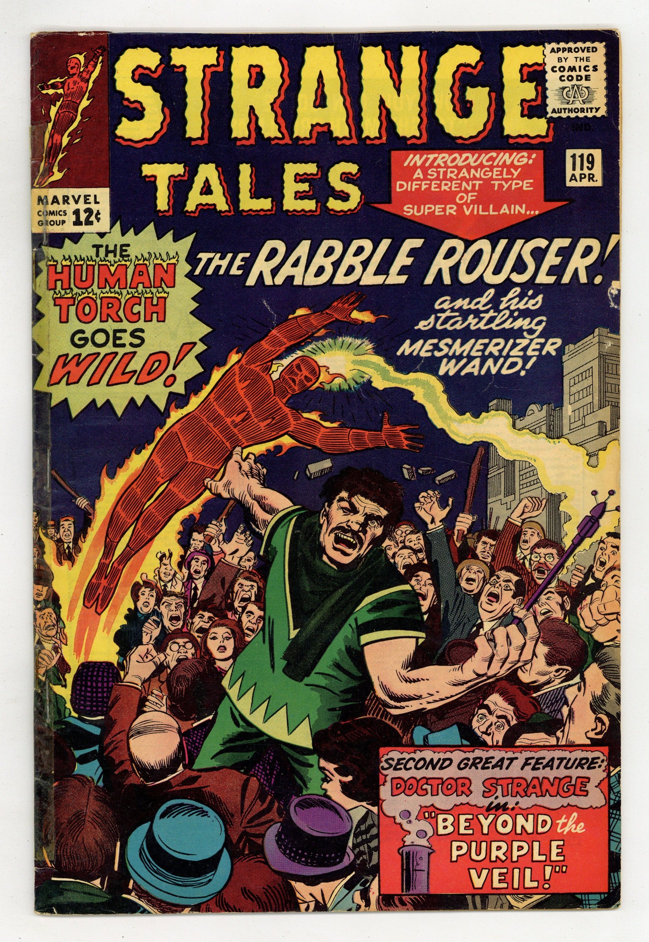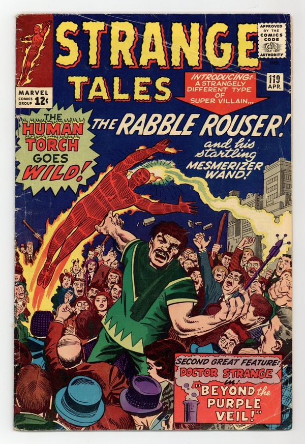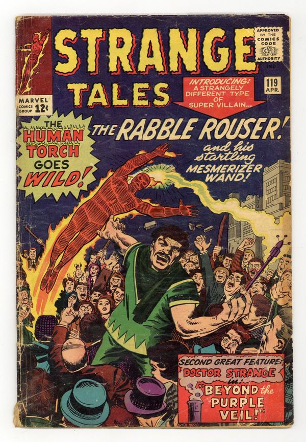 Cover pencils by Jack Kirby, inks by George Roussos. "The Torch Goes Wild!", script by Stan Lee (plot, script) and Dick Ayers (plot, un-credited), art by Dick Ayers; A demagogue drums up public opinion against the Torch, as part of a communist plot against an American ally; The Torch regains the public trust by stopping him and using his own mind control devices to turn him to the American side; Cameos by Spider-Man and the Fantastic Four. "Beyond the Purple Veil!", script by Stan Lee and Steve Ditko (co-plot), art by Steve Ditko; Doctor Strange must rescue two thieves who unwittingly steal a magic gem from him and are trapped in a mystical dimension as a result. (There is no text story in this issue.) 36 pgs., full color. Cover price $0.12.