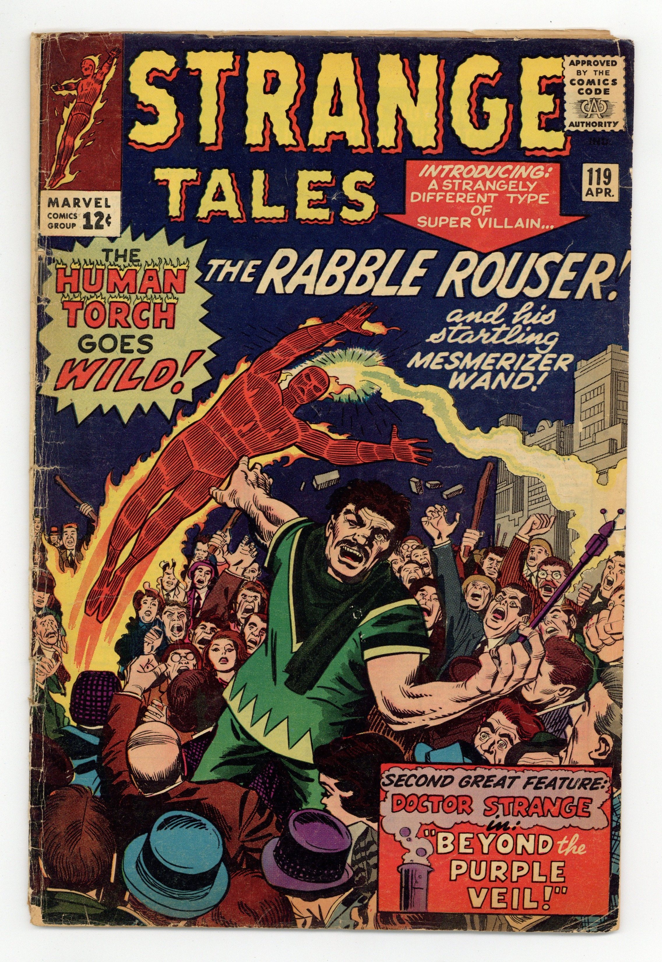 Starts Feb 2 Cover pencils by Jack Kirby, inks by George Roussos. "The Torch Goes Wild!", script by Stan Lee (plot, script) and Dick Ayers (plot, un-credited), art by Dick Ayers; A demagogue drums up public opinion against the Torch, as part of a communist plot against an American ally; The Torch regains the public trust by stopping him and using his own mind control devices to turn him to the American side; Cameos by Spider-Man and the Fantastic Four. "Beyond the Purple Veil!", script by Stan Lee and Steve Ditko (co-plot), art by Steve Ditko; Doctor Strange must rescue two thieves who unwittingly steal a magic gem from him and are trapped in a mystical dimension as a result. (There is no text story in this issue.) 36 pgs., full color. Cover price $0.12.