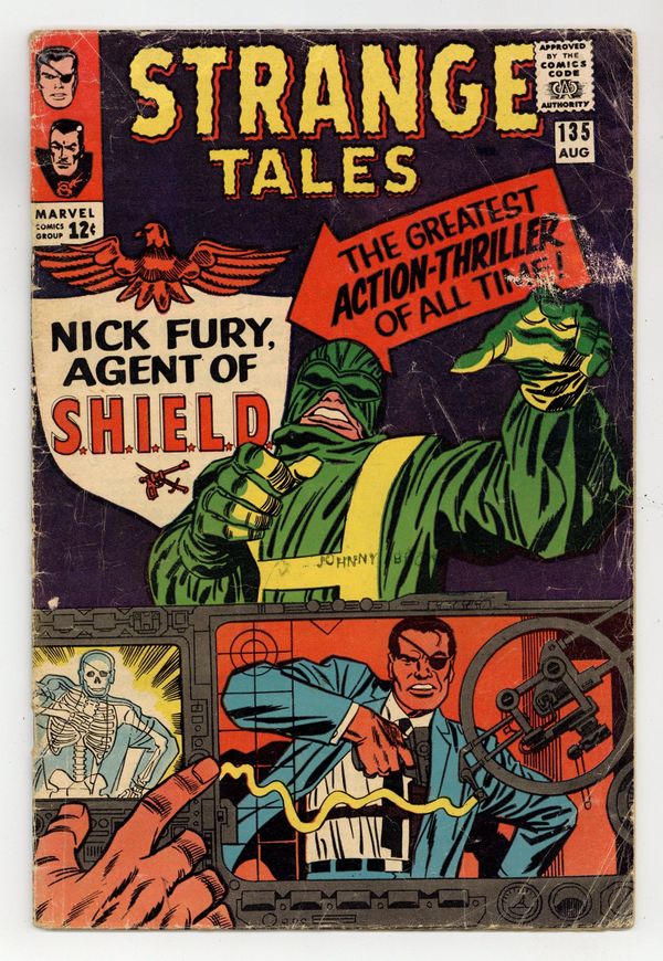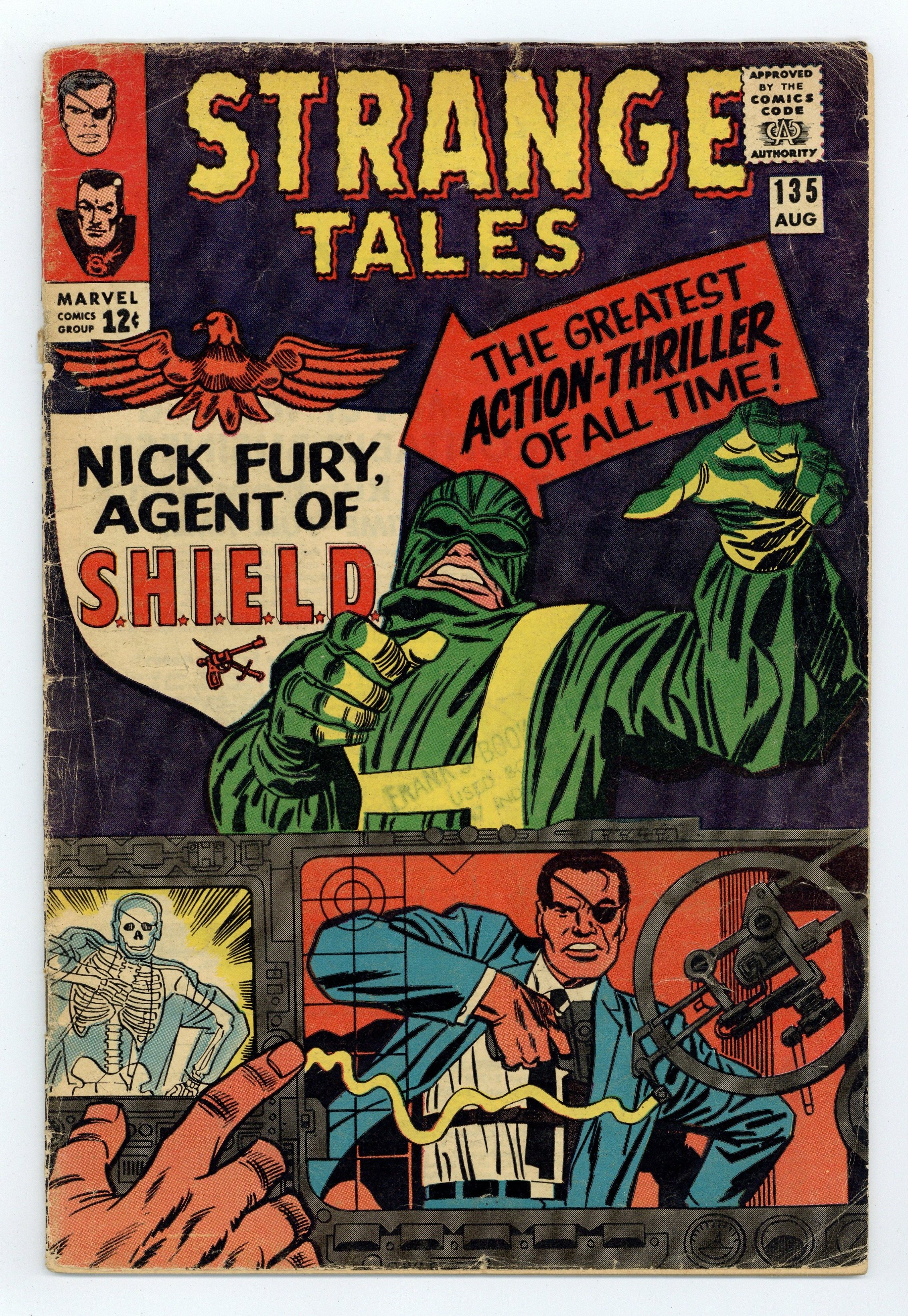Tags: Marvel Legacy Numbering: Doctor Strange (part 135)$68.00Cover pencils by Jack Kirby, inks by Frank Giacoia. "The Man for the Job!", script by Stan Lee and Jack Kirby (co-plot), pencils by Jack Kirby, inks by Dick Ayers; Nick Fury reports to the Pentagon, encountering Life Model Decoys: replicas of himself; He is driven in a gadget-filled car that converts to flying mode; Fury learns about SHIELD, an international organization whose job is to stop HYDRA, fanatics bent on world domination; Fury meets Tony Stark, in charge of SHIELD's weaponry, who tells Fury he was chosen to lead SHIELD. "Eternity Beckons!", script by Steve Ditko (plot) and Stan Lee (dialogue), art by Steve Ditko; In London, seeking info on "Eternity," Dr. Strange goes to the secluded home of Sir Baskerville, a former disciple of Mordo's, who greets him as an old friend; Meanwhile, Dormammu discovers that Clea set the Mindless Ones free and swears she will pay for her betrayal; Baskerville contacts Mordo, who sends an emissary to trap Strange but it backfires, allowing Strange to discover that Dormammu is the one behind Mordo's attacks and increased power. Notes: 1st S.H.I.E.L.D., 1st Hydra, 1st Nick Fury as agent of shield, 1st appearance of LMD (Life Model Decoy). 36 pgs., full color. Cover price $0.12.