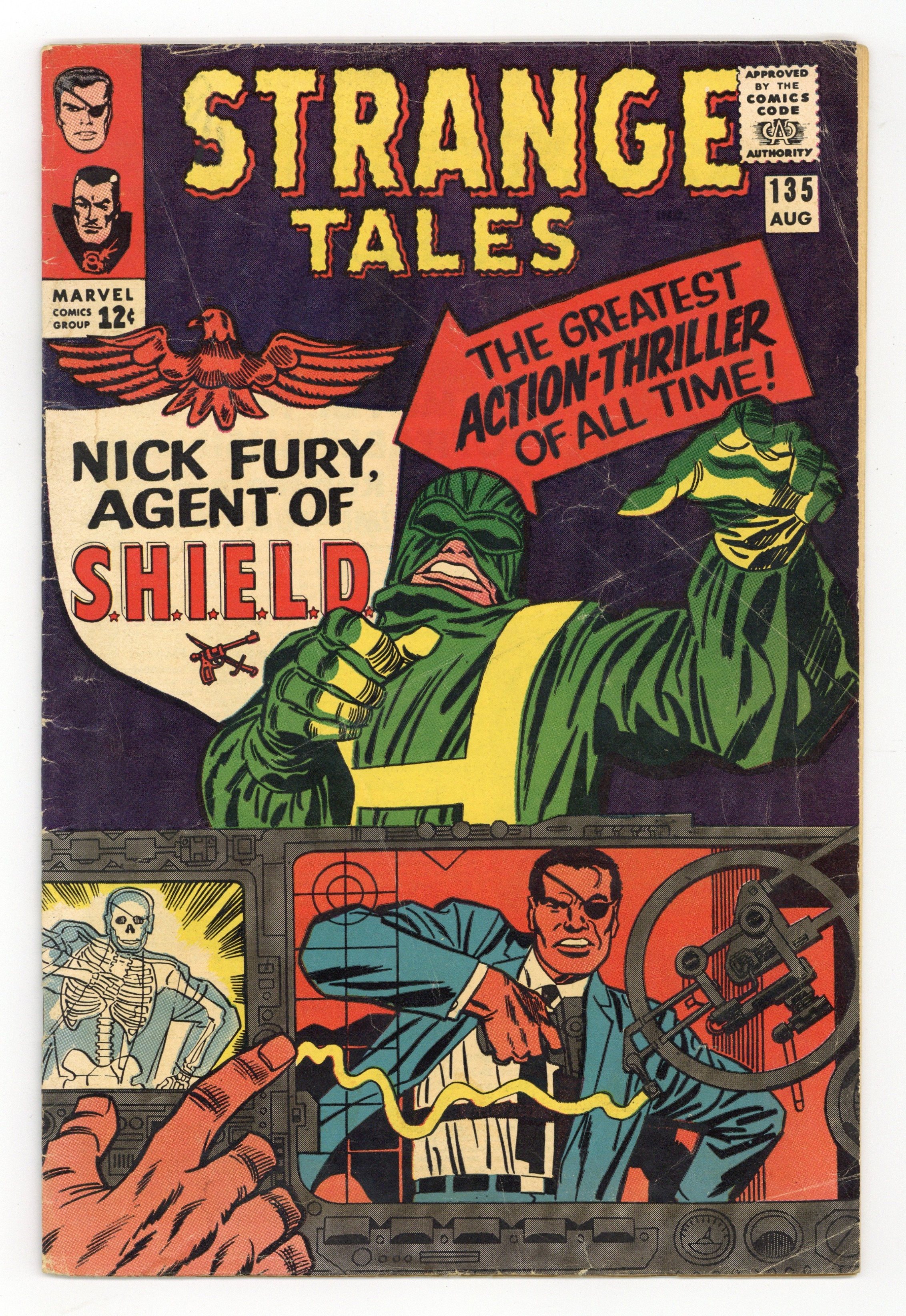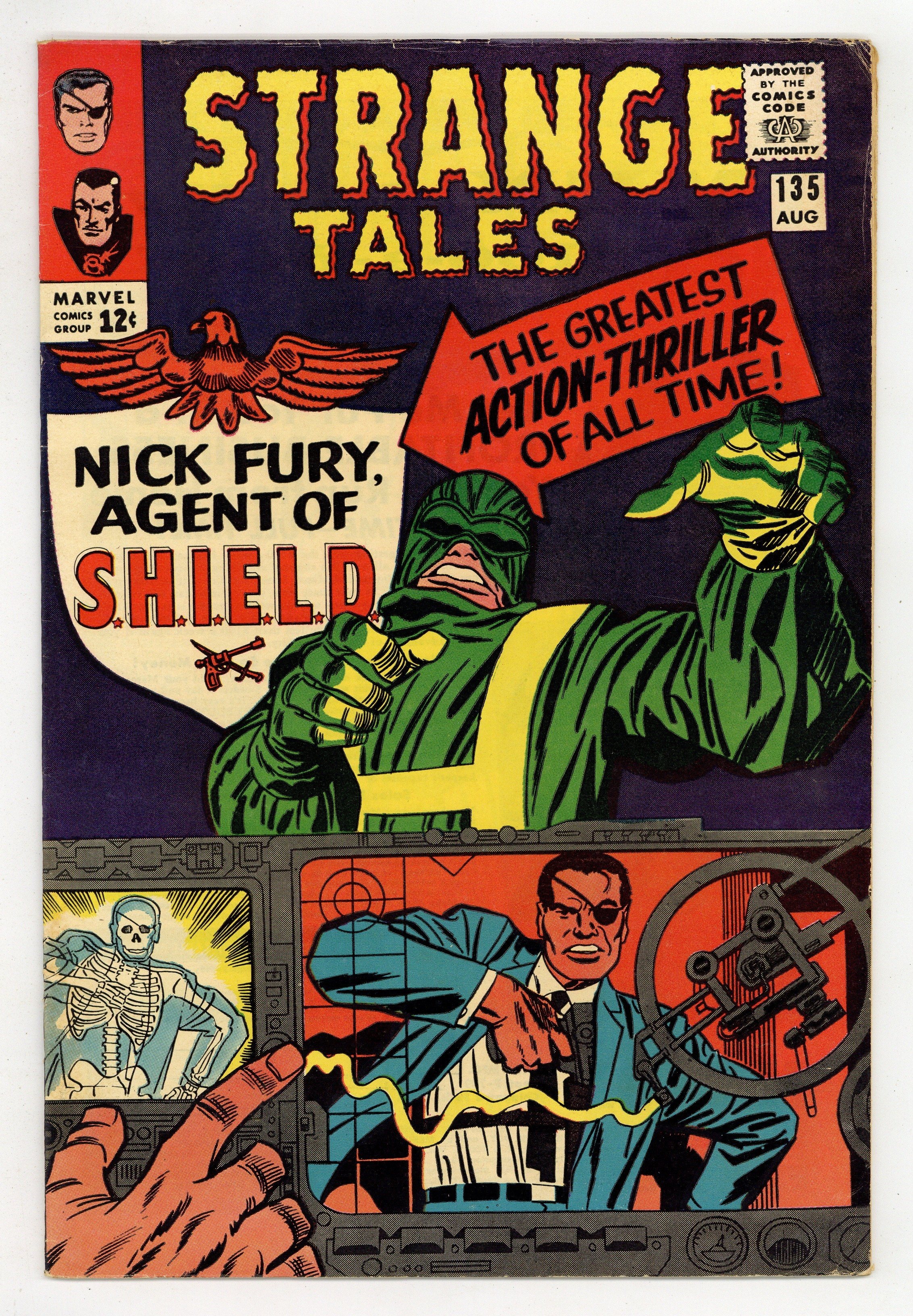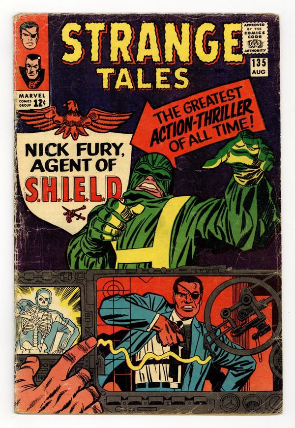 Cover pencils by Jack Kirby, inks by Frank Giacoia. "The Man for the Job!", script by Stan Lee and Jack Kirby (co-plot), pencils by Jack Kirby, inks by Dick Ayers; Nick Fury reports to the Pentagon, encountering Life Model Decoys: replicas of himself; He is driven in a gadget-filled car that converts to flying mode; Fury learns about SHIELD, an international organization whose job is to stop HYDRA, fanatics bent on world domination; Fury meets Tony Stark, in charge of SHIELD's weaponry, who tells Fury he was chosen to lead SHIELD. "Eternity Beckons!", script by Steve Ditko (plot) and Stan Lee (dialogue), art by Steve Ditko; In London, seeking info on "Eternity," Dr. Strange goes to the secluded home of Sir Baskerville, a former disciple of Mordo's, who greets him as an old friend; Meanwhile, Dormammu discovers that Clea set the Mindless Ones free and swears she will pay for her betrayal; Baskerville contacts Mordo, who sends an emissary to trap Strange but it backfires, allowing Strange to discover that Dormammu is the one behind Mordo's attacks and increased power. Notes: 1st S.H.I.E.L.D., 1st Hydra, 1st Nick Fury as agent of shield, 1st appearance of LMD (Life Model Decoy). 36 pgs., full color. Cover price $0.12.