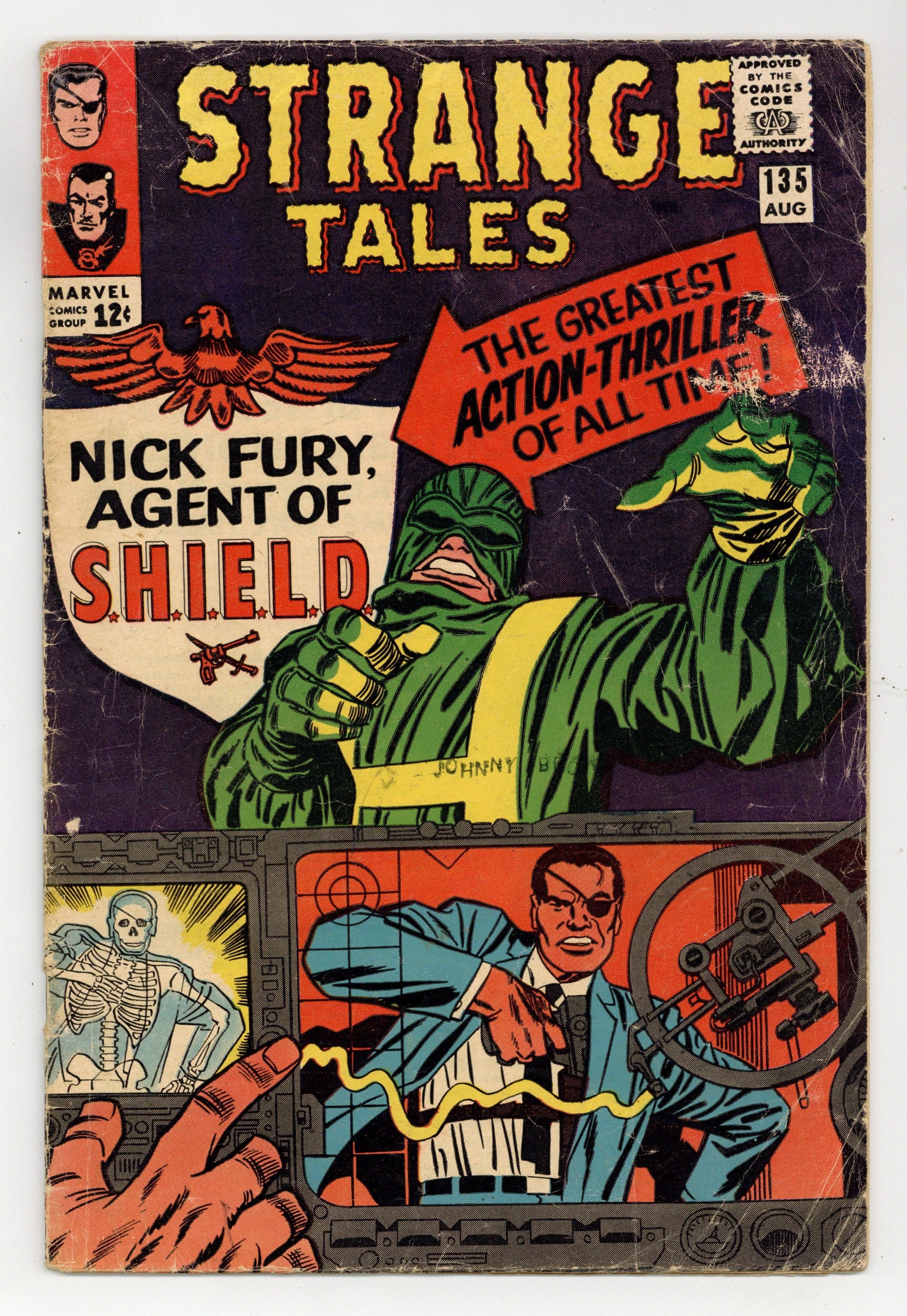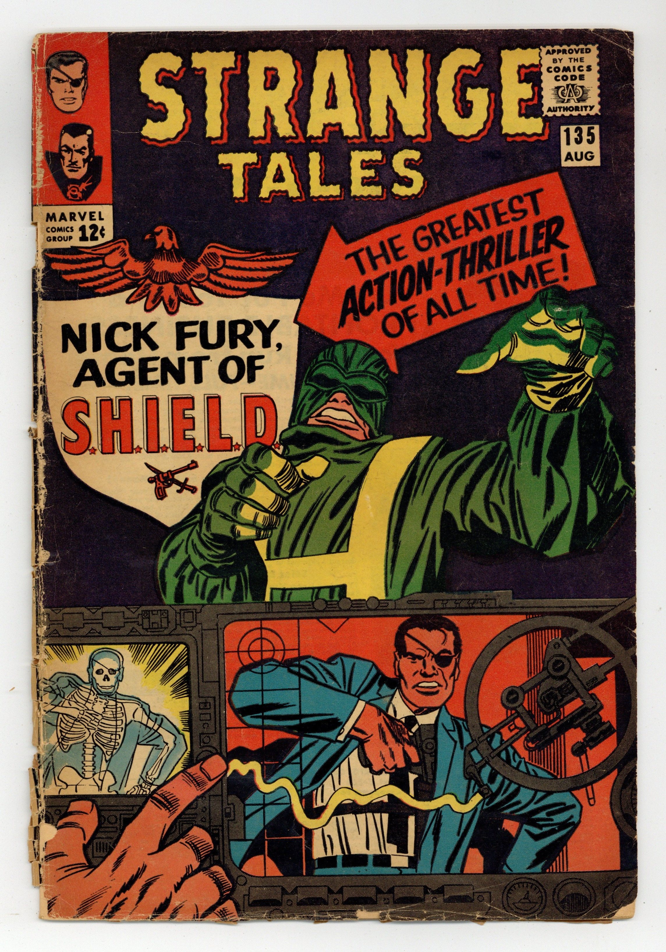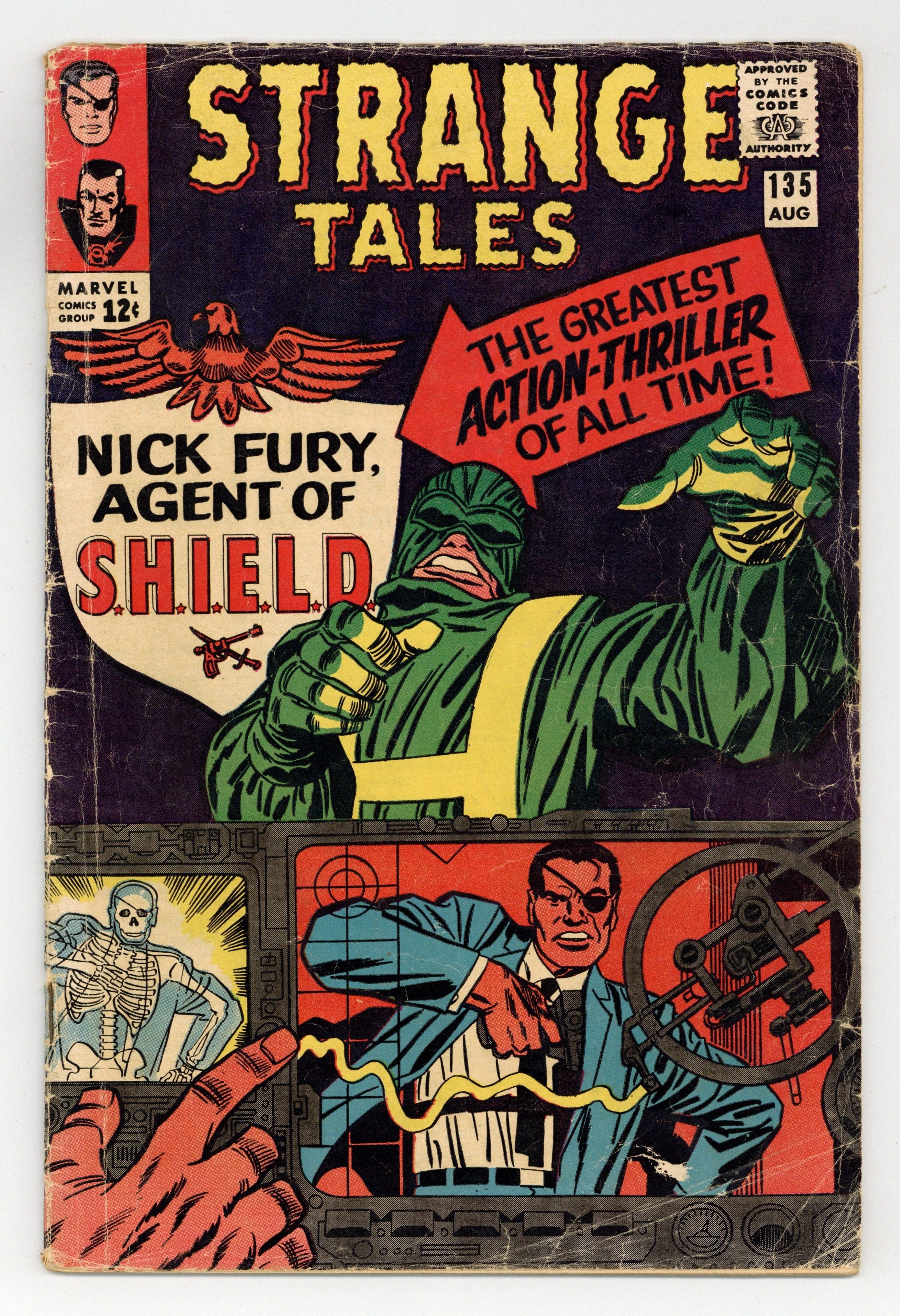 Cover pencils by Jack Kirby, inks by Frank Giacoia. "The Man for the Job!", script by Stan Lee and Jack Kirby (co-plot), pencils by Jack Kirby, inks by Dick Ayers; Nick Fury reports to the Pentagon, encountering Life Model Decoys: replicas of himself; He is driven in a gadget-filled car that converts to flying mode; Fury learns about SHIELD, an international organization whose job is to stop HYDRA, fanatics bent on world domination; Fury meets Tony Stark, in charge of SHIELD's weaponry, who tells Fury he was chosen to lead SHIELD. "Eternity Beckons!", script by Steve Ditko (plot) and Stan Lee (dialogue), art by Steve Ditko; In London, seeking info on "Eternity," Dr. Strange goes to the secluded home of Sir Baskerville, a former disciple of Mordo's, who greets him as an old friend; Meanwhile, Dormammu discovers that Clea set the Mindless Ones free and swears she will pay for her betrayal; Baskerville contacts Mordo, who sends an emissary to trap Strange but it backfires, allowing Strange to discover that Dormammu is the one behind Mordo's attacks and increased power. Notes: 1st S.H.I.E.L.D., 1st Hydra, 1st Nick Fury as agent of shield, 1st appearance of LMD (Life Model Decoy). 36 pgs., full color. Cover price $0.12.