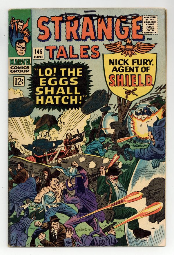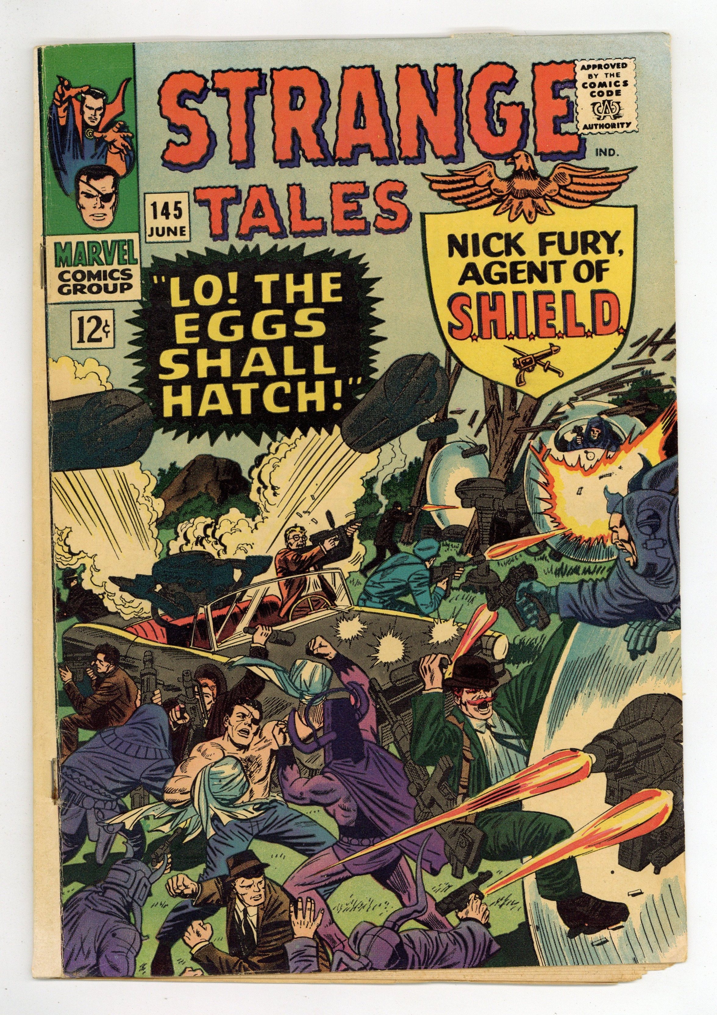 Cover pencils by Jack Kirby, inks by Mike Esposito. "Lo! The Eggs Shall Hatch!", script by Stan Lee and Jack Kirby (co-plot), pencils by Jack Kirby (layouts) and Don Heck, inks by Mike Esposito (as Mickey Demeo); SHIELD sends out a squad of Nick Fury LMD's attempting to track down his would-be assassin; Instead of capturing the LMDs, The Druid's eggs have been destroying them; SHIELD arrives at the site of an exploded egg which was a trap; Fury battles the Druid one-on-one, worried that his men will be targeted if he fails; THEM plot crossover with Tales of Suspense 78. "To Catch a Magician!", script by Steve Ditko (plot) and Denny O'Neil (dialogue), art by Steve Ditko; Mr. Rasputin, descendant of the original, amasses magical & scientific knowledge in his goal of world domination; Sensing an evil presence Doctor Strange finds Rasputin who soon realizes he cannot match Strange's magic and shoots him; A hospitalized Strange informs the police about Rasputin but when they fail to find him Strange realizes he may have taken refuge at his sanctum! 36 pgs., full color. Cover price $0.12.