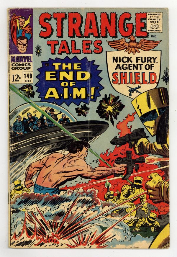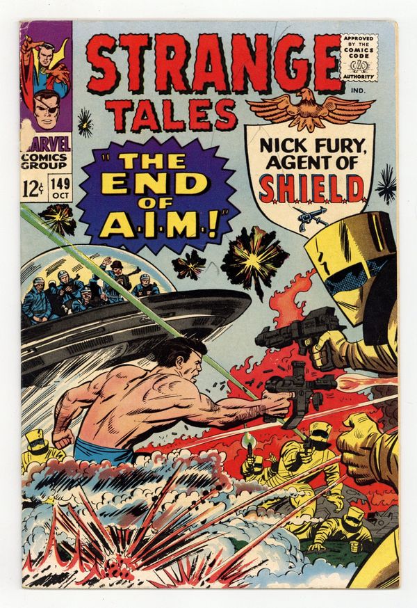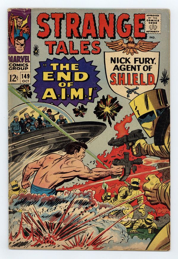 Tags: Marvel Legacy Numbering: Doctor Strange (part 149)$7.20Cover pencils by Jack Kirby, inks by Mike Esposito. Nick Fury stars in "The End of A.I.M.!", script by Denny O'Neil and Jack Kirby (co-plot), pencils by Jack Kirby (layouts) and Ogden Whitney, inks by Ogden Whitney; A.I.M. agents steal an LMD which turns out to be the real Nick Fury; The Heli-Carrier is on high-alert after Fury's leap and Sitwell plants a tracer on Count Royale as he rushes out; A pair of fleeing A.I.M. agents are met by one of the Secret Empire, which is a branch of "THEM"!; The A.I.M. men are gassed unconscious by Gabe Jones working undercover; Jasper trails Royale to A.I.M.'s hidden base just before it explodes; Some elements of the plot cross over with Tales to Astonish 82-85 and Tales of Suspense 79-84. Fantastic Four ad. "If Kaluu Should Triumph...", script by Denny O'Neil and Bill Everett (co-plot), art by Bill Everett; After 500 years of exile in the Nameless Dimension Kaluu returns to destroy his former friend, The Ancient One; Sealing Strange's sanctum in an impenetrable barrier which not even Strange's ectoplasmic form can pass he summons the Demons Of Danak, other-dimensional monsters, to attack; Knowing they cannot be stopped while in contact with their master, Strange & his mentor wait until the creatures penetrate the barrier. Merry Marvel Marching Society info and coupon. 36 pgs., full color. Cover price $0.12.