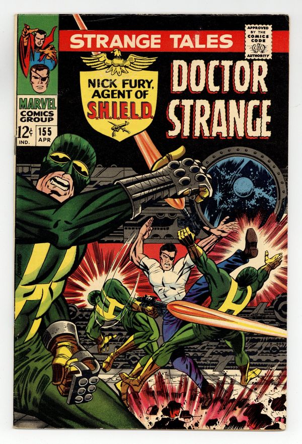 Tags: Marvel Legacy Numbering: Doctor Strange (part 155)$28.00Cover art by Jim Steranko. "Death Trap!", script and art by Jim Steranko; The Heli-Carrier takes on a number of VIP's, as well as Prof. Trojak and his "Q-Ray" for a demonstration; But Trojak is really a HYDRA agent, and his oversized machine has been used to smuggle several HYDRA thugs aboard!; In addition to these dangers, Fury must also cope with his 3 best friends, who've been hypnotized to kill him; Fury manages to save the day, and an injured, unconscious Laura is found hidden in the computer room, wearing a HYDRA outfit; President Lyndon B. Johnson cameo. "The Fearful Finish--!", script by Stan Lee and Marie Severin (co-plot), art by Marie Severin; Doctor Strange races the bolt of death and barely manages to save Clea's life; Together they race thru one dimension after another, until The Ancient One answers Strange's call for help and guides them to Earth; Feeling there is no other way to protect her, Strange's mentor uses the "Spell of Vanishment" to send Clea to an unknown place of safety; Appearance by Umar; Clea vanishes and does not return until Doctor Strange 172. 36 pgs., full color. Cover price $0.12.