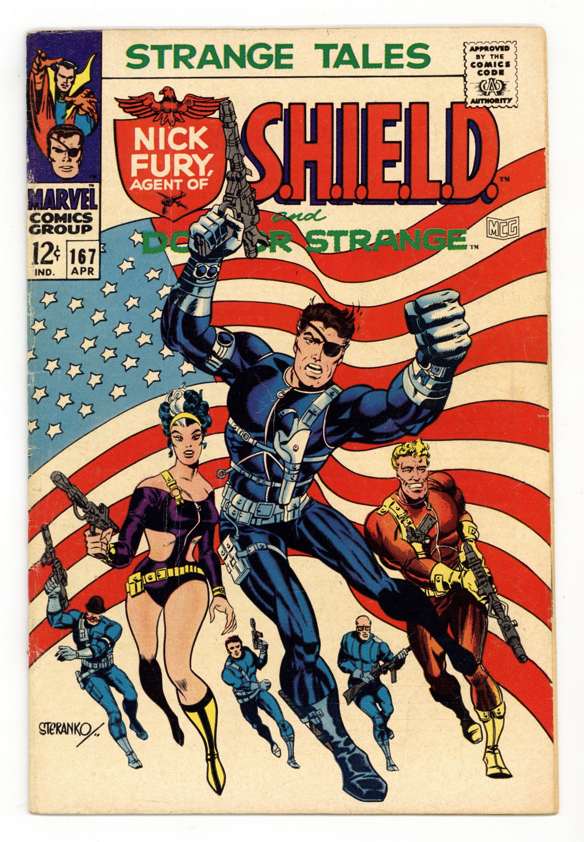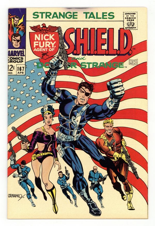 Cover art by Jim Steranko. Nick Fury stars in "Armageddon!", script and pencils by Jim Steranko, inks by Joe Sinnott; While Jimmy Woo cradles the body of Suwan in his arms a SHIELD Suicide Squad bursts in via The Dreadnought, a colossal tunneling machine; The Claw vanishes but Fury uses a Pseudo-Elliptoid Wrist Tracer to find him, but arrives just as the villain escapes into the Space-Time Continuum in an Infinity Sphere; Fury finds a Prototype Warp-Vest and follows The Yellow Claw as they have a psychic duel. "This Dream—This Doom!", script by Dennis O'Neil and Dan Adkins (co-plot), art by Dan Adkins; The Ancient One is alive and tells Strange he made Zom believe he was dead so he could pass on his powers to his disciple; With the Cosmic Balance restored he was able to shatter the spell that bound him; In his Himalayan retreat Strange and the Ancient One discover that Victoria Bentley is a prisoner in the Dimension of Dreams; Using a mystic gem and with his mentor to mentally guide him Strange travels to Victoria. Ad for Not Brand Echh and Daredevil. Statement of ownership--average print run 428.603; average paid circulation 241,561. 36 pgs., full color. Cover price $0.12.