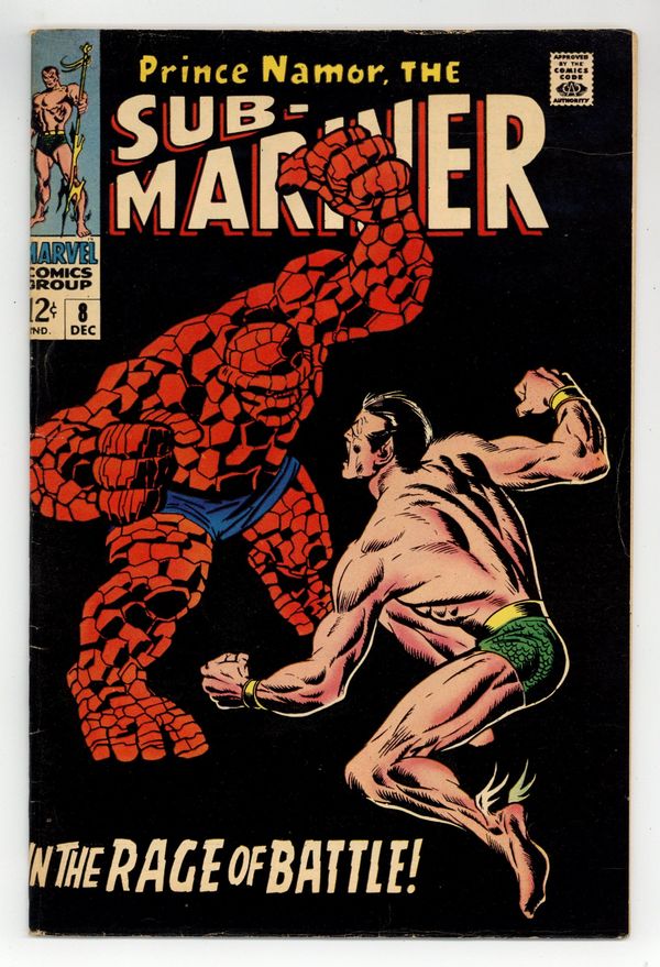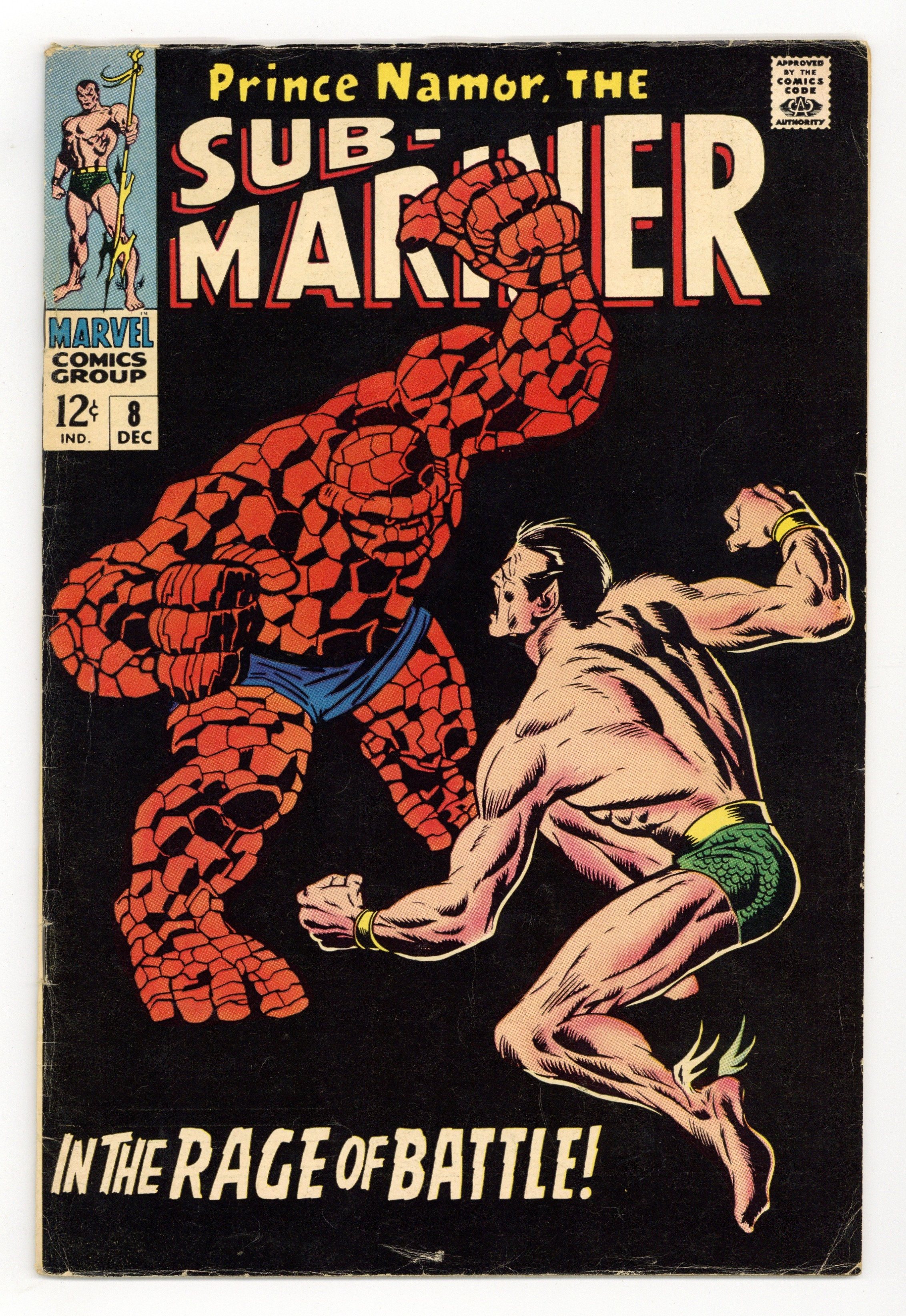 Starts Dec 15 1st Printing. "In the Rage of Battle!" Guest-starring the Thing. Written by Roy Thomas. Art by John Buscema and Dan Adkins. It's the heavyweight bout for the championship as the Savage Sub-Mariner clashes with the ever-lovin' blue-eyed Thing! 36 pages, full color. NOTE: 1994 JC Penney reprint exists. Can be identified by having a Stridex ad on the back cover. Cover price $0.12.